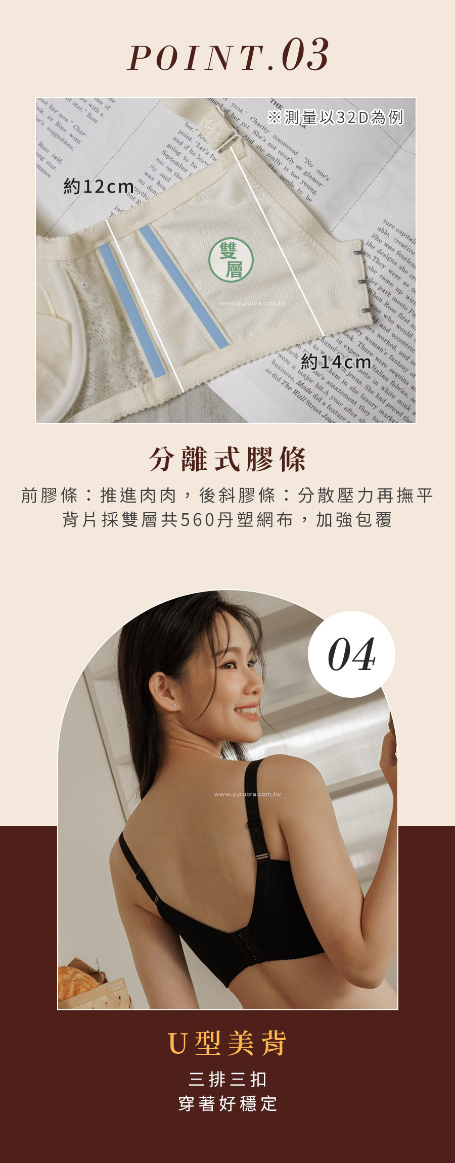 ★Almost full-coverage with large stretch lace, fully enveloping the bust. ★Side panels raised to completely gather and secure side and back bulges, keeping everything in place. ★Removable push-up pads for enhanced fullness, easily adjustable for uneven sizing. ★Underarm split dual adhesive strips reinforce stability and fit. ★Double-layer mesh back panels for breathable comfort and smoothing support. ★U-shaped back design with triple hooks enhances back curves while ensuring stability. ★Proudly made in Taiwan for guaranteed quality.