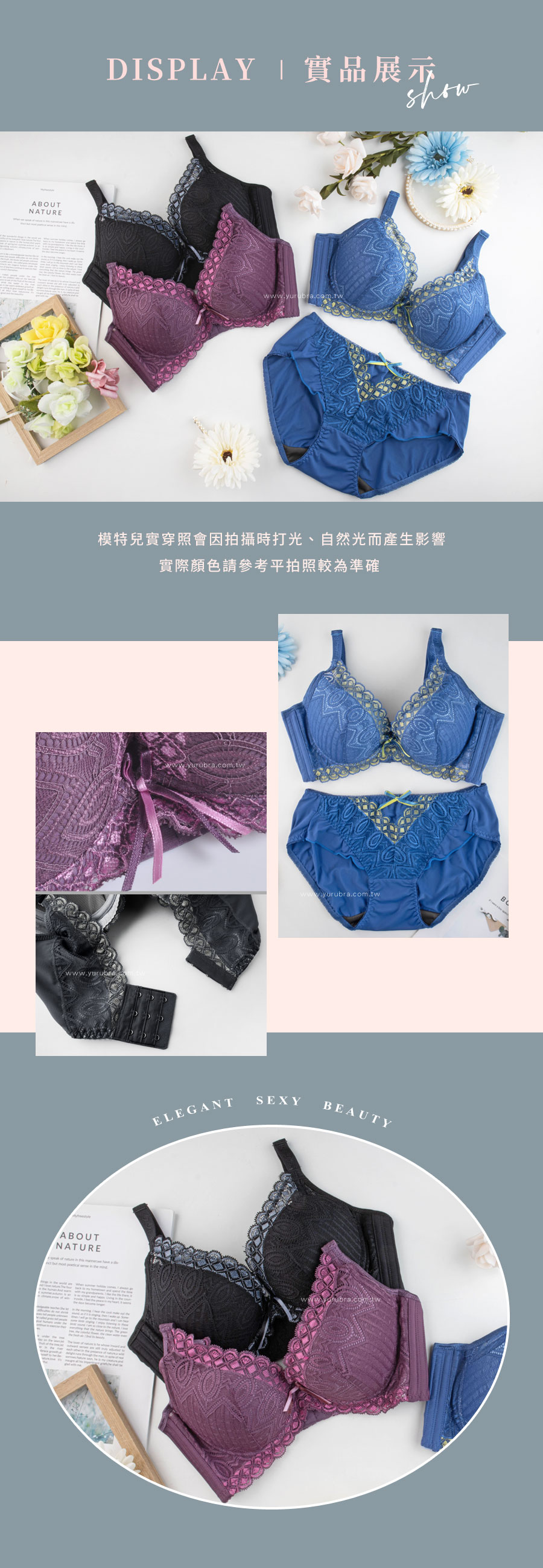 ★玉如阿姨推出大深溝蕾絲美背的最新款!前面是低脊心性感設計的款喔 ★這款設計成前後都是V字曲線,讓你前面性感,後面美麗 ★舒適軟鋼圈,降低鋼圈的束縛感,忙碌一整天也不感到壓迫 ★紫色蝴蝶蕾絲,搭配胸前邊緣V字滾邊,展現你的深溝魅力曲線 ★副乳側壓片設計,加強副乳推進能力 ★後背加高至19.5公分!!完完全全撫平背肉 ★後背搭配大V字蕾絲,不只機能好且又漂亮,是現在內衣的新趨勢 ★內裡採用竹炭材質布料,接觸肌膚非常舒適 ★內褲也非常漂亮喔還有可愛的小蝴蝶結 ★台灣製造,品質保證 | ||