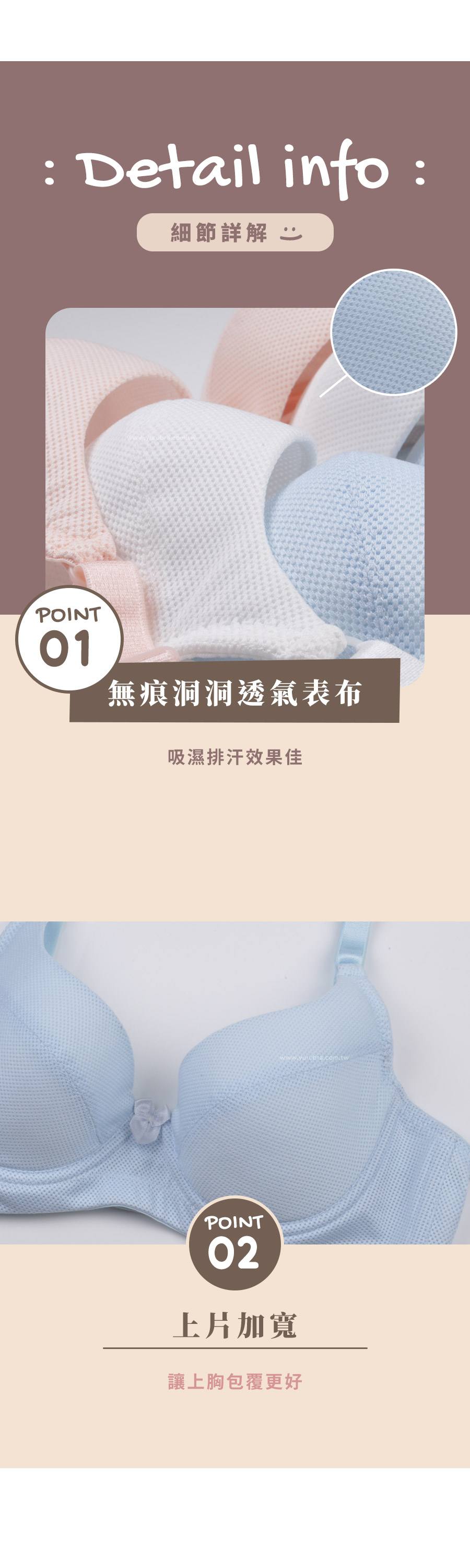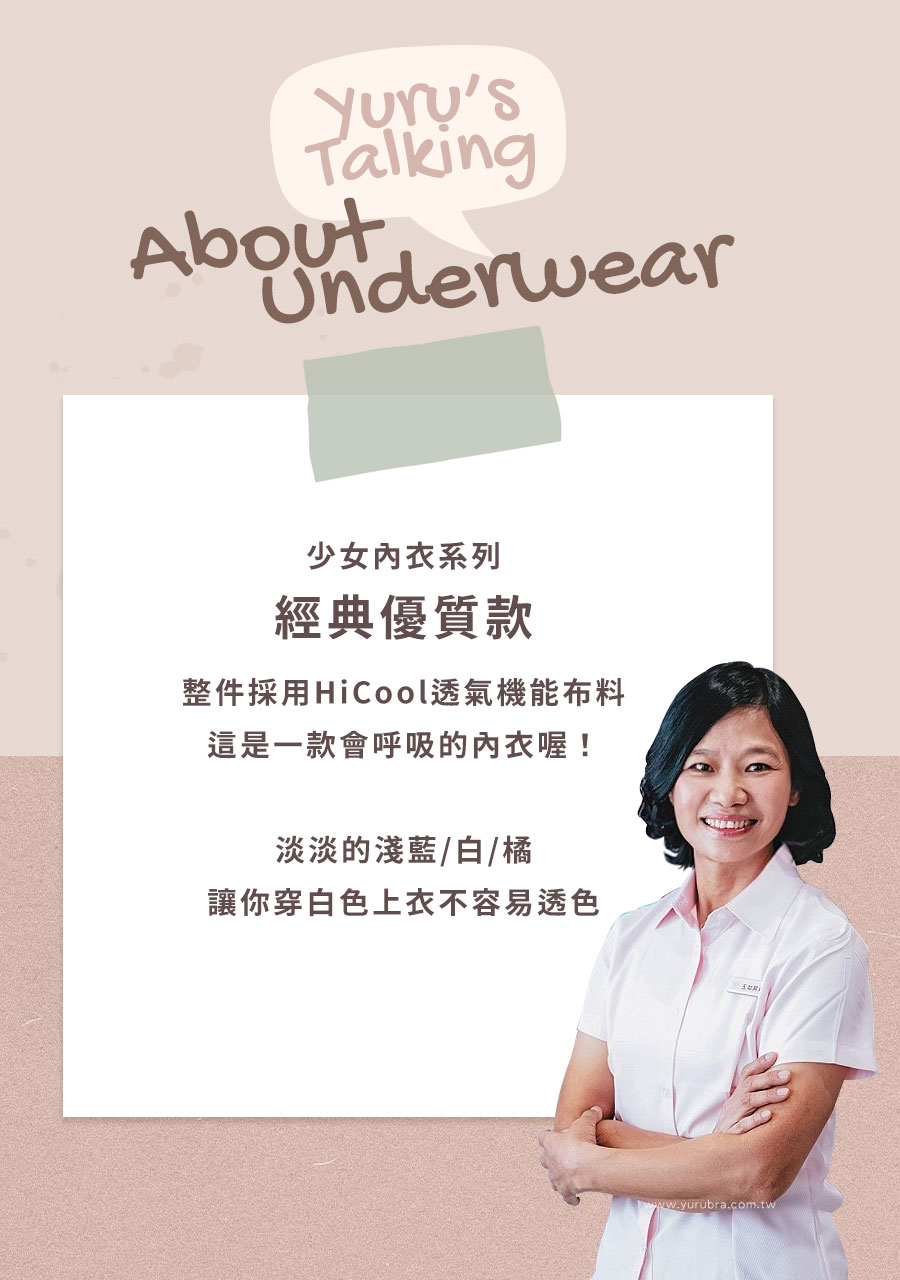 ★這是一款會呼吸的內衣喔!非常舒適好穿~少女內衣最新優質款 ★選用最不容易透色的淺藍/白/橘,讓你穿白色上衣也不容易透色 ★整件內衣布料都是採用HiCool透氣機能素材布料,非常好穿 ★內衣罩杯上片更加高加寬,增加罩杯上緣的包覆性 ★內衣下圍採用彈力鬆緊帶,好穿不死緊,無壓迫感 ★後背是三排兩扣,輕鬆好穿脫 ★台灣製造,品質保證