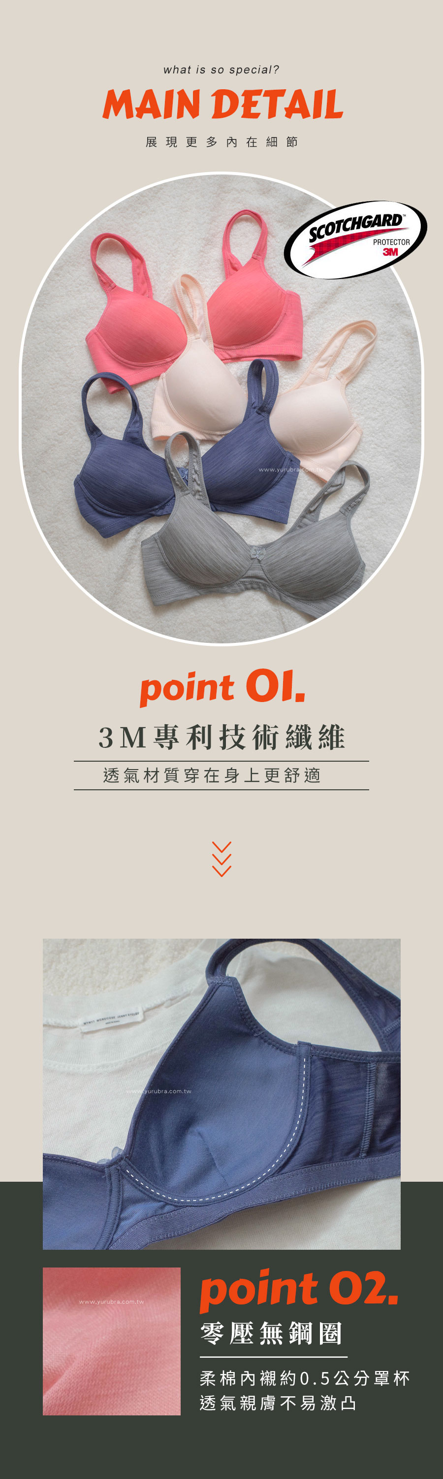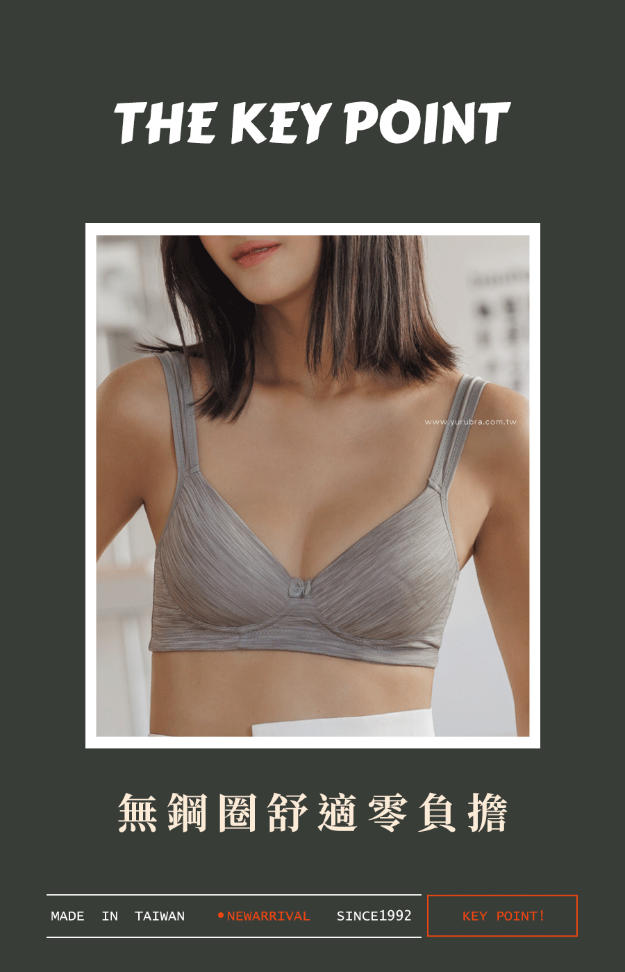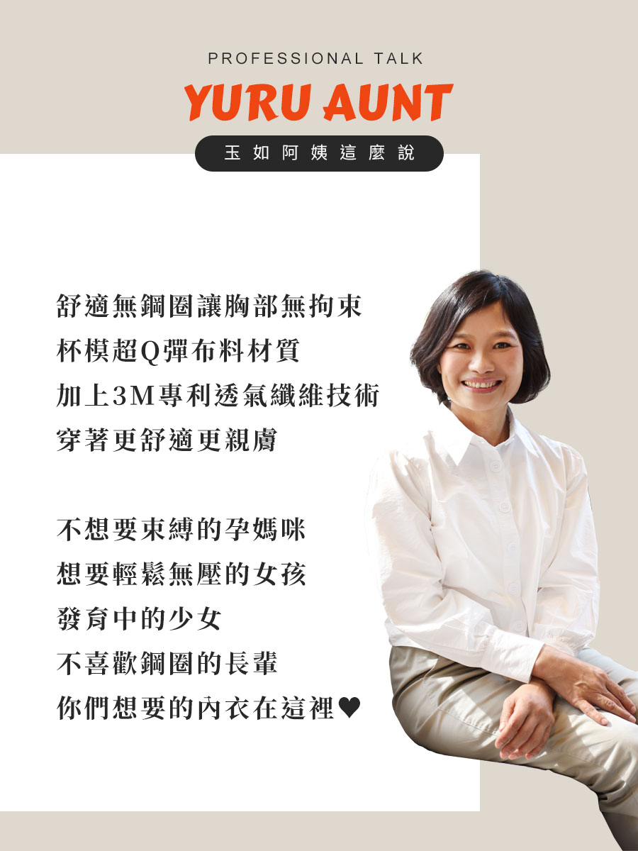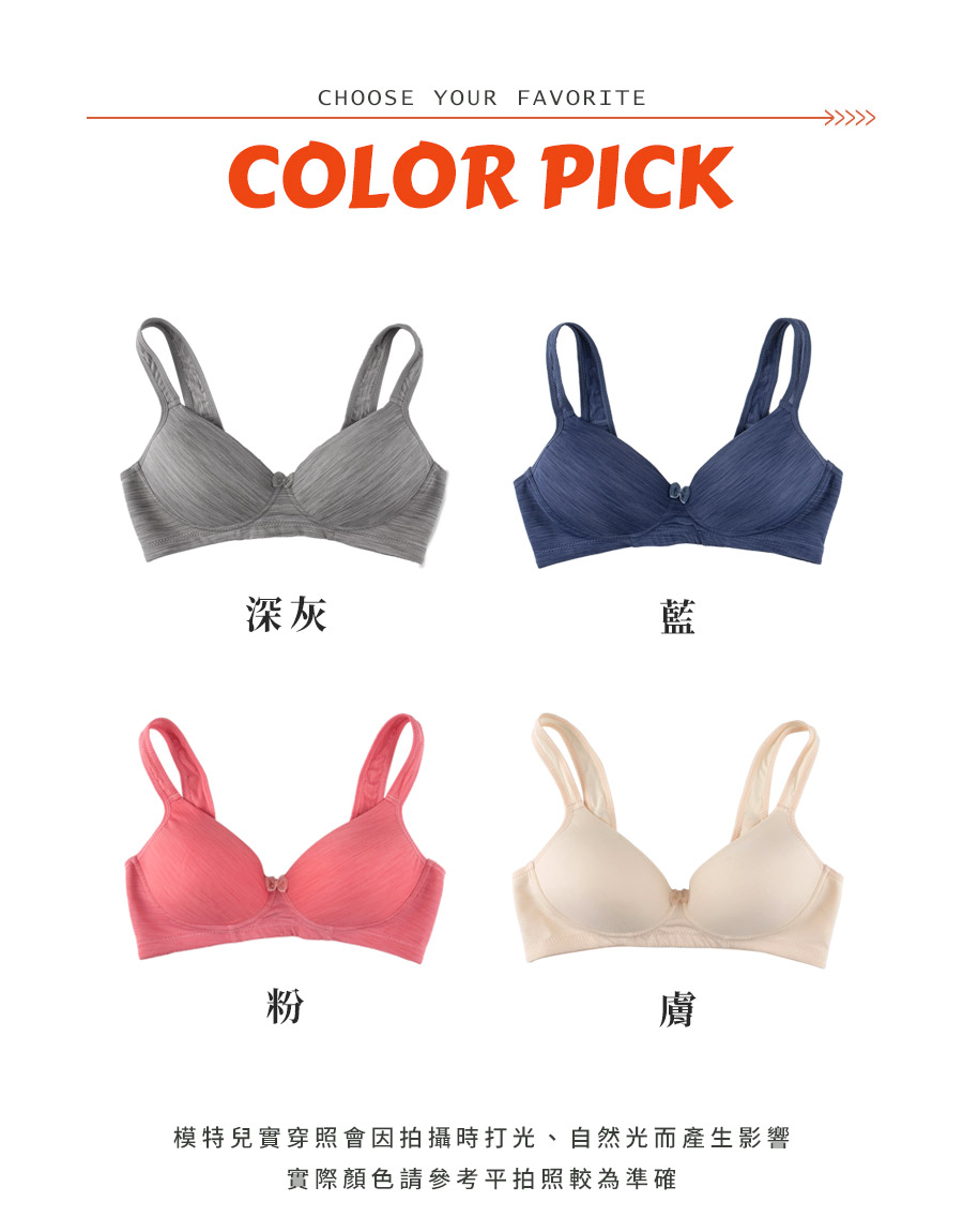 ★無鋼圈舒適內衣,未來內衣的新主流趨勢之一 ★大家對於胸部的健康越來越重視,無鋼圈讓胸部更無拘束喔! ★內衣杯模採用超Q軟的布料材質,完全無壓迫感 ★採用3M專利的透氣纖維技術,布料更舒適更親膚 ★完全無鋼圈,內衣下圍使用布邊,一樣能穩定下胸喔 ★內襯採用柔綿,呵護你最親密的肌膚,不易產生激凸 ★後背採用大U背心式美背,加高穩定背部背肉 ★台灣製造,品質保證