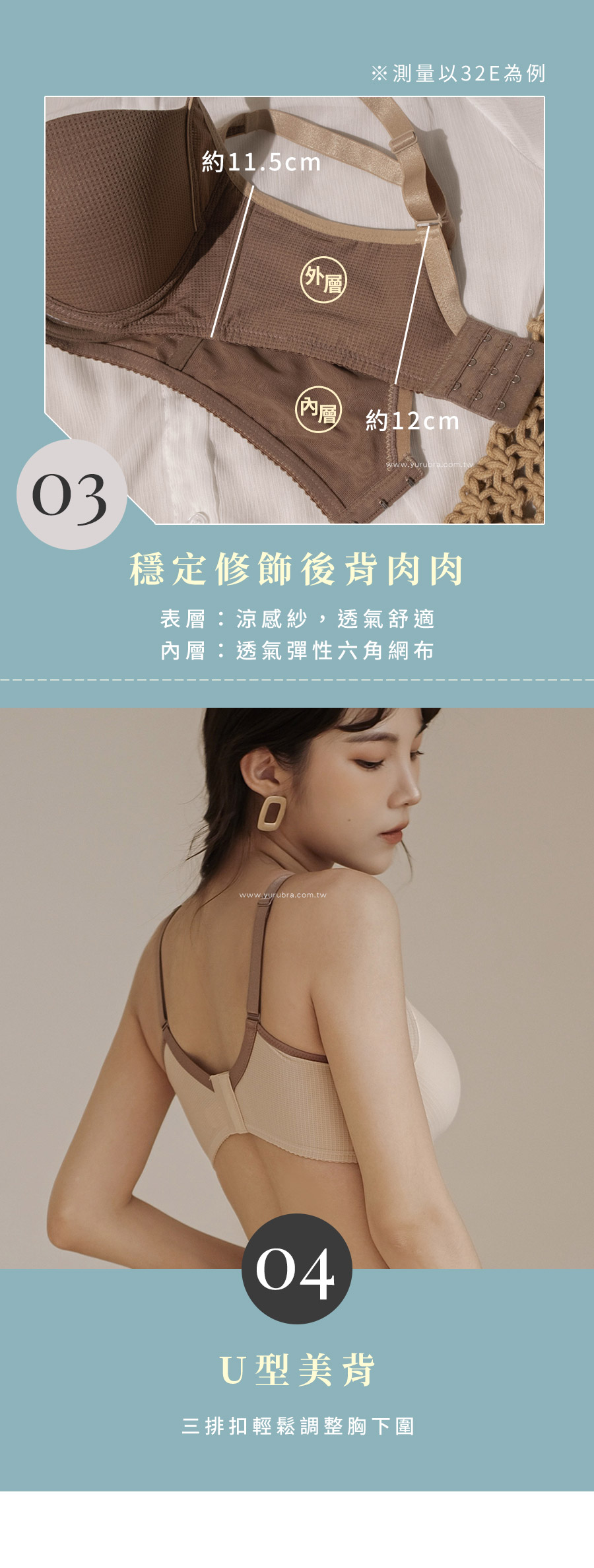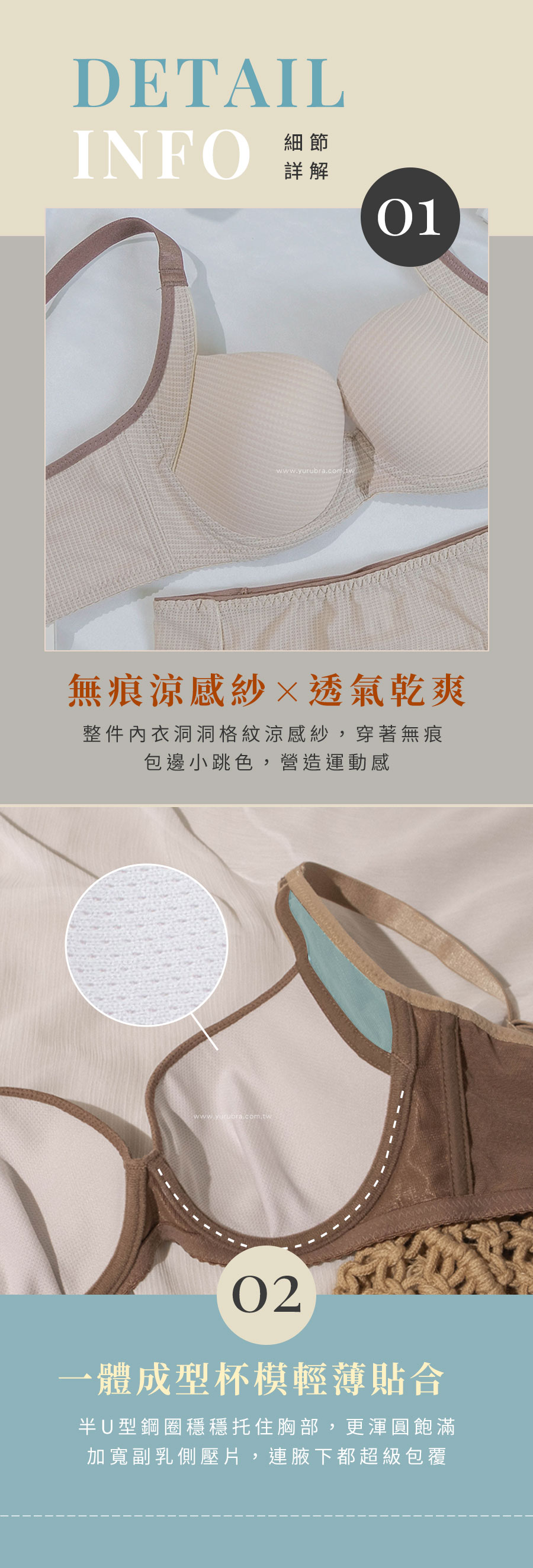 ★整件內衣都是洞洞格紋涼感紗,視覺有變化穿著顯無痕 ★撞色運動風設計,不經意的外露也不突兀唷 ★3/4罩一體成型杯模,輕薄柔軟不易激凸 ★上緣均薄約0.2公分貼合度超好,扁寬胸型也適合唷 ★半U型鋼圈輕鬆hold住整個胸部 ★加寬副乳側片,腋下副乳也能輕鬆修飾 ★雙層約280單背片穿著透氣舒適,輕機能包覆修飾 ★U型美背+三排三扣,穩定並修飾後背肉肉 ★台灣製造,品質保證