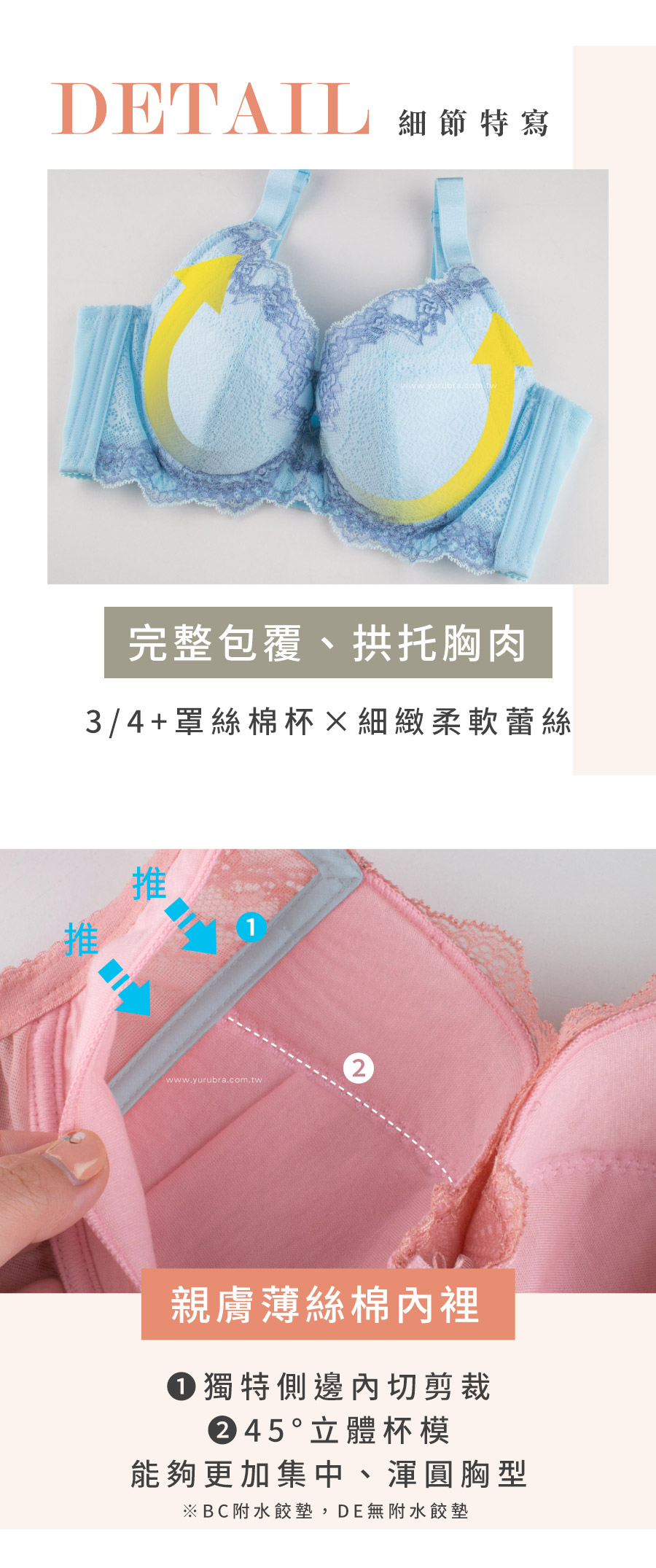 BCDE罩:絲棉襯墊約0.5公分 BC罩附可卸式水餃墊,DE沒有附可卸式水餃墊 | ||