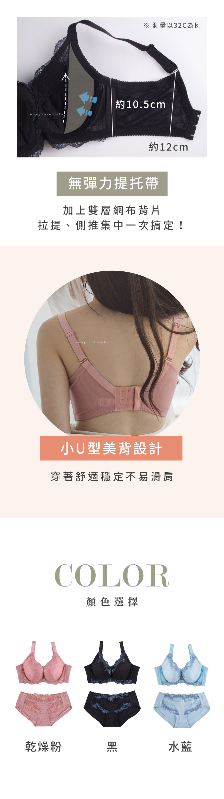 ★暢銷款新色來啦!水藍、黑、乾燥粉,能輕鬆變換魅力風格 ★波浪狀蕾絲,觸感細膩,久看、久穿都不膩呢♥ ★3/4+罩的杯模,能完整包覆、拱托胸肉 ★內裡親膚薄絲棉,柔軟、透氣不易悶熱 ★獨特內切剪裁及3D杯模設計,能更加集中、渾圓! ★無彈力提托帶,能上拉提並強力側推防外擴 ★側邊雙膠條,撫平腋下肉肉兼具穩定 ★雙層網布背片設計,穿著乾爽透氣 ★小U型美背設計,穩定舒適又不易滑肩 ★台灣製造,品質保證
