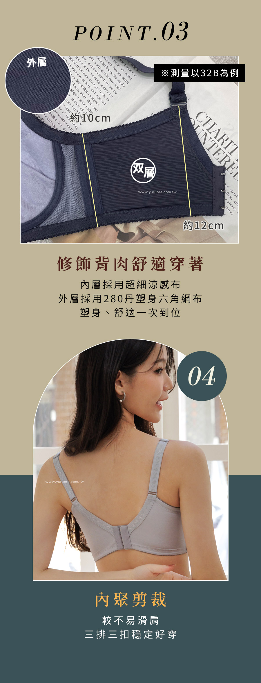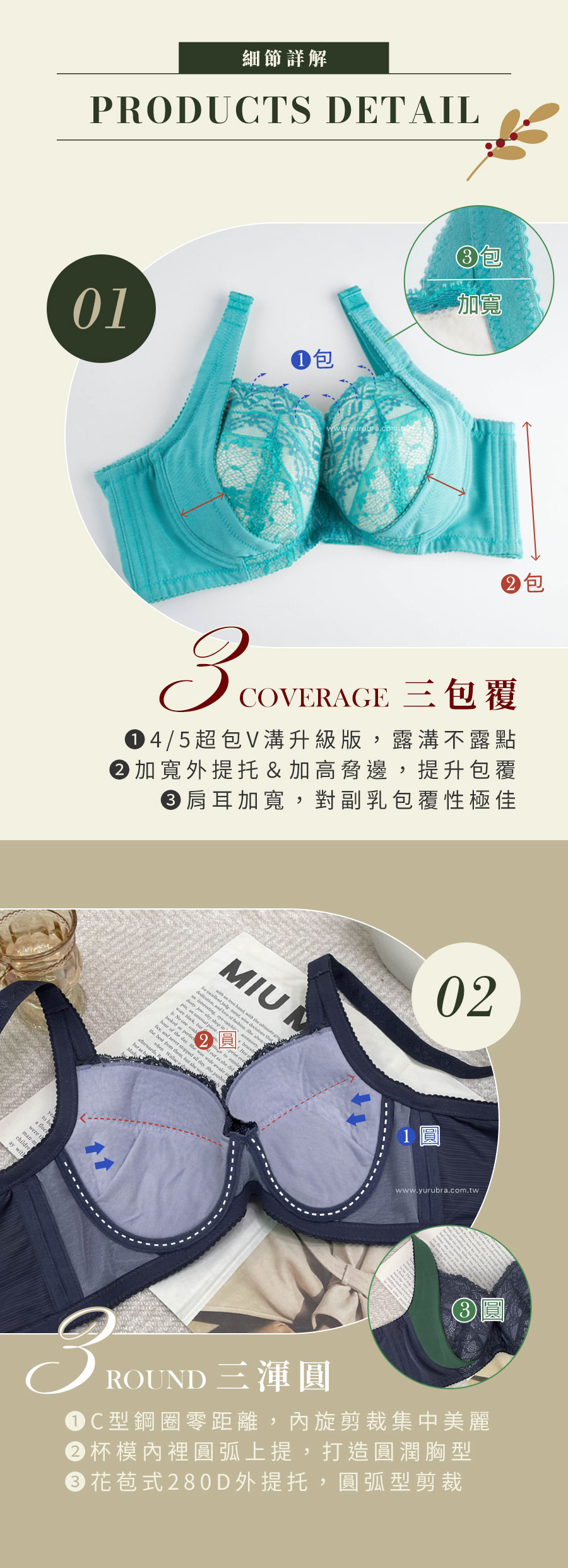★媲美甚至超越目前的熱銷機能款!穿了不後悔的機能內衣 ★囊括三包&三圓六大特性,打造渾圓飽滿胸型 ★4/5超包V溝升級版,露溝不露點,性感又自在 ★花苞式280D加寬外提托帶,防止外擴包覆性佳 ★副乳延伸並加寬到3.5CM以上的六角網布,副乳通通包進來 ★C型鋼圈零距離設計,內旋剪裁使胸型集中美麗 ★杯模內裡圓弧上提,穿起來胸型渾圓飽滿 ★內層超細涼感布,外層280丹塑身六角網布,背片塑身、舒適一次到位 ★背片採用內聚剪裁,比較不易滑肩 ★台灣製造,品質保證