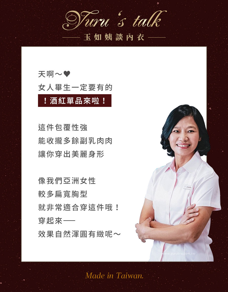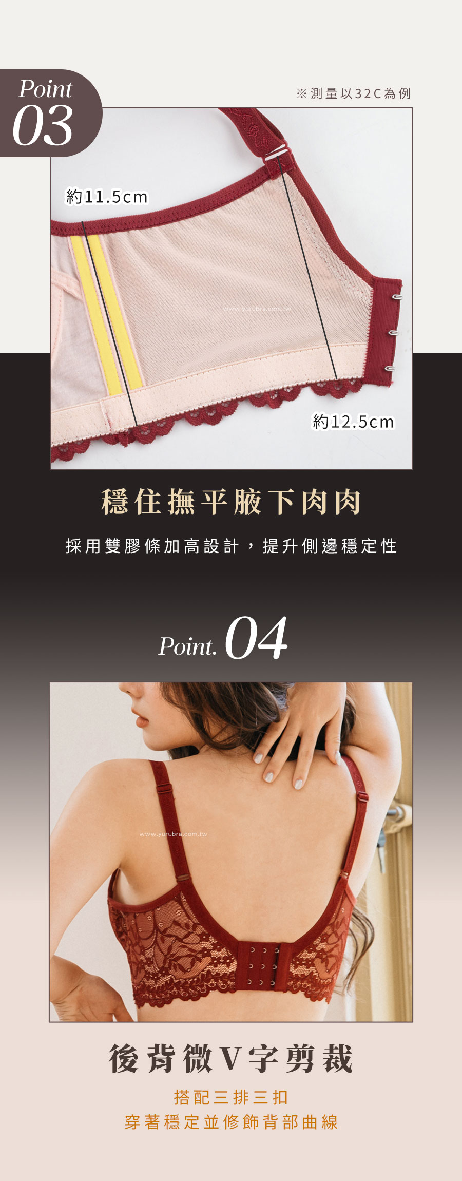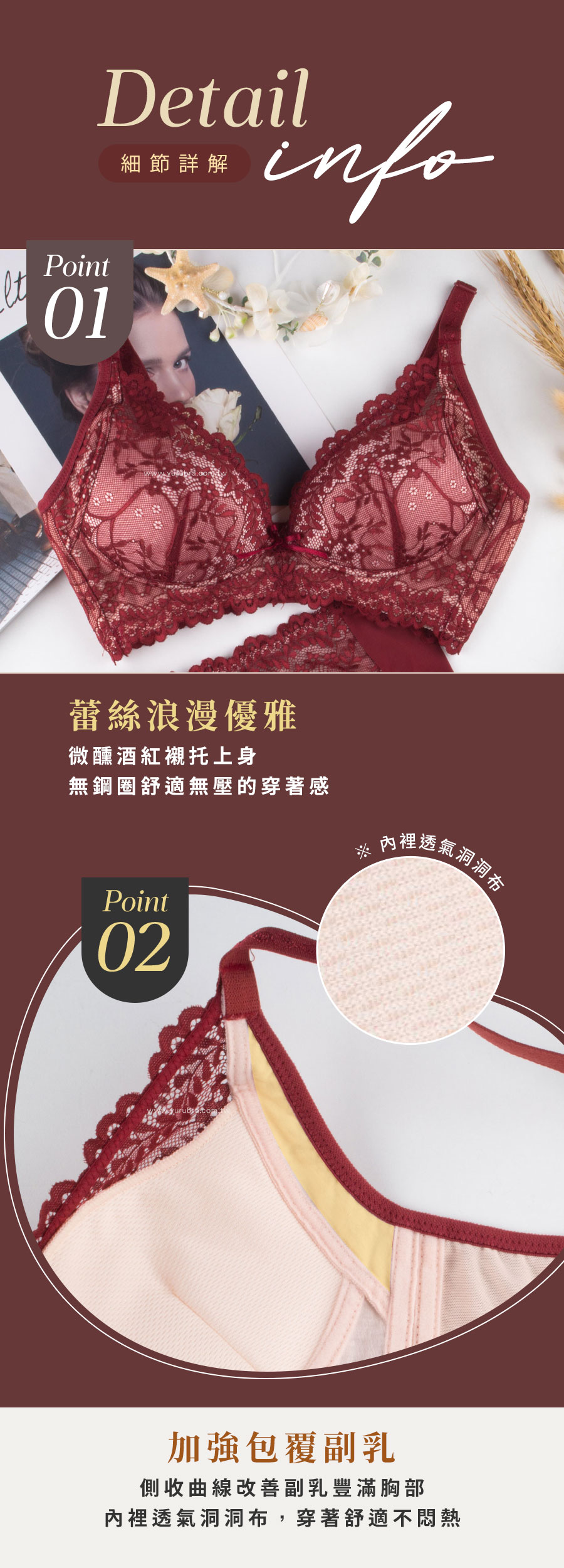 ★細緻蕾絲如藤蔓般攀附,以微醺酒紅襯托上身;浪漫優雅,如此簡單♥ ★3/4罩的水滴型罩杯,軟Q立體,貼合度超好 ★舒適無壓的穿著感,盡情享受無鋼圈的設計 ★杯模內裡洞洞透氣布,穿著舒適透氣 ★下土台採用1.8公分鬆緊帶,加強穩定服貼不移位 ★加強包覆副乳,側邊曲線收攏,改善副乳豐滿胸部 ★脅邊雙膠條加高,穩定包覆效果極佳 ★後背微V字剪裁,穩定且不易滑肩 ★台灣製造,品質保證