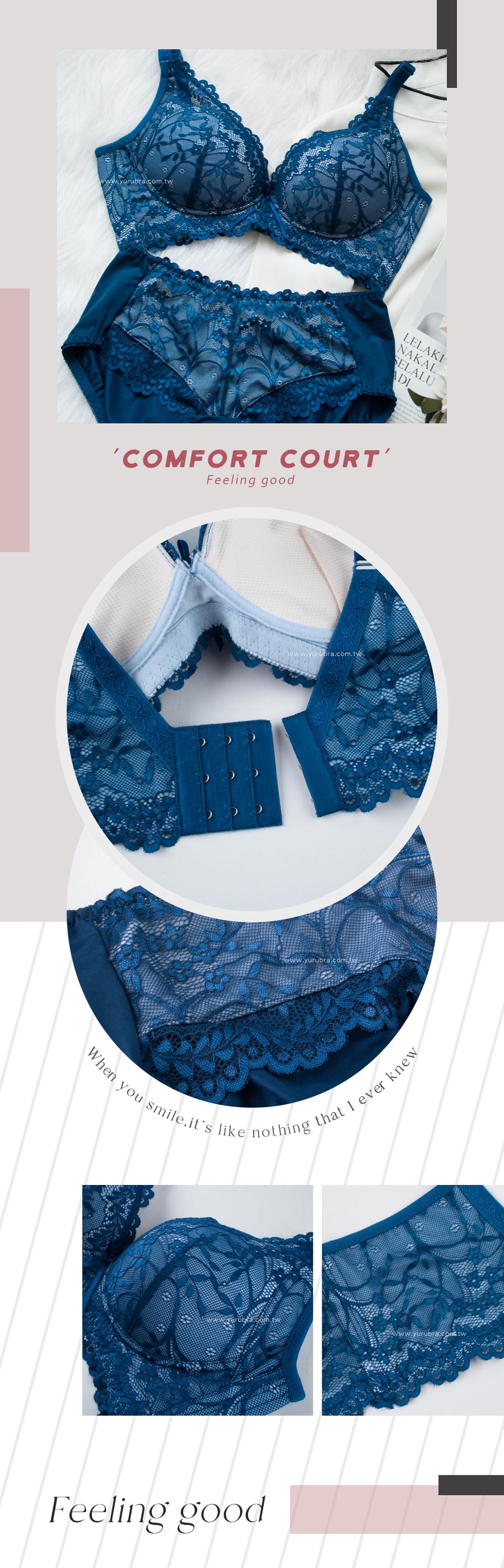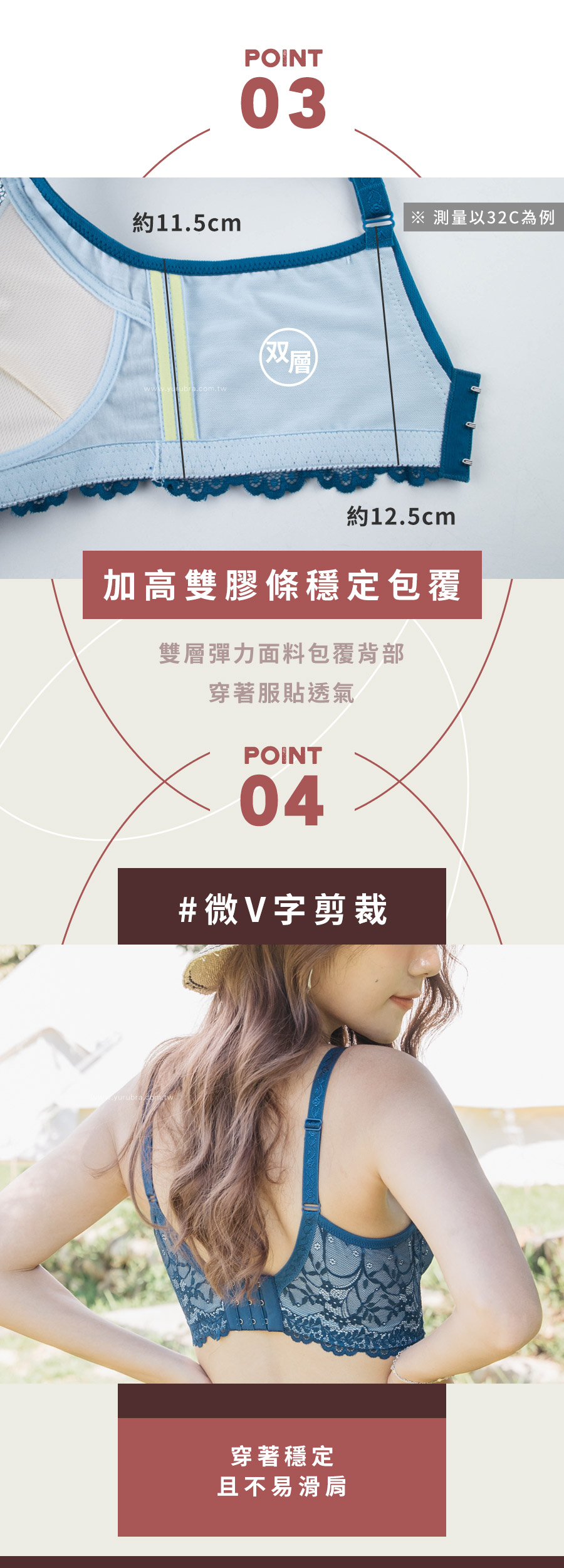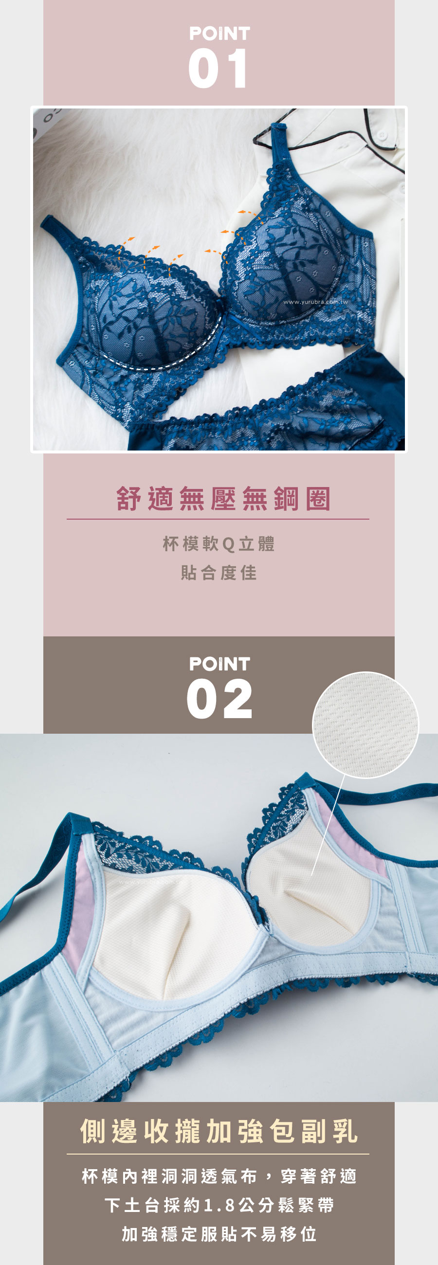 ★好穿到再推新色~深邃的藍色突襲~~ ★優雅蕾絲從前面延伸到後背片,整體圍繞出性感美麗 ★3/4罩的水滴型罩杯,軟Q立體,貼合度超好 ★舒適無壓的穿著感,盡情享受無鋼圈的設計 ★杯模內裡洞洞透氣布,穿著舒適透氣 ★下土台採用1.8公分鬆緊帶,加強穩定服貼不移位 ★加強包覆副乳,側邊曲線收攏,改善副乳豐滿胸部 ★脅邊雙膠條加高,穩定包覆效果極佳 ★後背微V字剪裁,穩定且不易滑肩 ★台灣製造,品質保證