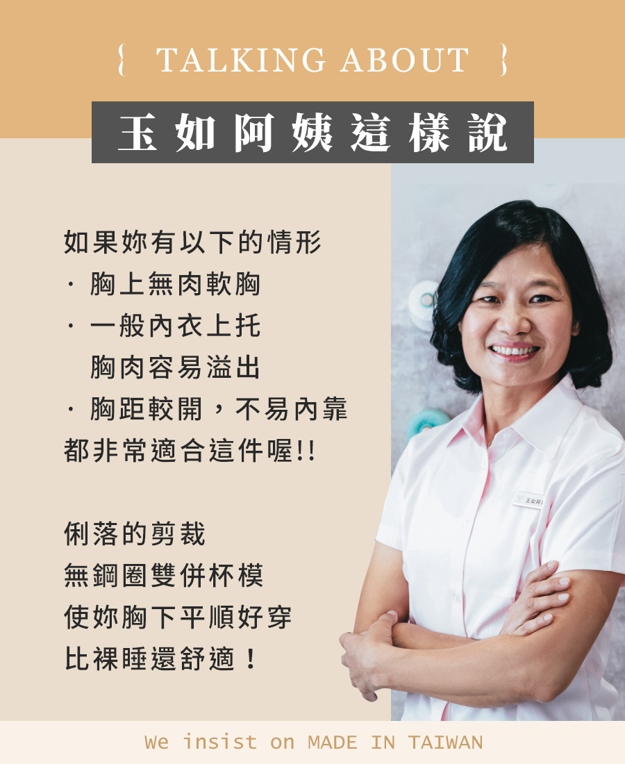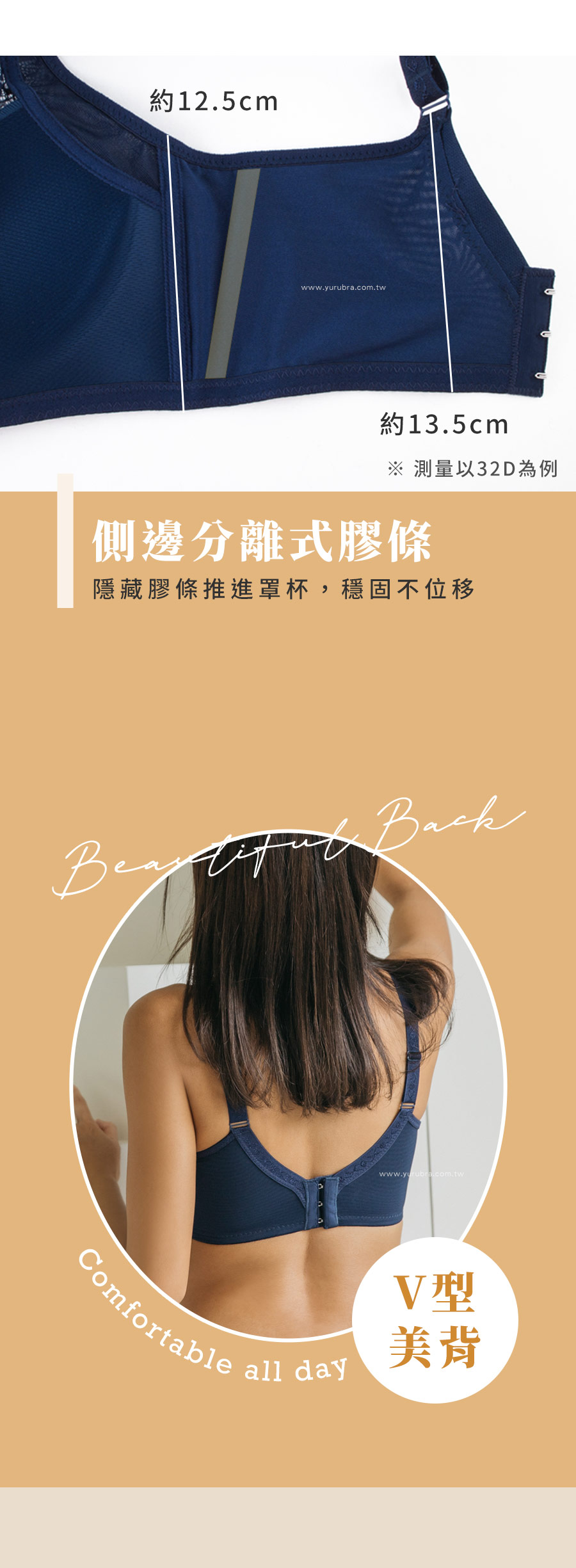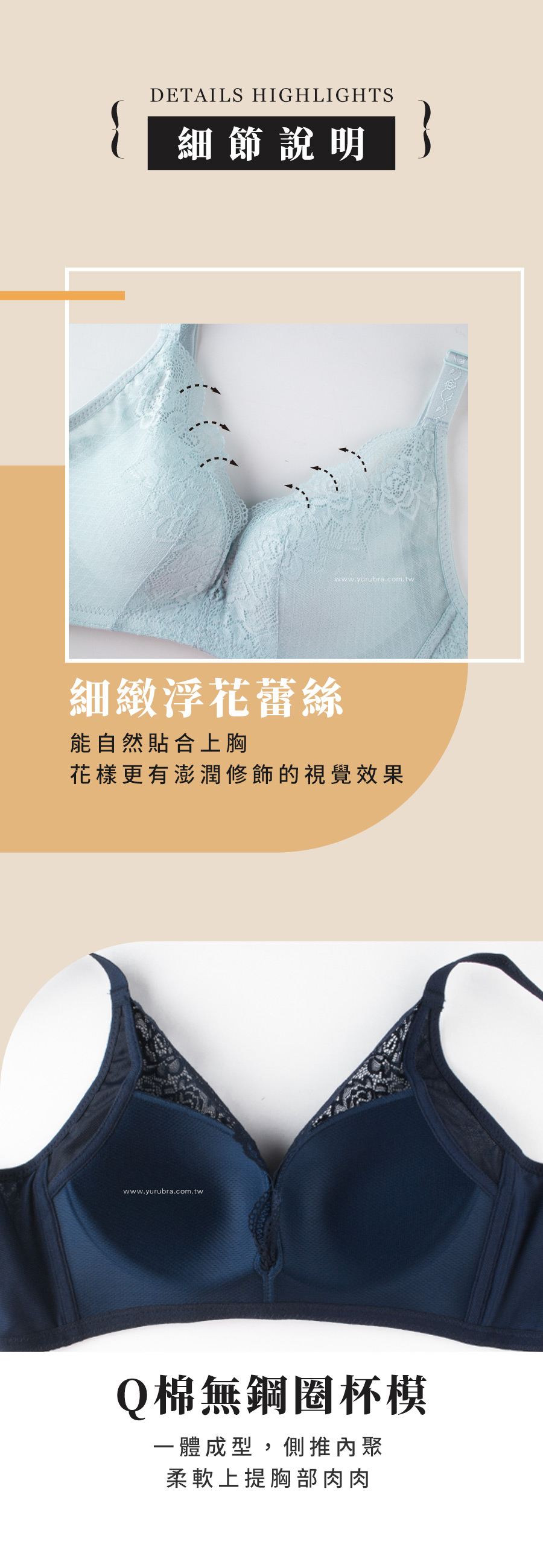 ★無鋼圈雙併杯模,比裸睡還舒適 ★Q棉打造無鋼圈杯模,舒適的上提胸肉 ★一體成型雙併連體杯模,輕薄好穿,自然不厚重 ★低脊心設計,強力拉近胸距,不集中也難 ★隱藏加寬副乳側壓片,無彈力加壓網布,修飾副乳包覆佳 ★側邊分離式雙膠條,鎖住肉肉不往後跑,推進罩杯穩固不位移 ★雙層透氣網布側片,加高設計更能包覆側背肉 ★V型美背包覆平順,美觀且不易滑肩 ★台灣製造,品質保證