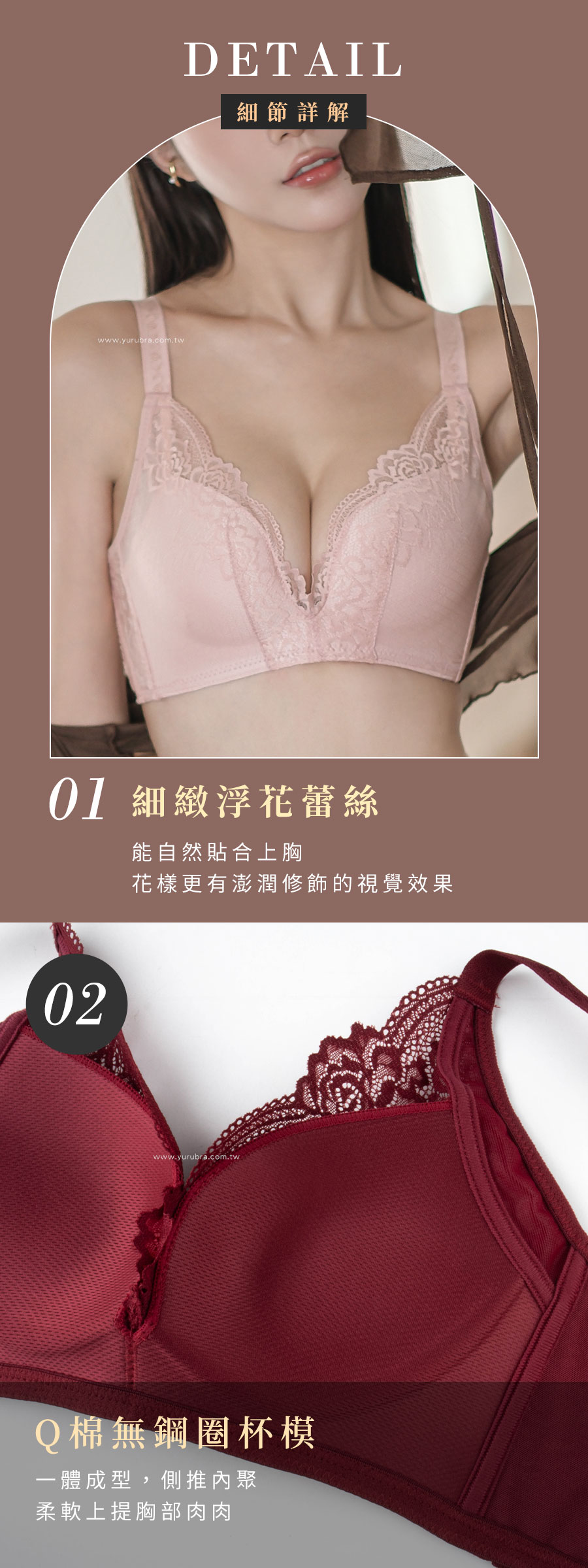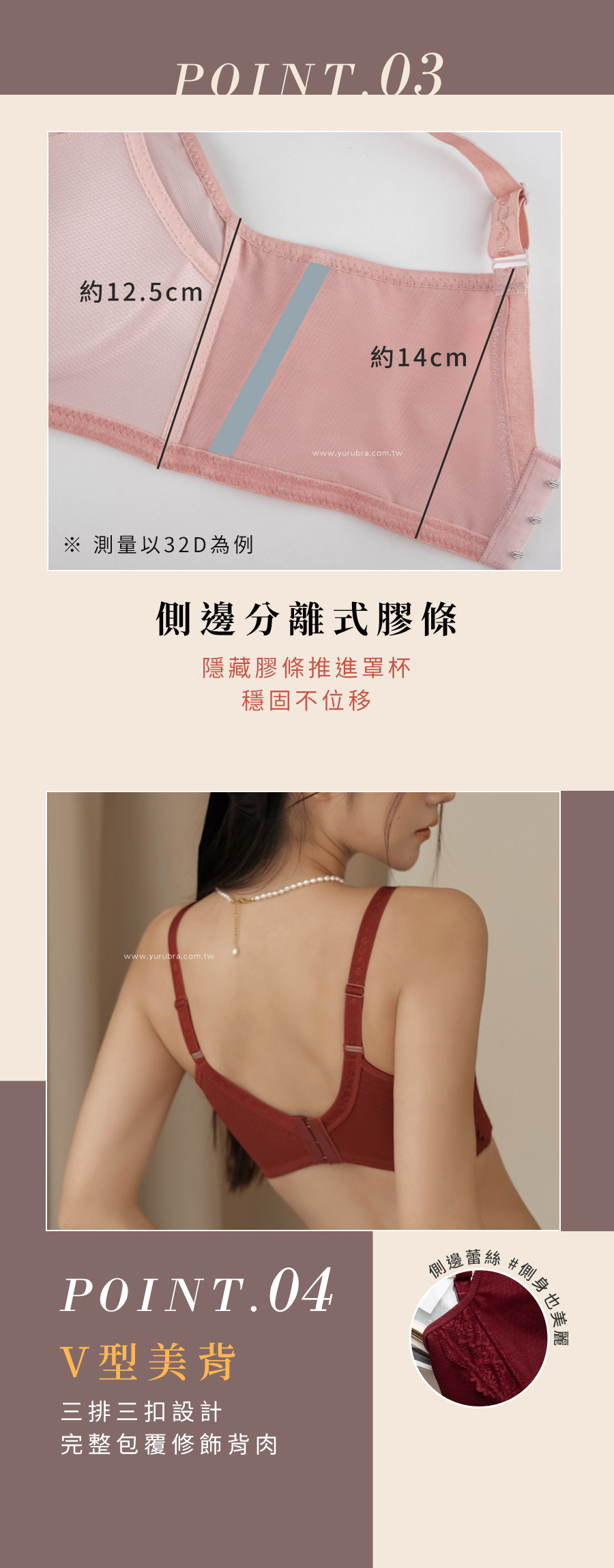 ★無鋼圈雙併杯模,比裸睡還舒適 ★Q棉打造無鋼圈杯模,舒適的上提胸肉 ★一體成型雙併連體杯模,輕薄好穿,自然不厚重 ★低脊心設計,強力拉近胸距,不集中也難 ★隱藏加寬副乳側壓片,無彈力加壓網布,修飾副乳包覆佳 ★側邊分離式雙膠條,鎖住肉肉不往後跑,推進罩杯穩固不位移 ★雙層透氣網布側片,加高設計更能包覆側背肉 ★V型美背包覆平順,美觀且不易滑肩 ★台灣製造,品質保證