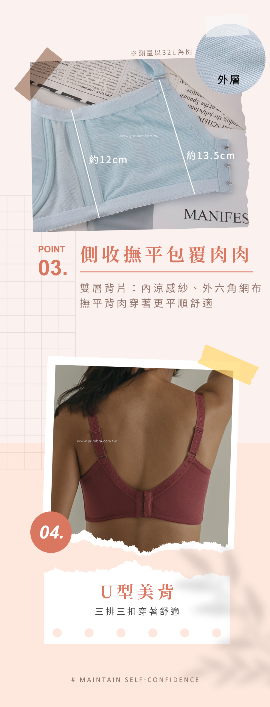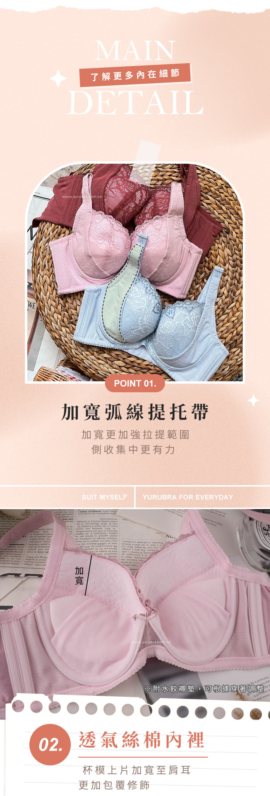 ★穿上這件內衣,包上加包讓胸部更美 ★外型做加寬提托帶,能加強胸部托高和集中感 ★上緣呈現V字剪裁,對上胸肉肉包覆性好 ★杯模上片漸進式加寬到肩耳,更加包覆修飾胸型 ★小兵立大功:可卸式水餃襯墊,讓胸部更加豐滿 ★肩帶加寬約1.8CM,降低大罩杯水水的重壓感,穿著更穩定 ★腋下雙膠條加強穩固,側收撫平包覆肉肉 ★內層涼感紗+外層六角網布,撫平背肉穿著更平順舒適 ★U型美背設計,讓背部曲線更美好 ★台灣製造,品質保證