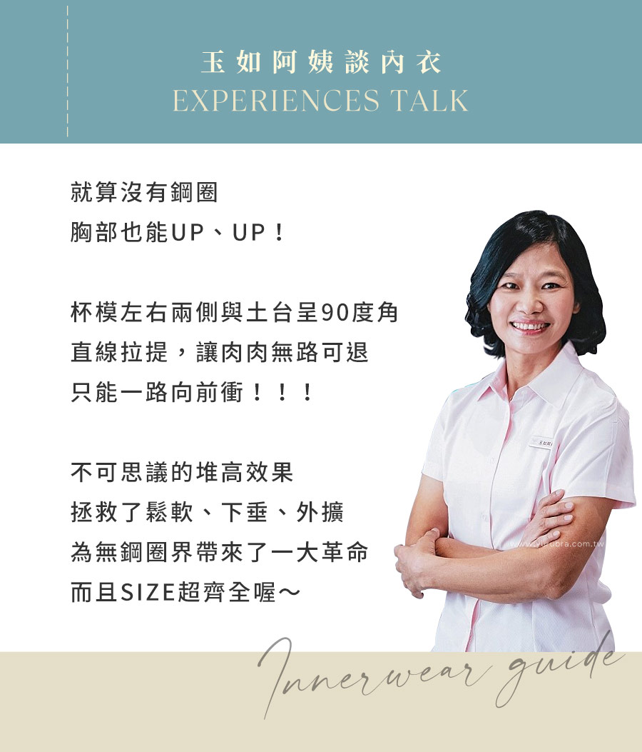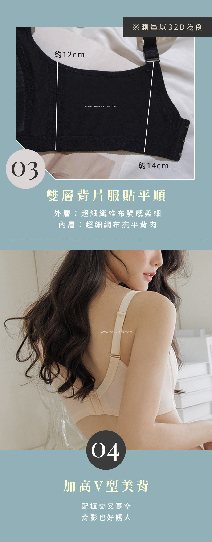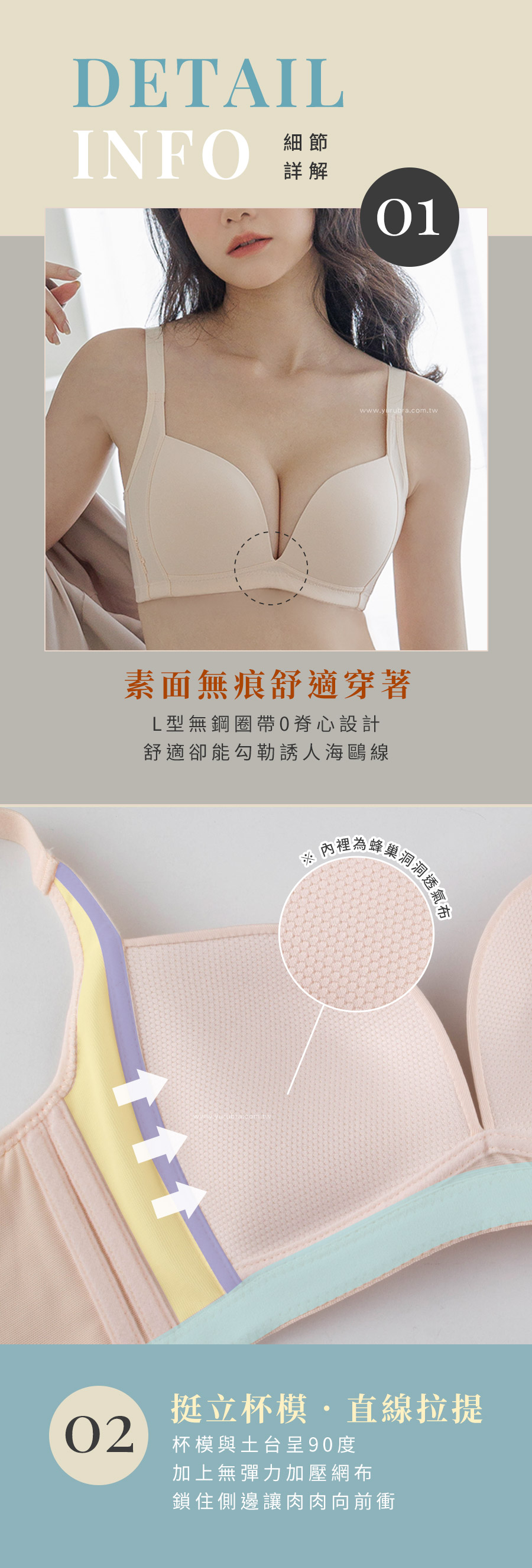 ★肉肉向前爆衝!無鋼圈大革命! ★不可思議的堆高效果,拯救鬆軟、下垂、外擴 ★挺立貝殼杯,直線拉提讓平原秒變山峰 ★無彈力加壓網布從杯模下方到肩耳,有如穩固高牆守護胸肉 ★蜂巢洞洞布內裡,舒適透氣不易悶熱 ★無痕超細表布貼合上胸,緊身、薄紗,大膽搭 ★0脊心設計,舒適卻能勾勒誘人海鷗線 ★超包副乳設計,柔細緊帶包邊,不易磨擦肌膚 ★腋下採雙迸膠骨,守住腋下肉肉不位移 ★雙層加高V型美背,布料柔細又透氣,貼合背肉不易滑肩 ★台灣製造,品質保證