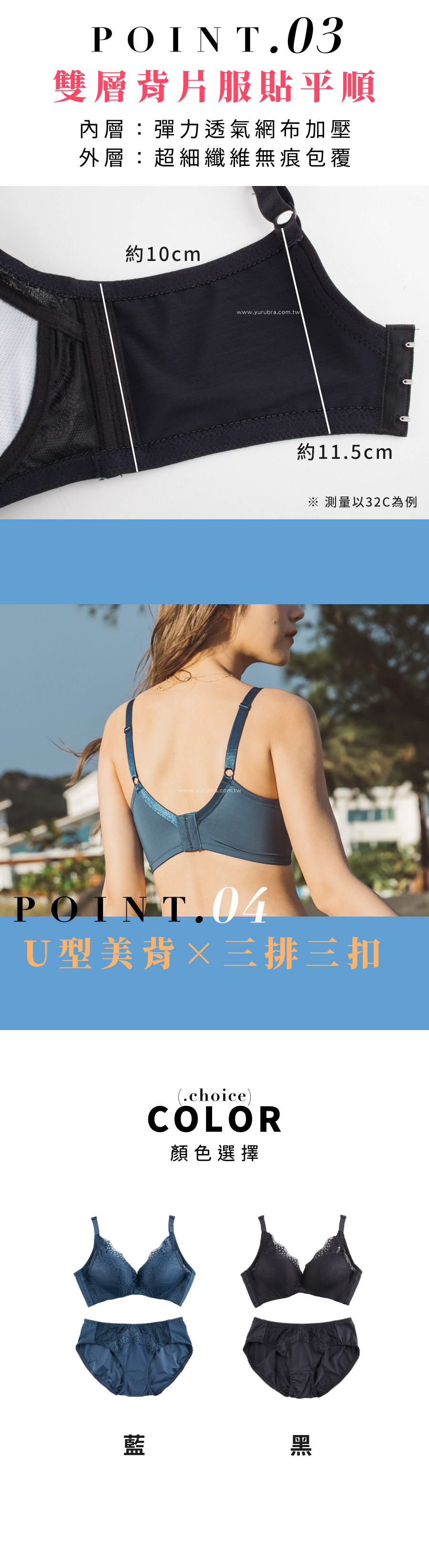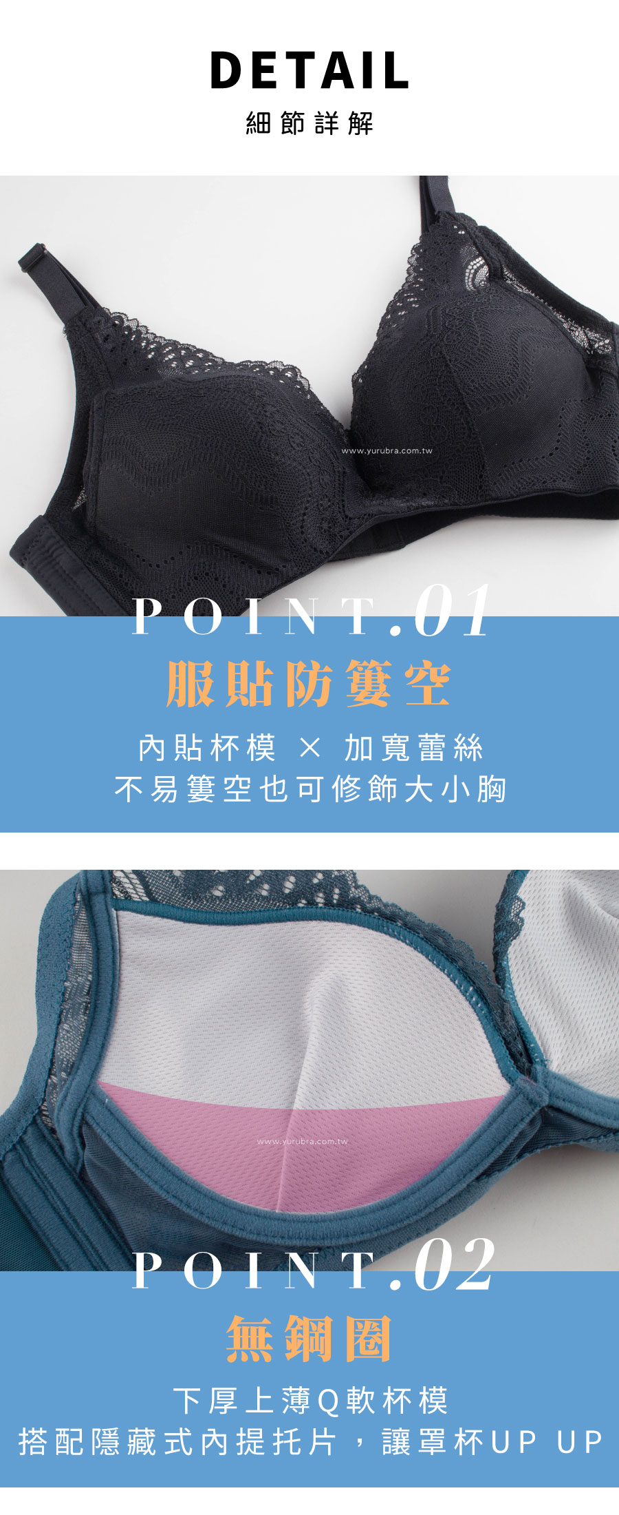 ★無鋼圈也可以很包覆很集中! ★蕾絲在脊心做交叉設計,拉近胸距讓肉肉更靠近 ★杯模內裡除了下厚還暗藏了提托片,雙重提托力道讓罩杯升級 ★內貼杯模與加寬蕾絲,穿起來不易簍空也可修飾大小胸 ★杯模內裡採用透氣鳥眼布,舒適不易悶熱 ★副乳側壓片加寬加長,可完整包覆惱人的副乳 ★雙層背片,兼俱透氣加壓撫平與無痕包覆 ★採用三排三扣,輕鬆調整好穿脫 ★台灣製造,品質保證