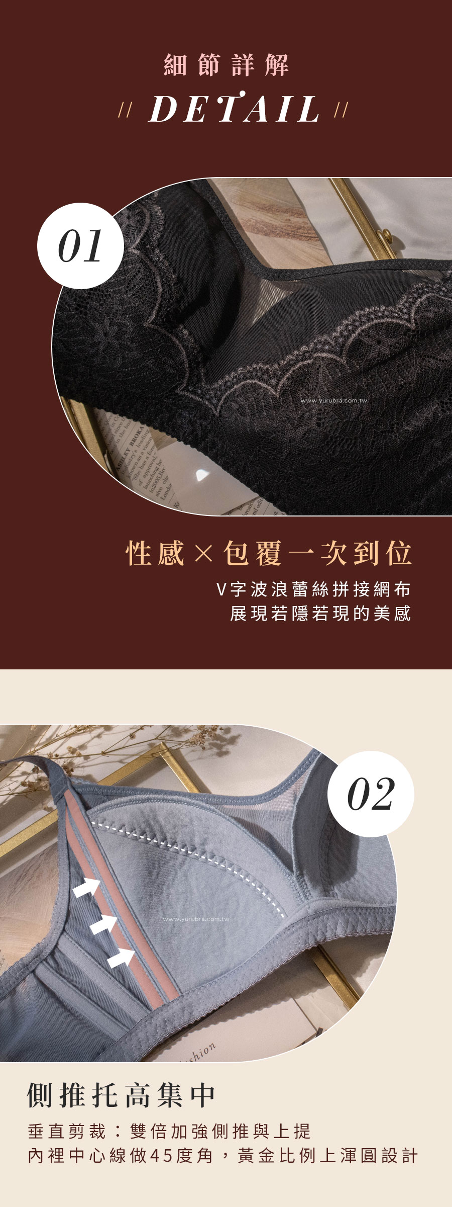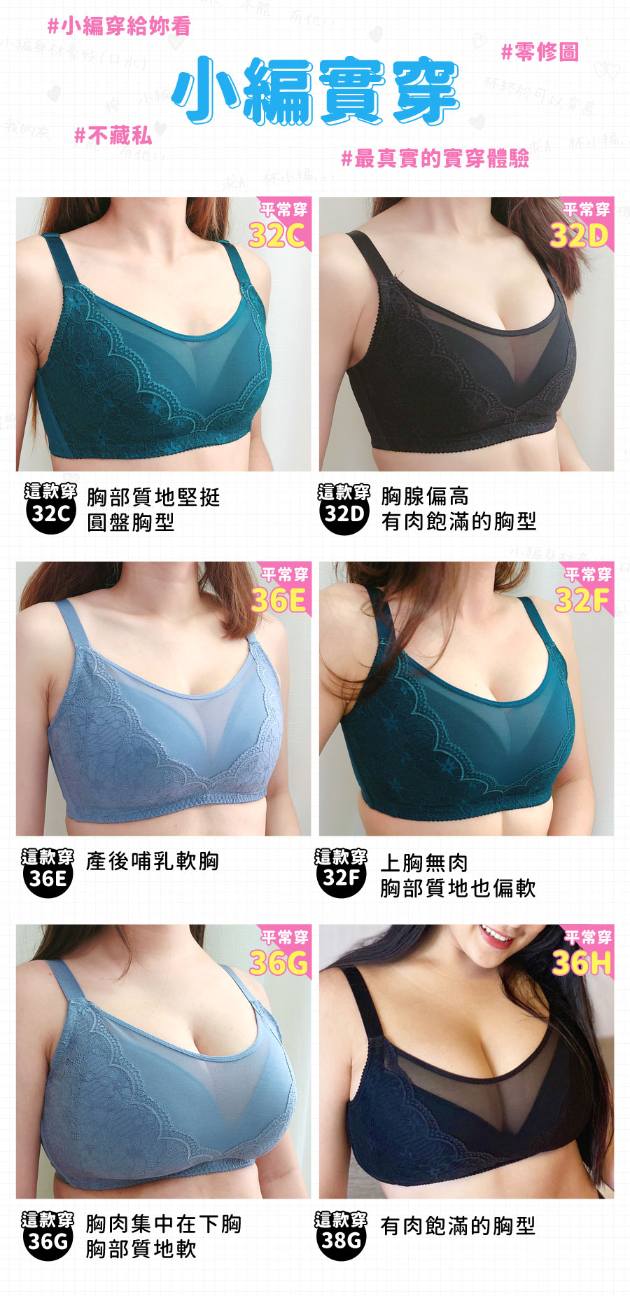 ★廣受大胸女孩們的好評認證,越豐滿穿起來越美 ★V字波浪蕾絲拼接網布,展現若隱若現的美感 ★鬆緊帶土台約1.8公分,加強穩住身圍不走位 ★兩側雙併無鋼圈帶,與土台做垂直剪裁,雙倍加強側推與上提 ★內裡中心線做45度角,黃金比例的上渾圓設計 ★側顯瘦的扇型剪裁,讓舒服與托高集中同時擁有 ★腋下無彈力貼合網布,撫平腋下肉肉並強力側推,讓身形顯瘦 ★側邊分離式斜膠條,分散壓力加強穩定推進,將肉肉再次推進 ★雙層六角網布,服貼背部撫平背肉 ★加寬肩帶約2公分,讓大罩杯的妳,大大降低肩膀的重壓感 ★後背做小V剪裁,較不易滑肩 ★台灣製造,品質保證