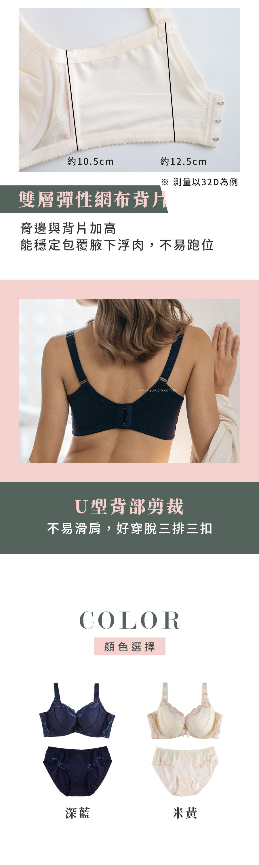 ★如奶油蛋糕般的香草色、輕熟感的蝶豆藍,兩種風格值得一次擁有♥ ★脊心處緞帶裝飾,與聚攏帶相連延伸,帶來軟綿綿的日系輕甜風 ★從脊心處延伸至側邊,加高加寬的聚攏帶能更聚攏胸部 ★舒適柔軟的棉質內裡,穿著輕盈不易悶熱 ★上揚S型剪裁,內貼、胸肉上托,創造渾圓美胸 ★脅邊與側翼加高,能穩定包覆腋下浮肉,不易跑位 ★雙層彈性背片,能撫平背後線條兼具舒適感 ★U型美背設計,3排3扣穩定不易滑肩 ★台灣製造,品質保證
