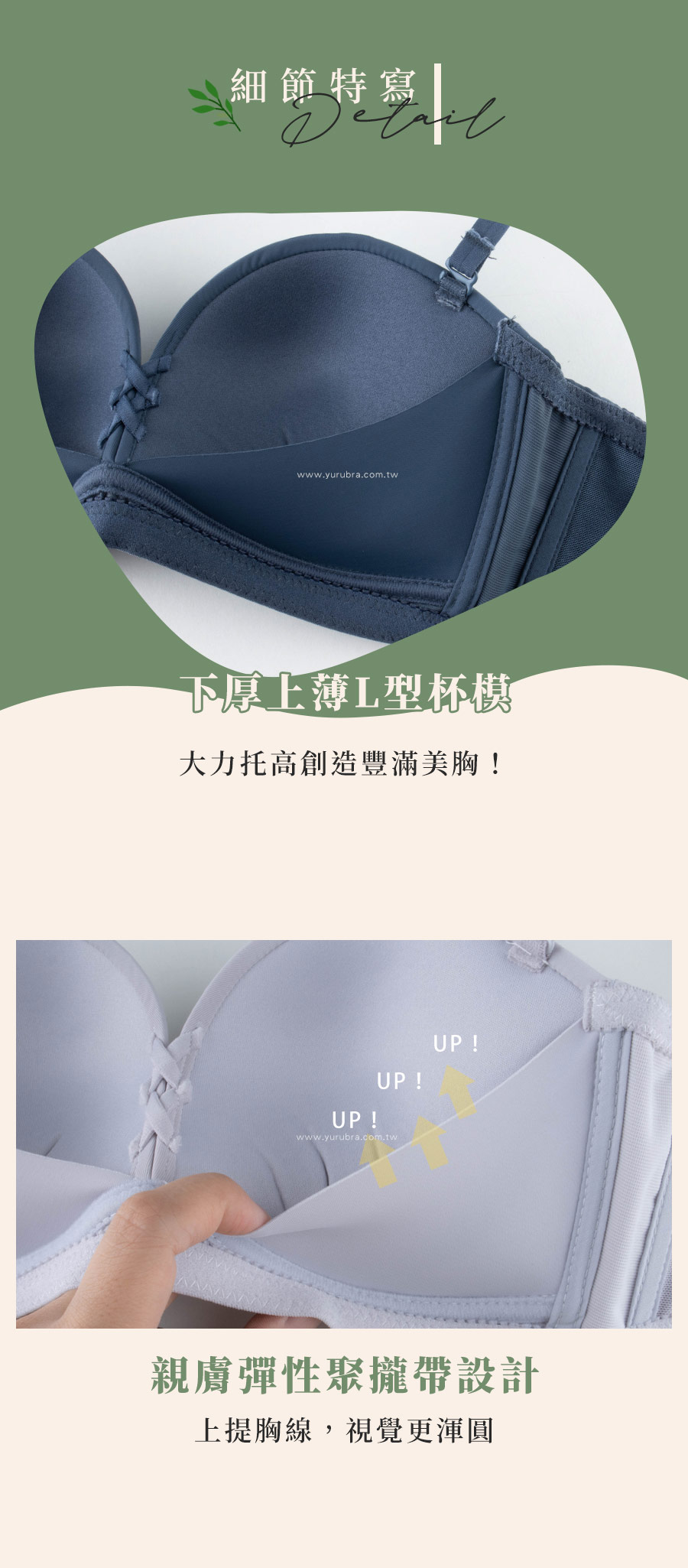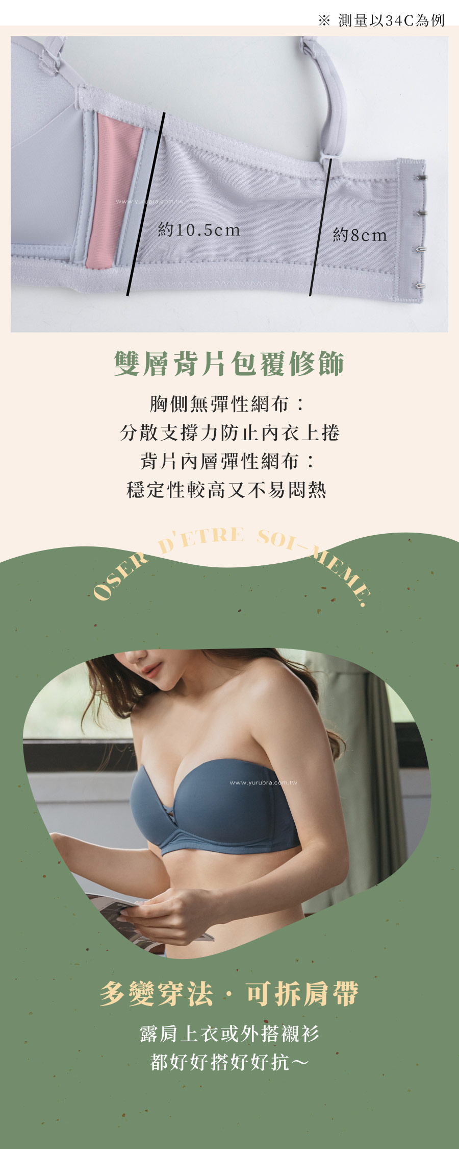 ★無鋼圈‧零束縛感!d(`・∀・)b夏日必備滴神奇造溝武器 ★可拆肩帶設計,露肩上衣或外搭襯衫都好好搭好好抗~ ★2/3罩杯內貼剪裁,BP點不易走光又包覆 ★下厚上薄L型杯模,大力托高創造豐滿美胸 ★親膚彈性聚攏帶設計,上提胸線,視覺更渾圓 ★脊心處雙交叉設計,拉近胸距又性感♥ ★胸側無彈性網布,分散支撐力防止內衣上捲 ★背片內層彈性網布,穩定性較高又不易悶熱 ★一字型雙層背片,更緊實HOLD住背部不位移 ★三排四扣,更穩固不易下滑 ★台灣製造,品質保證