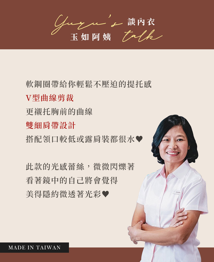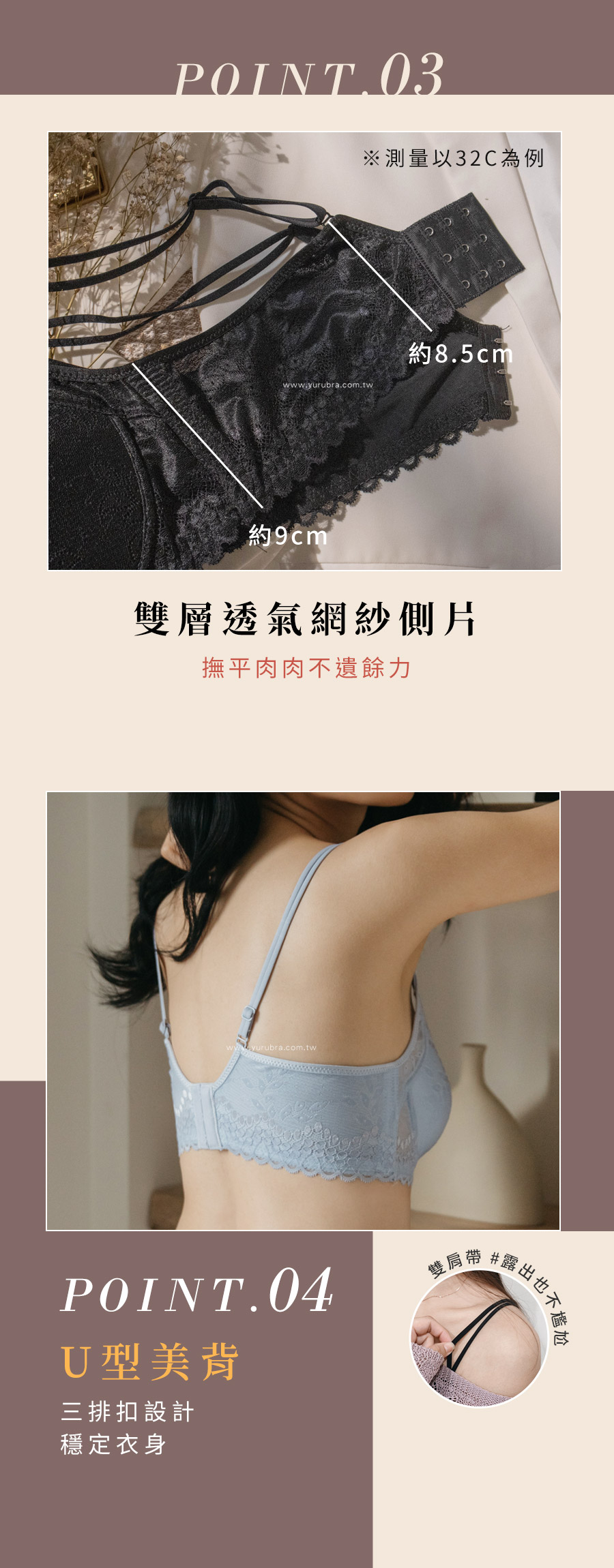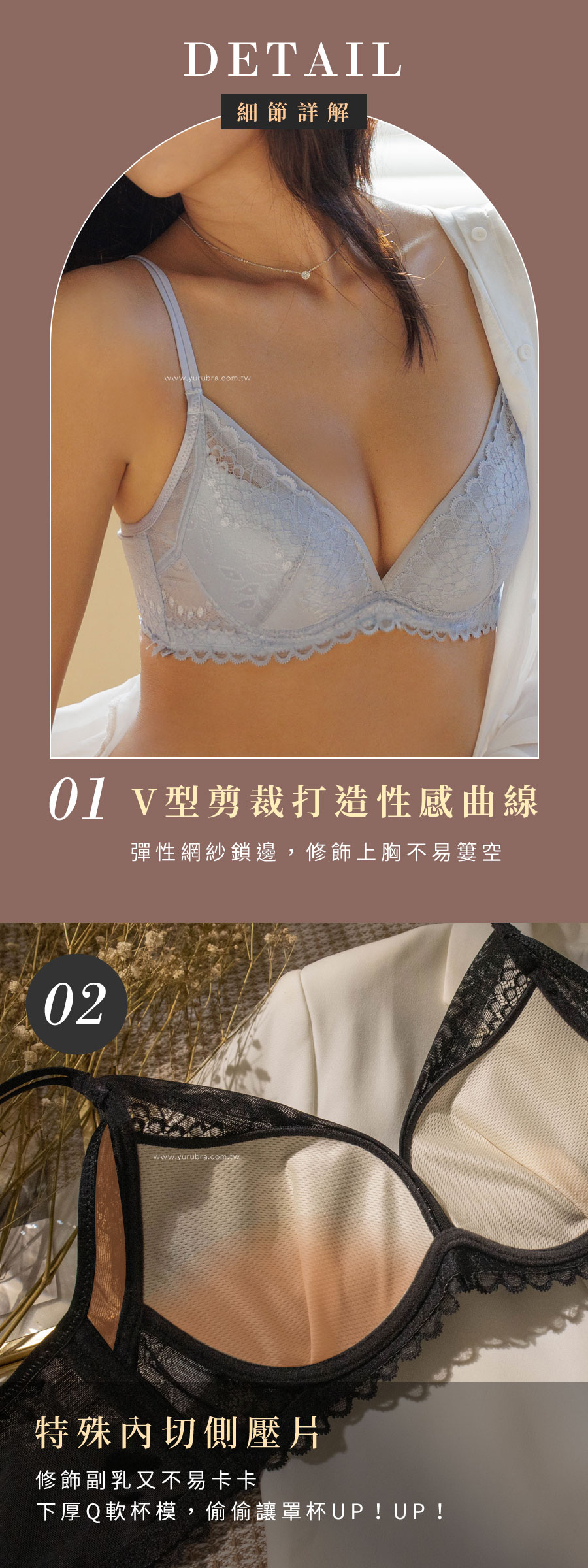 ★V型曲線剪裁表布,襯出極致性感深溝 ★L型塑型軟鋼圈,能舒適的塑造美好胸型 ★W型鋼圈帶,零脊心,拱托渾圓胸部不易壓迫 ★彈性網紗鎖邊,能服貼並修飾上胸無肉、大小胸不易簍空 ★杯模內裡為洞洞透氣布,乾爽舒適 ★分岔雙細肩帶,搭配領口較低或露肩裝都很水哦♥ ★特殊內切剪裁側壓片,能修飾副乳又不易卡腋下 ★腋下採用雙膠條,穩住並撫平腋下肉肉 ★透氣網紗背片,包覆背部並穩定撫平背肉 ★三排扣設計穩定衣身,輕鬆調整胸下圍舒適度 ★台灣製造,品質保證