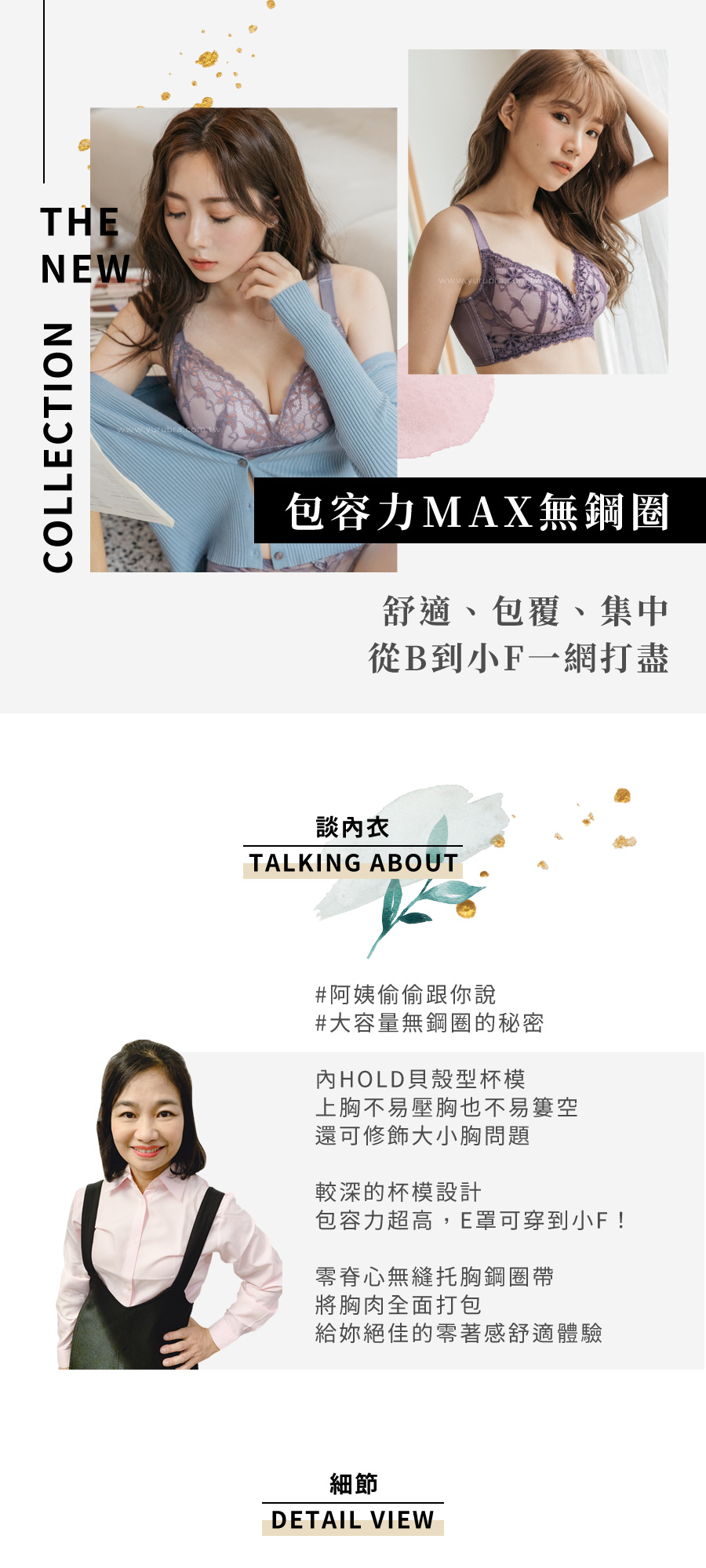 ★包容力MAX無鋼圈內衣,從B到小F罩杯一網打盡 ★零脊心無縫托胸鋼圈帶,讓妳體驗舒適零著感 ★內HOLD貝殼杯模,上緣貼合不易壓胸也不易簍空 ★杯模弧型中心線剪裁,胸型挺立又渾圓 ★內裡洞洞透氣Q棉,膨軟舒適可防尷尬激凸 ★脊心採雙層六角網布,強力拉進胸距防止外擴 ★蕾絲在脊心處做交叉設計,二度集中更加性感 ★下土台採1.8公分寬的鬆緊帶,穿著好穩定 ★防副乳側壓片設計,對腋下浮肉圈包覆效果佳 ★雙層六角網布背片,包覆與舒適一次到位 ★台灣製造,品質保證