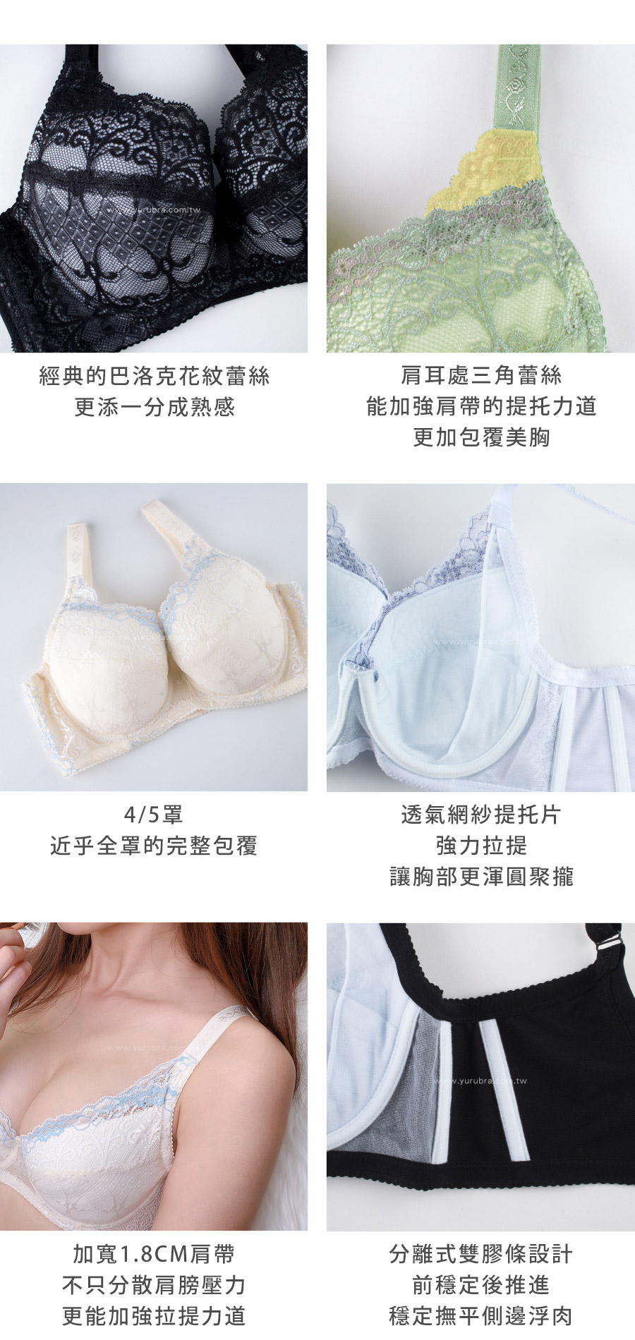 ★經典不過於花俏的巴洛克花紋蕾絲,更添一分成熟感 ★肩耳處三角蕾絲,能加強肩帶的提托力道、更加包覆美胸 ★4/5罩給妳近乎全罩的完整包覆 ★透氣網紗提托片,強力拉提,讓胸部更渾圓聚攏 ★加寬1.8CM肩帶,不只分散肩膀壓力更能加強拉提力道 ★分離式雙膠條設計,前穩定後推進,穩定撫平側邊浮肉 ★雙層共560丹的塑網背片,撫平背肉超有力 ★3排3扣U型美背,穿著不易滑動又穩固 ★台灣製造,品質保證