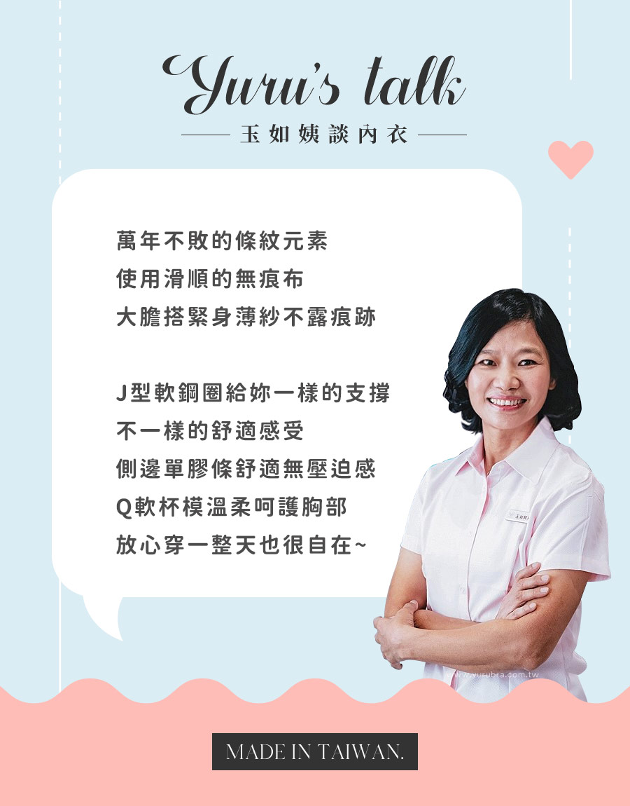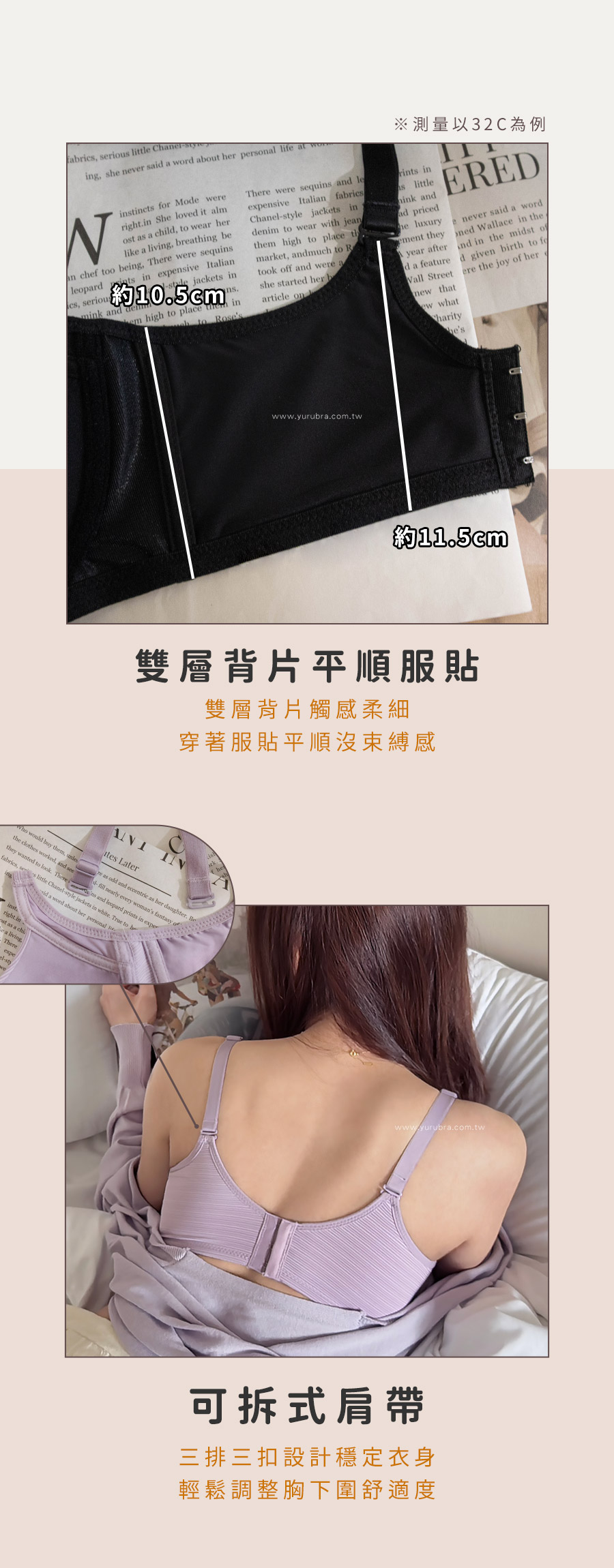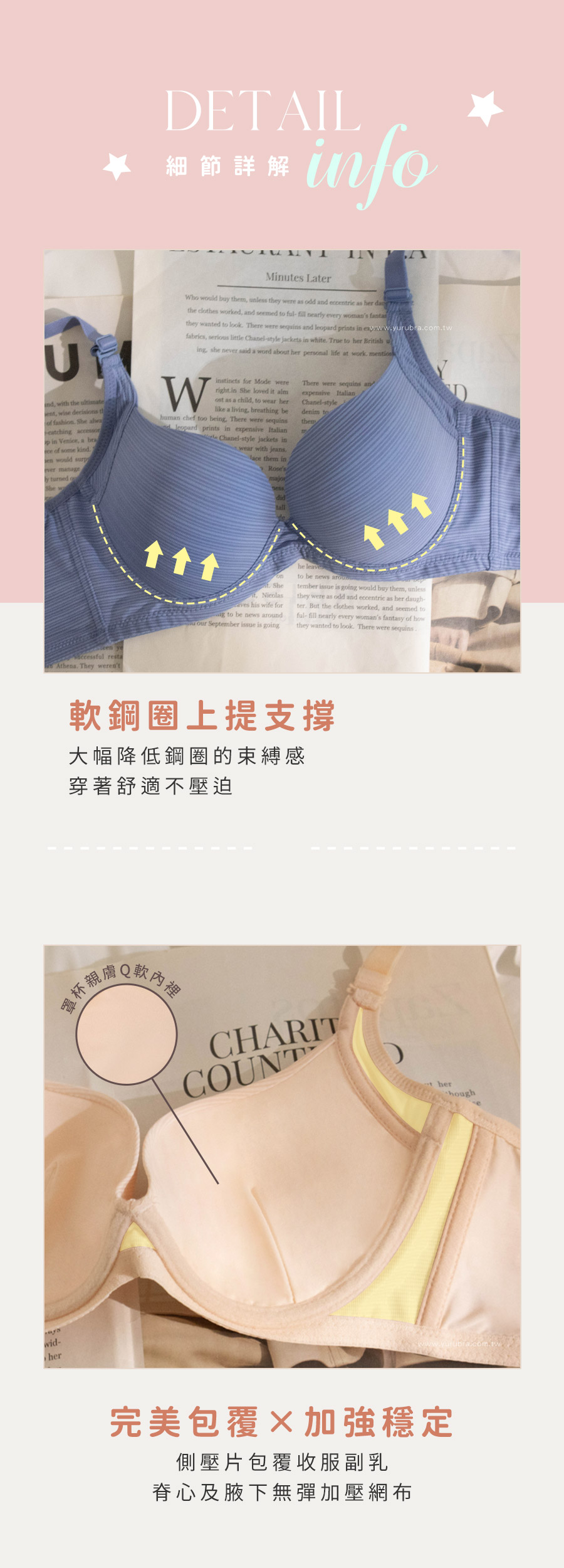 ★最適合新手的軟鋼圈內衣 ★有內衣的穩定包覆又沒有壓迫感,穿著更舒適 ★清新百搭的條紋+滑順超細無痕布,讓妳日常穿衣好搭配 ★J型軟鋼圈給妳一樣的支撐,不一樣的舒適感受 ★罩杯Q軟內裡超細親膚布,給胸部溫柔的呵護 ★側壓片包覆收服副乳,使你穿衣更完美 ★活動式肩帶,方便做拆換及變換穿法,從容應對不同的搭配 ★側邊單膠條設計,舒適無壓迫感 ★雙層背片觸感柔細,穿著服貼平順沒束縛感 ★三排扣設計穩定衣身,輕鬆調整胸下圍舒適度 ★台灣製造,品質保證