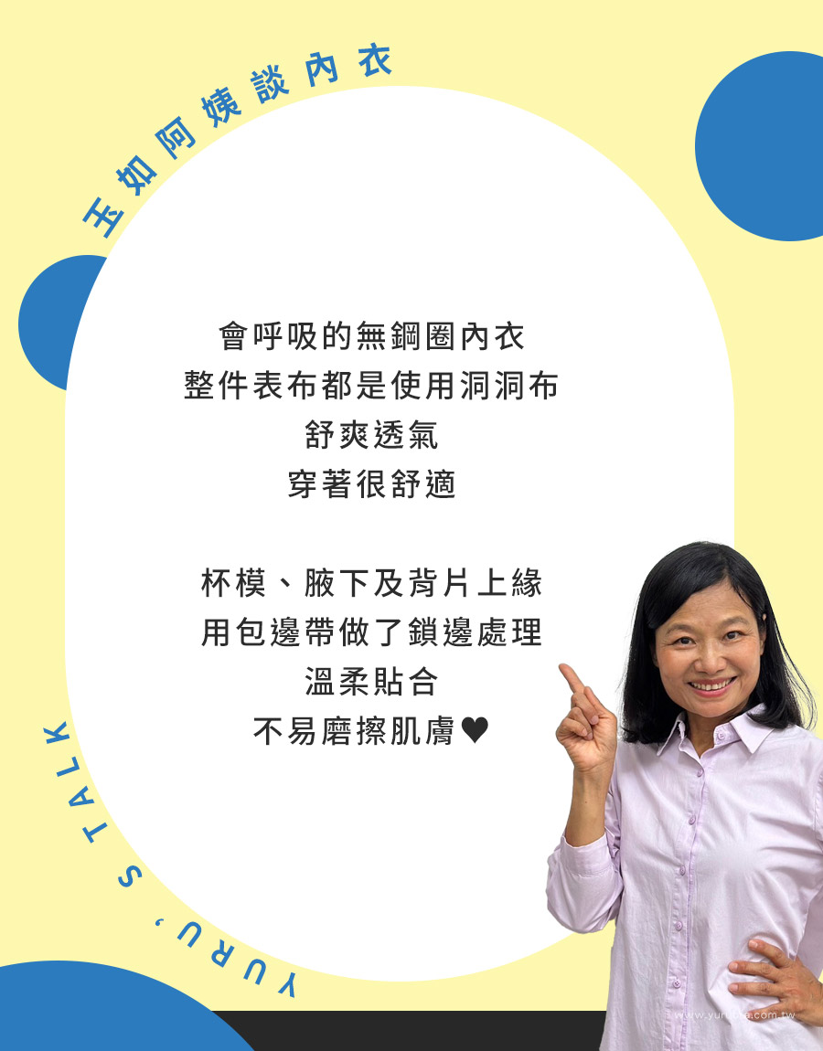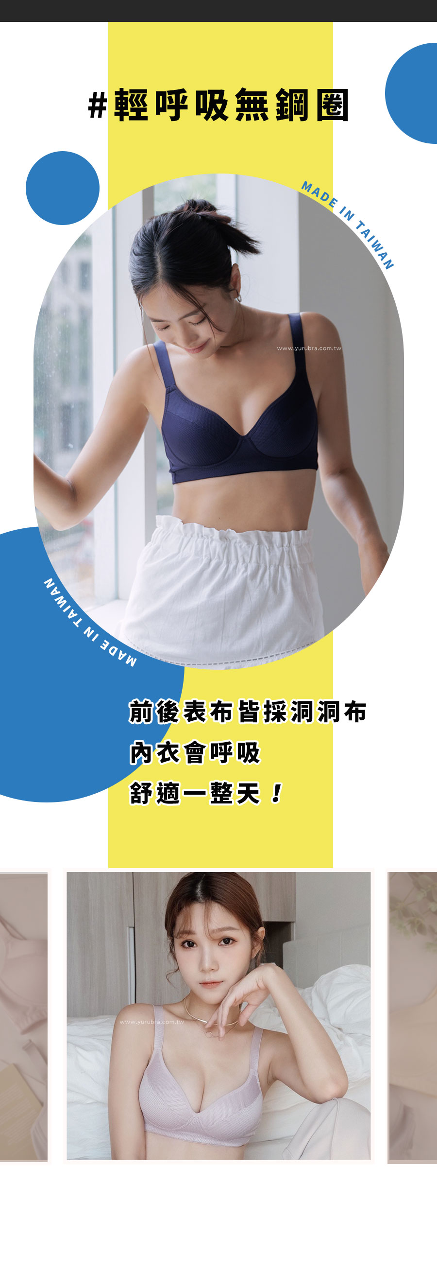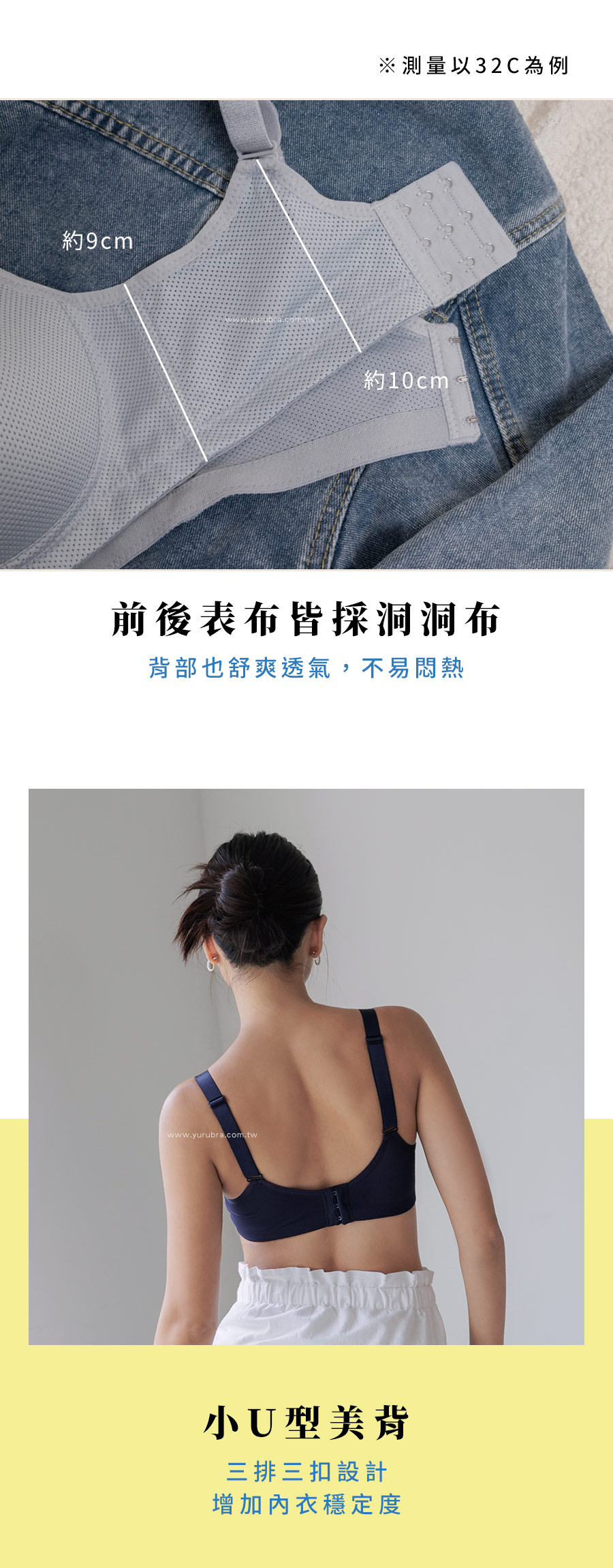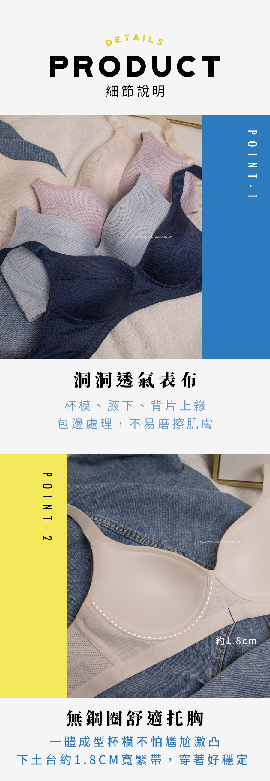 ★輕呼吸無鋼圈,讓妳舒適一整天 ★前後表布皆採洞洞布,穿著舒爽又透氣 ★杯模、腋下及背片上緣包邊處理,溫柔貼近肌膚 ★一體成型杯模,不怕尷尬激凸 ★脊心及腋下裡布採無彈網布,穩定胸距並鎖住腋下浮肉 ★下土台1.8CM寬緊帶,穿著穩定不易位移 ★可調式肩帶,可依身形做調整 ★小U型美背搭配三排三扣 ★台灣製造,品質保證