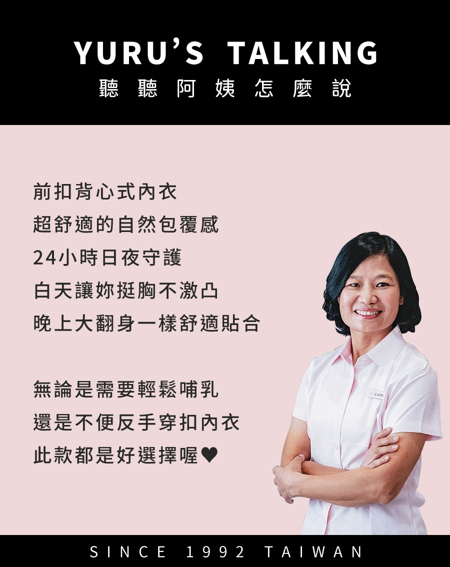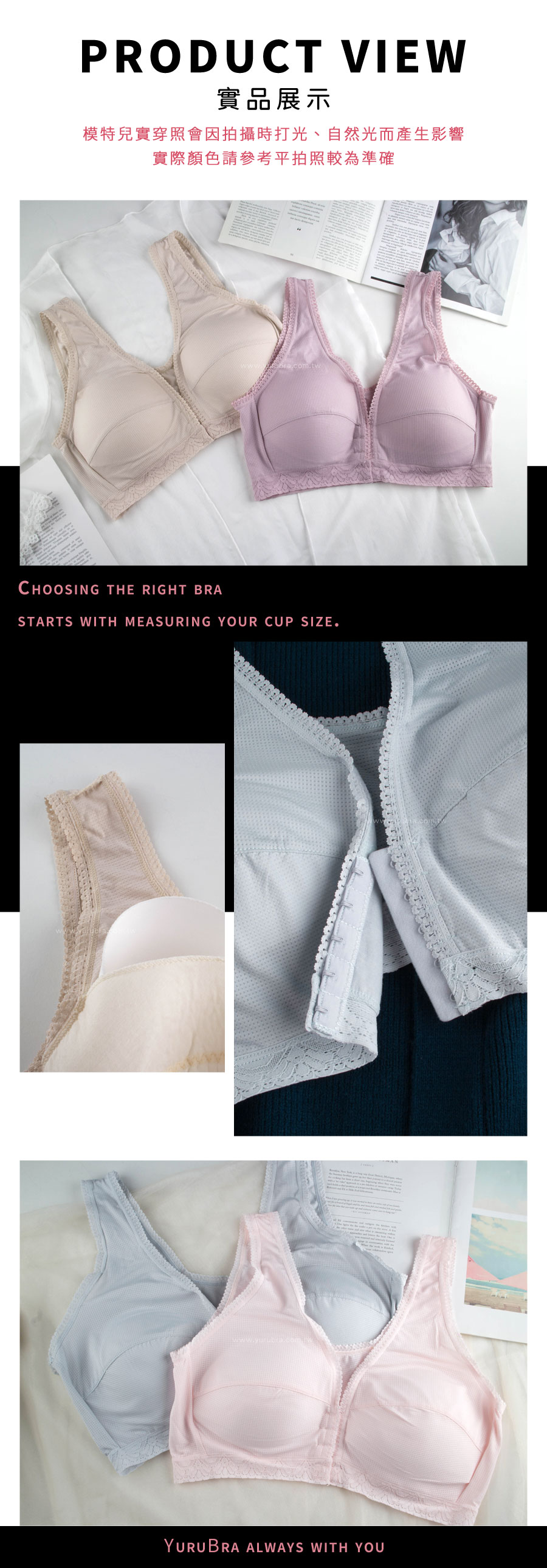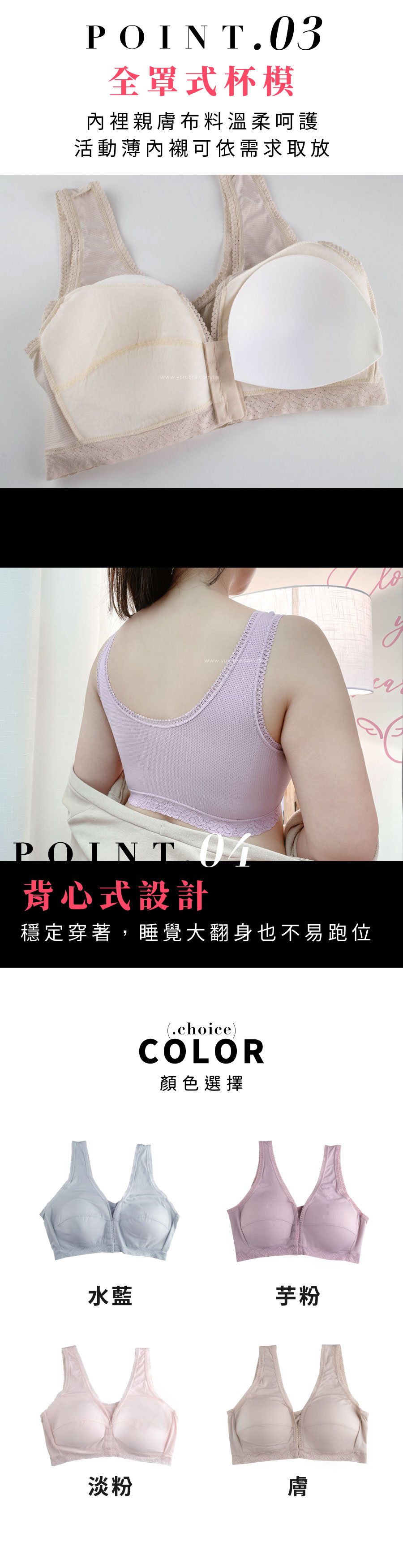 ★日夜守護,極舒適零著感 ★前扣式穿著,不用反手更好穿脫 ★無鋼圈輕鬆護胸,零著感的舒適體驗 ★前後表布皆為蜂巢呼吸布,穿一整天也舒適 ★下圍土台採彈性蕾絲,美觀不緊勒 ★內裡親膚布料,溫柔呵護胸肉 ★活動薄內襯設計,可依需求取放 ★背心式設計,穿著穩定 ★台灣製造,品質保證