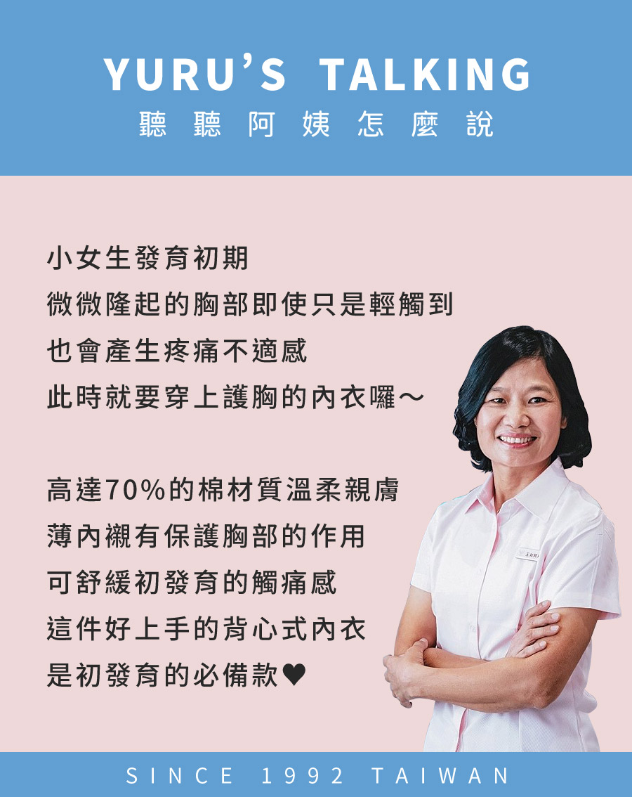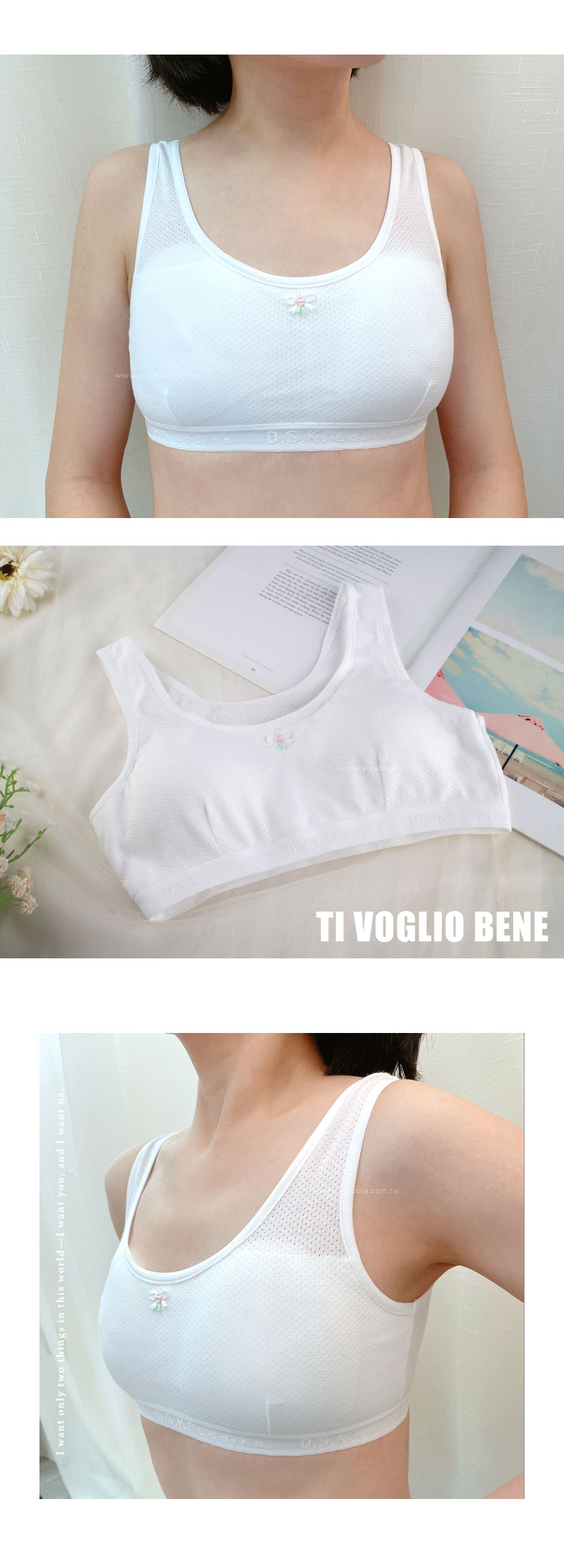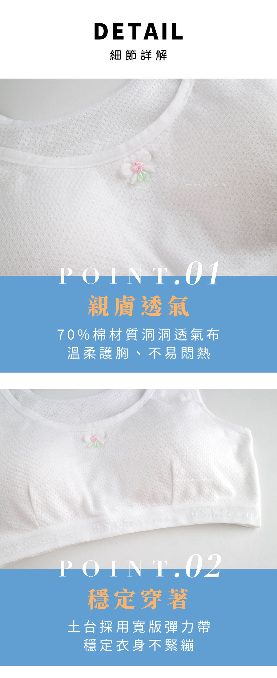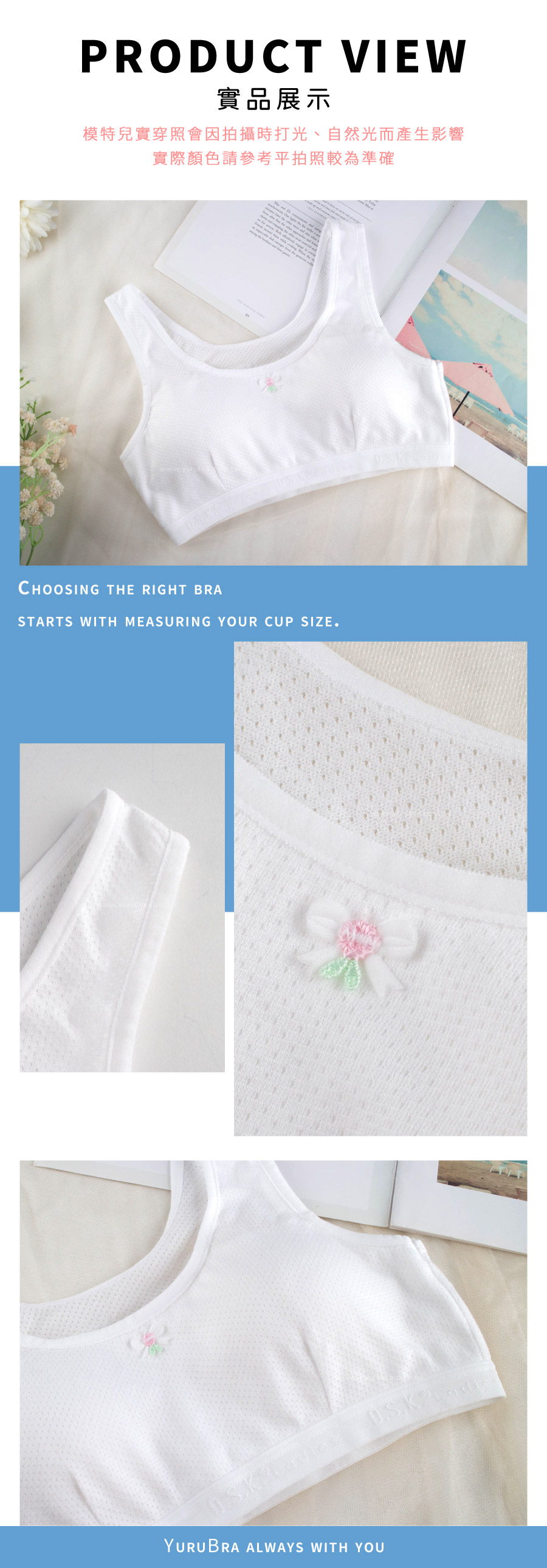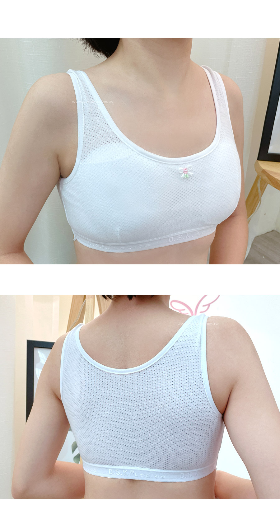 ★護胸、舒適、好穿脫,少女胸部發育初期必備 ★表布皆採洞洞透氣布,完整包覆護胸也不易悶熱 ★70%棉材質,親膚呵護初發育的胸部 ★活動薄內襯,可緩衝觸碰的不適,也可防止尷尬激凸 ★土台採用彈力緊帶,穩定衣身不緊繃 ★背心式設計,像衣服一樣的簡單穿脫 ★胸前小花點綴,少女的可愛氣息倍增 ★台灣製造,品質保證