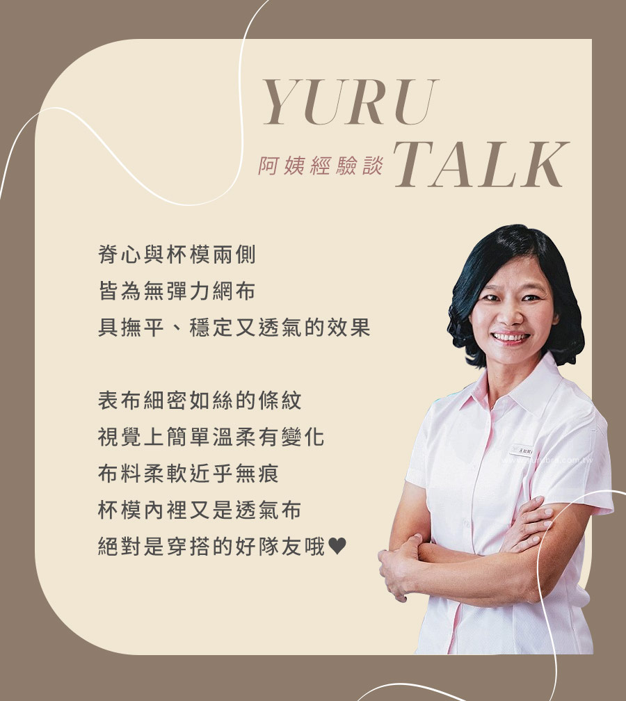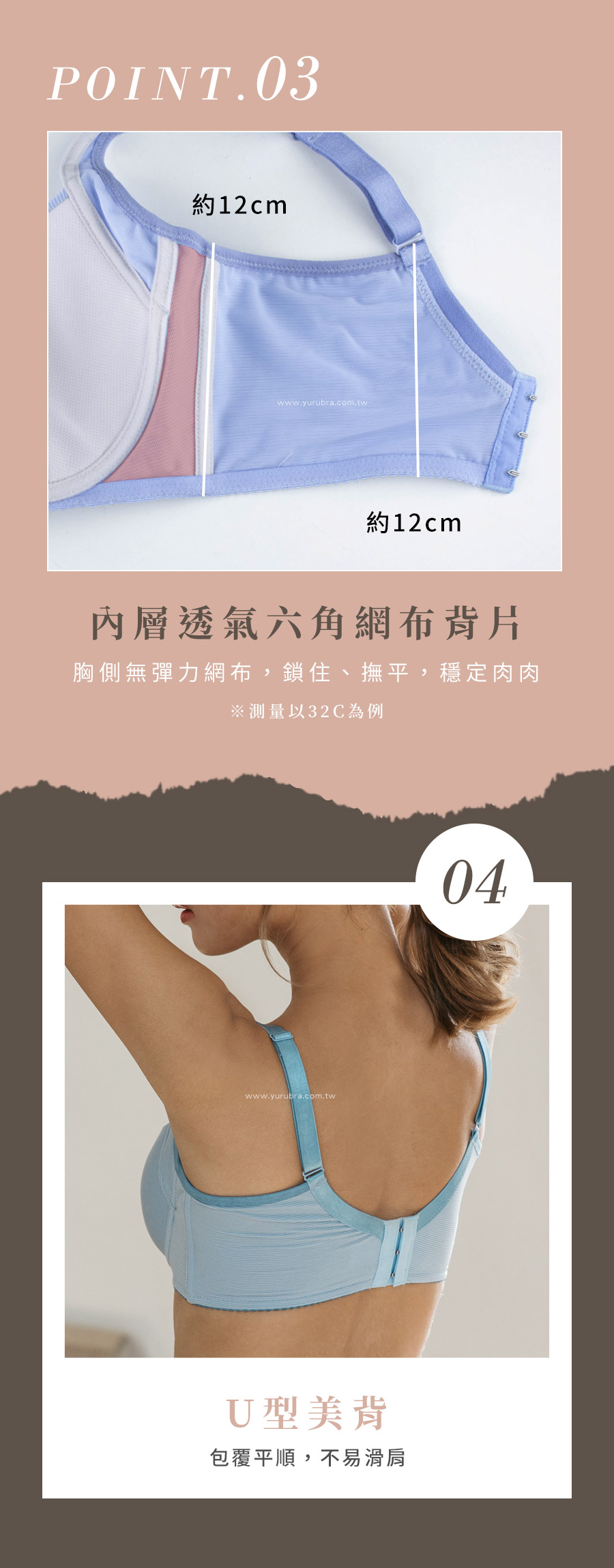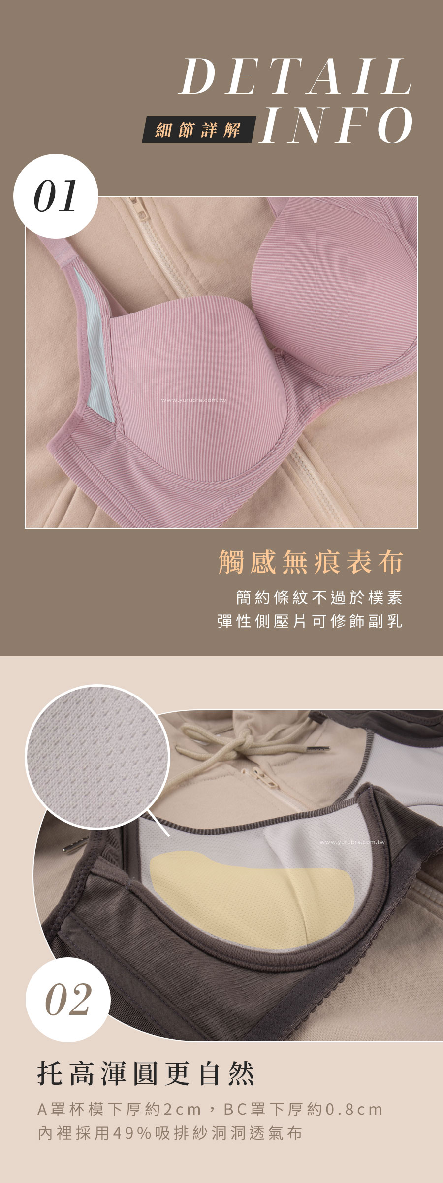 ★觸感無痕條紋表布,簡約不過於樸素 ★杯模內裡洞洞透氣布,更採用了49%吸排紗喔 ★ABC罩杯模均採下厚設計,托高渾圓更自然 ★彈性副乳側壓網布,藉由肩帶拉提,達到修飾副乳的效果 ★腋下採用單膠條,平順浮肉不壓迫 ★脊心處與胸側採無彈力網布,鎖住、撫平、穩定肉肉 ★U型美背包覆平順,不易滑肩 ★台灣製造,品質保證