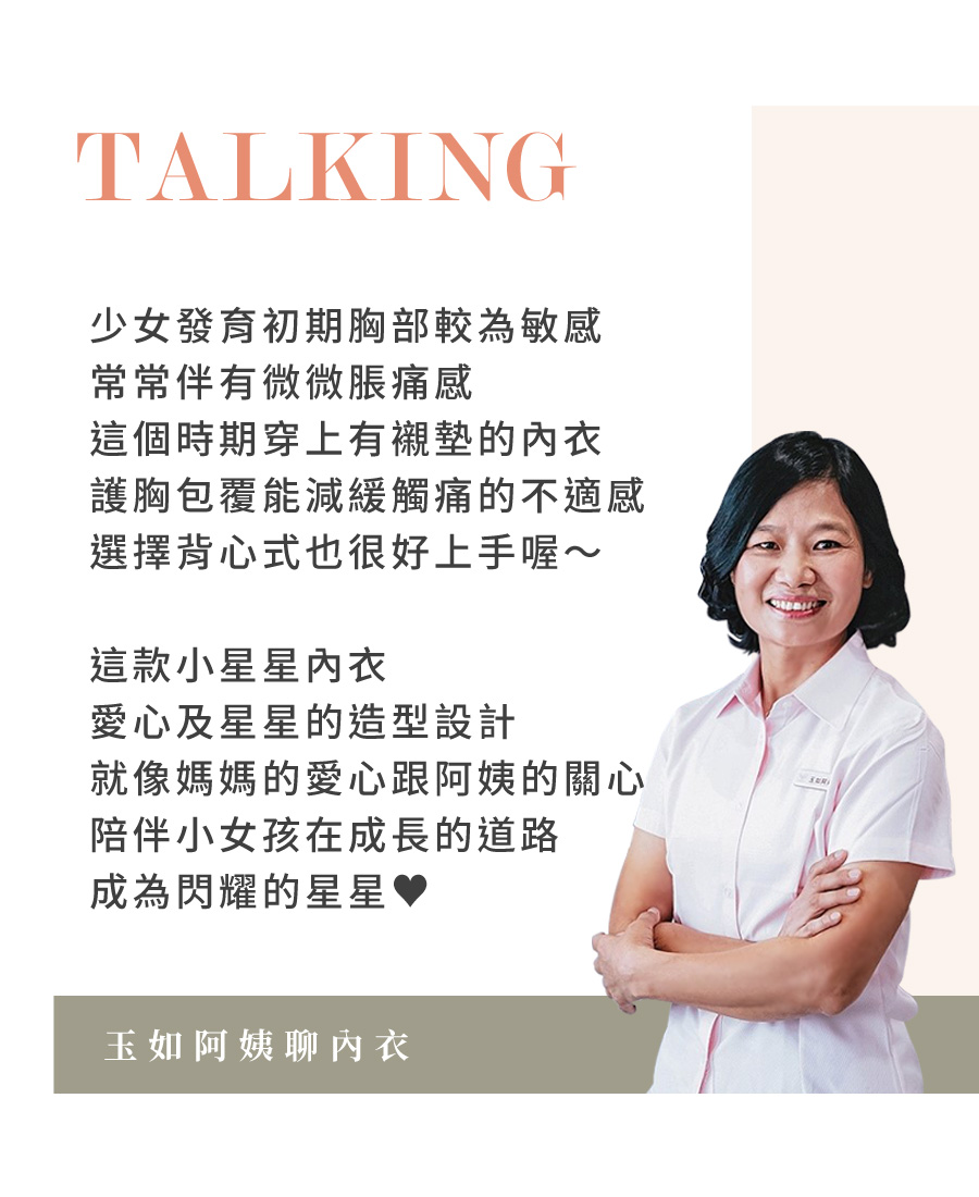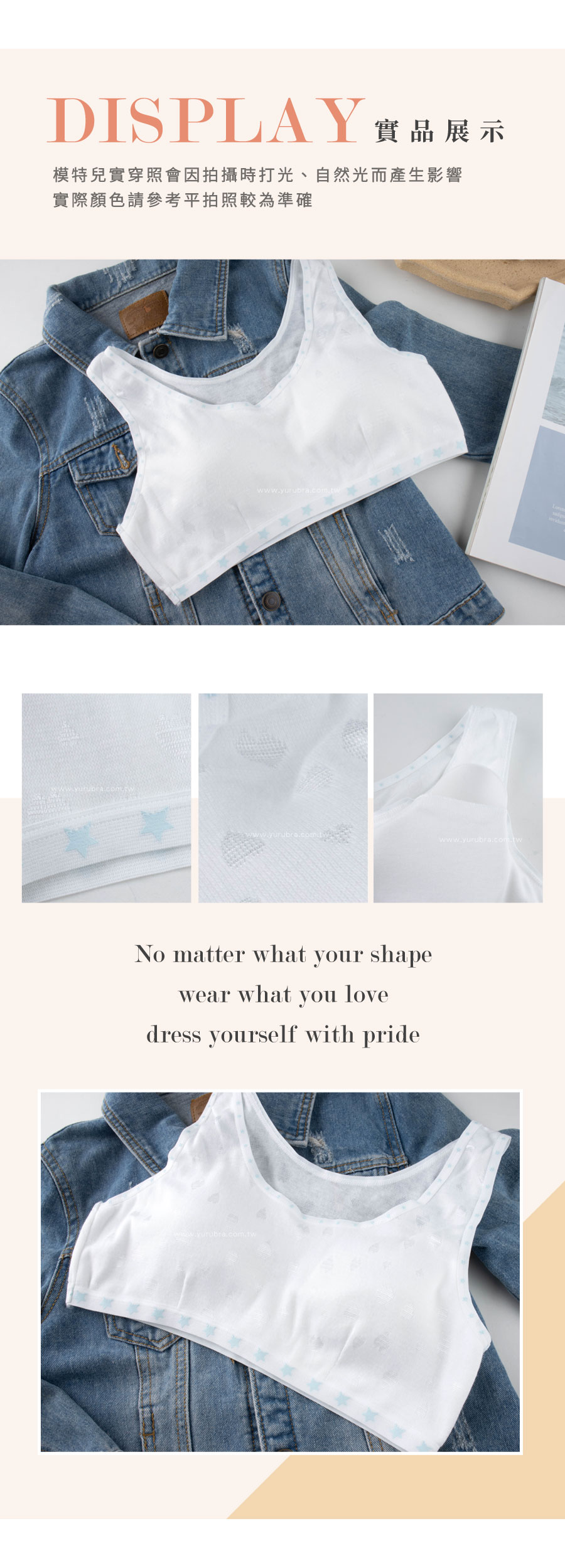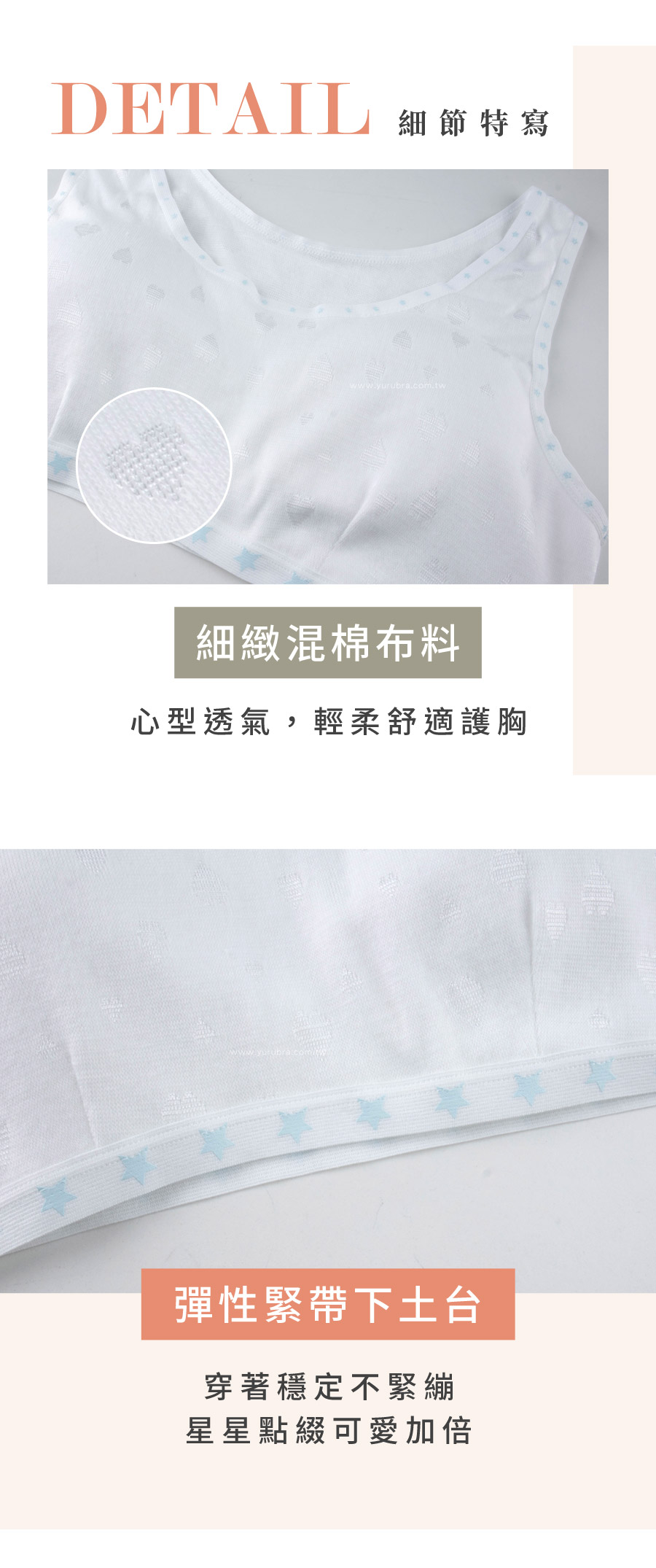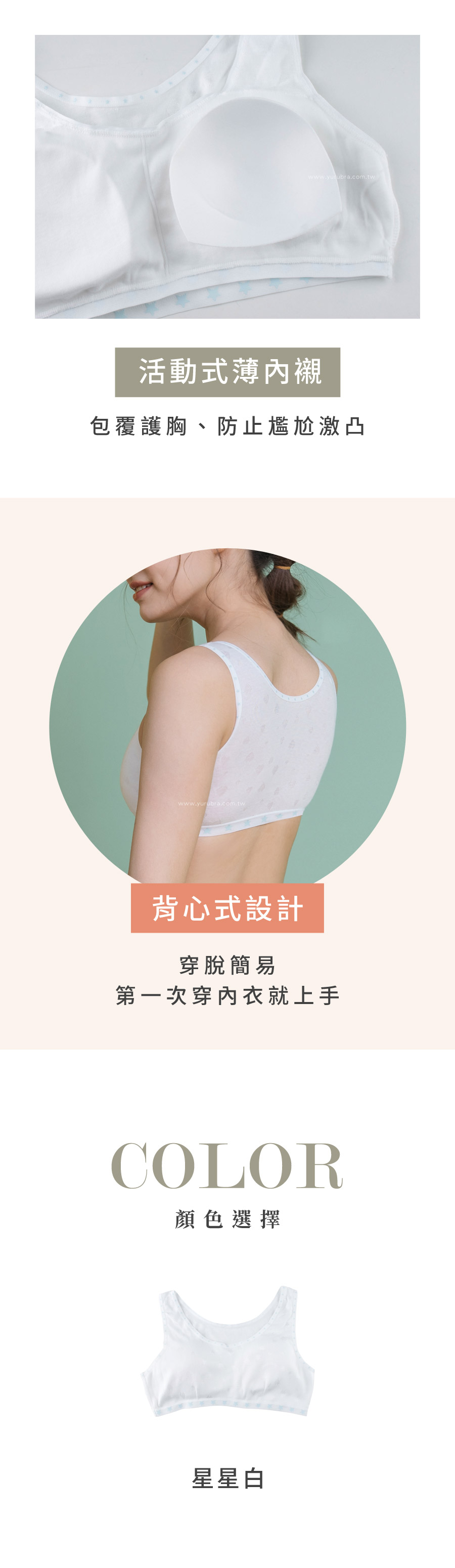 ★抬頭挺胸、自信成長,發育初期必備 ★輕柔包覆給胸部舒適的成長空間 ★心型透氣設計,穿著不易悶熱 ★彈性緊帶下土台,星星點綴可愛加倍 ★細緻混棉內裡,親膚呵護初發育的胸部 ★活動式薄內襯,包覆護胸防止尷尬激凸 ★背心式設計,穿脫簡易第一次穿內衣就上手 ★台灣製造,品質保證