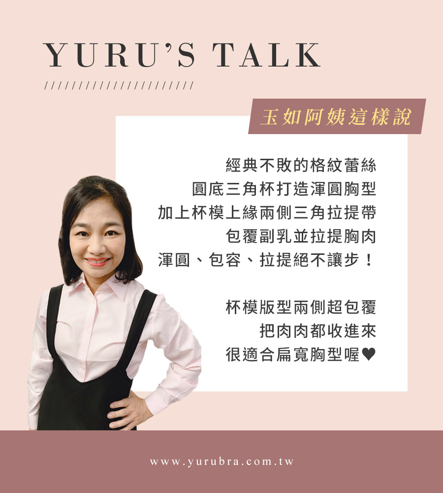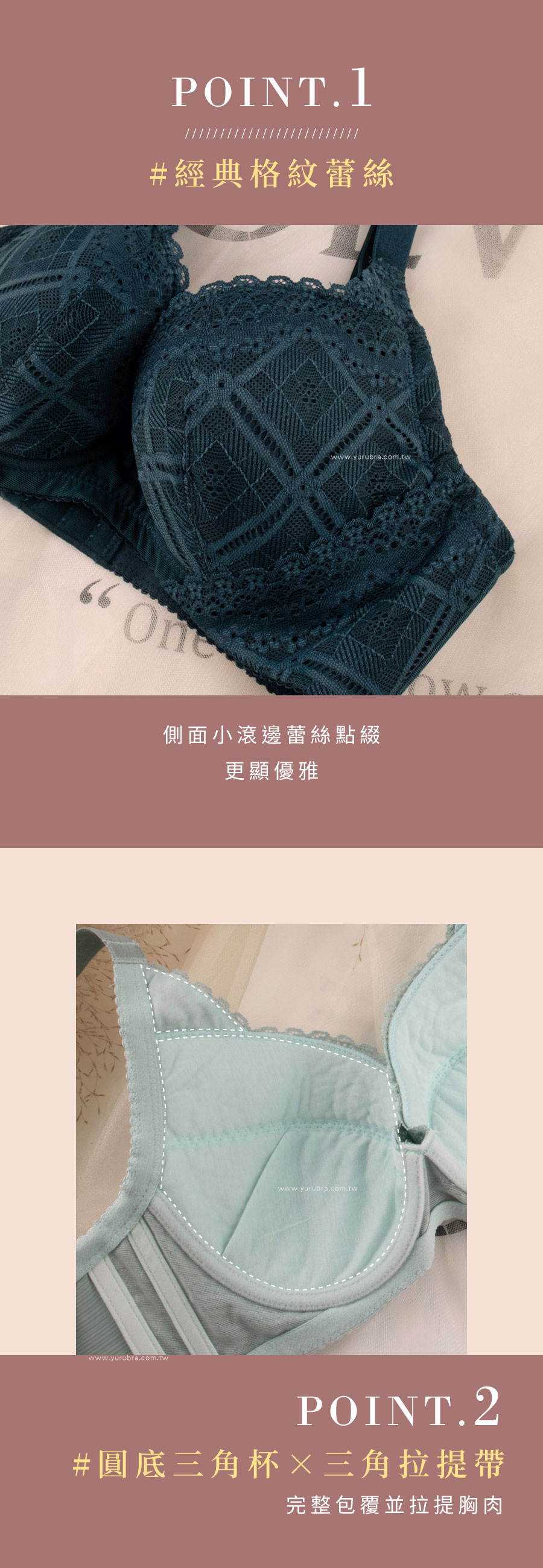 ★經典格紋蕾絲,讓妳在方寸之間展現自我 ★完美渾圓再拉提,框不住光芒四射的妳 ★圓底三角杯x三角拉提帶,完整包覆並拉提胸肉 ★兩側包覆的杯模版型,很適合扁寬胸型 ★背片內層輕柔涼感紗、外層六角塑身網布,兼俱涼爽與機能 ★分離式雙膠條,穩定側邊同時守住肉肉不位移 ★U型美背搭配三排三扣,穿著穩定 ★台灣製造,品質保證