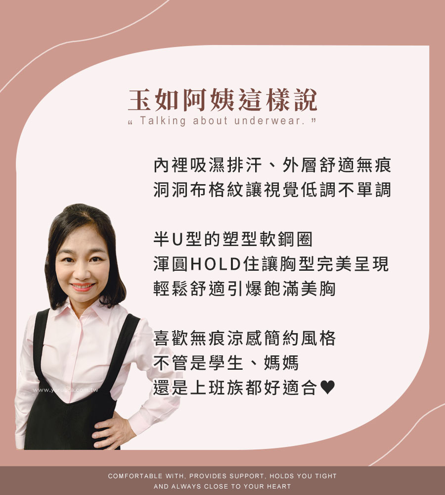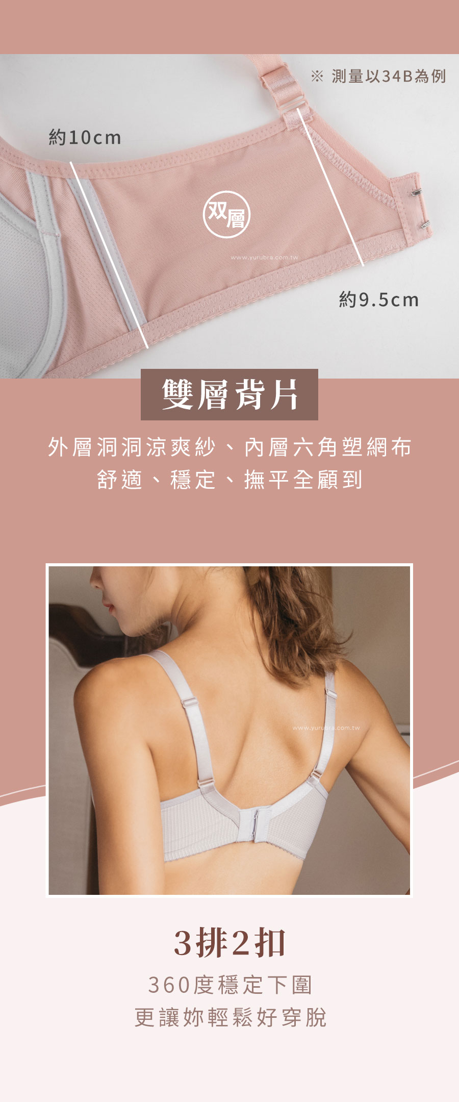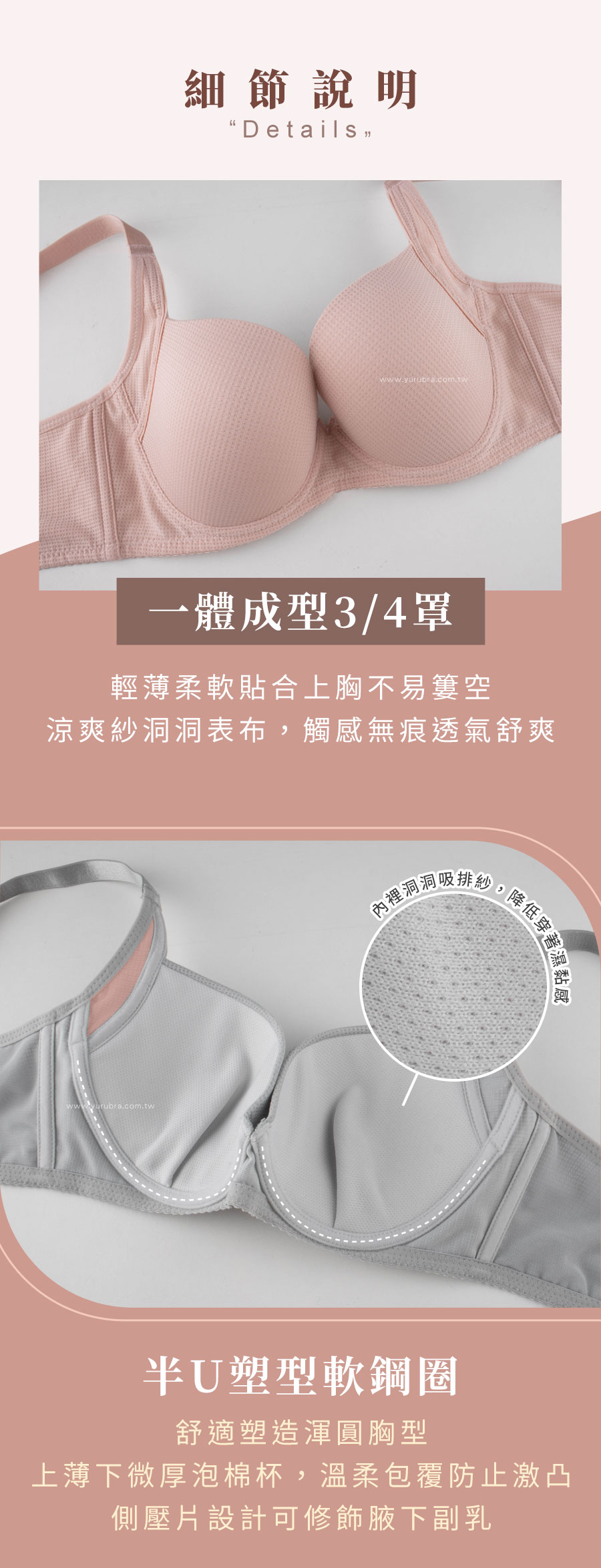 ★無痕飽滿奇蹟!舒適塑型,完美引爆! ★整件涼爽紗洞洞表布,觸感無痕透氣舒爽 ★一體成型3/4罩,輕薄柔軟不易激凸 ★內裡洞洞吸排紗,降低濕黏感、提升舒適感 ★上緣均薄約0.2公分貼合度超好,扁寬胸型也適合 ★半U塑型軟鋼圈,舒適塑造渾圓胸型 ★副乳側壓片設計,腋下副乳也能輕鬆修飾 ★背片外層洞洞透氣、內層涼爽材質,舒適、穩定、撫平全顧到 ★採用3排2扣,360度穩定下圍,更輕鬆好穿脫 ★台灣製造,品質保證
