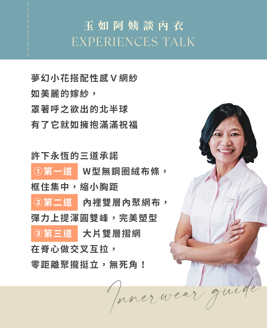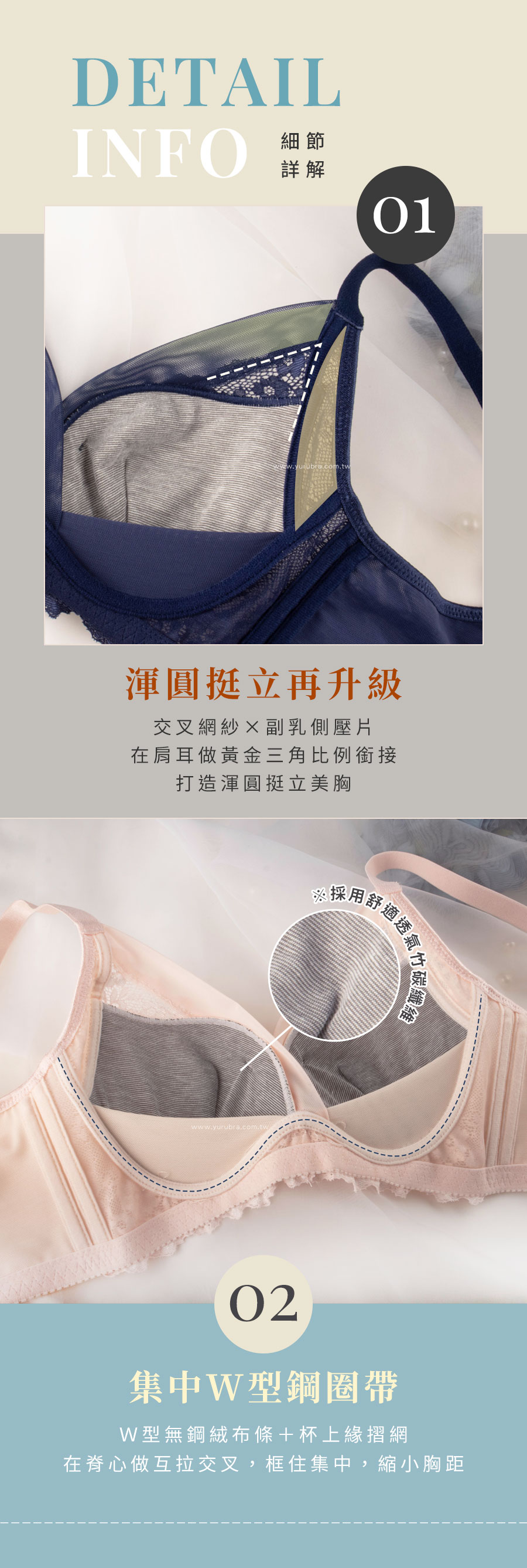 ★夢幻小花搭配性感網紗,如美麗的嫁紗,擁抱滿滿祝福的承諾 ★渾圓挺立再升級的『三道關卡』,溫柔守護,關關拉近! ★第一道:W型無鋼圈絨布條,框住集中,縮小胸距 ★第二道:內裡雙層內聚網布,彈力上提渾圓雙峰,完美塑型胸部 ★第三道:大片雙層摺網,在脊心做交叉互拉,零距離聚攏挺立,無死角! ★挺立杯型做V溝剪裁,視覺超誘惑,美麗再破表 ★側壓片與上提內聚網布做黃金三角比例銜接,打造渾圓挺立美胸 ★內裡採用竹碳纖維,吸濕除臭給你最舒適的穿著體驗 ★雙層背片搭配三排三扣,穿著穩定內衣不易走位 ★台灣製造,品質保證