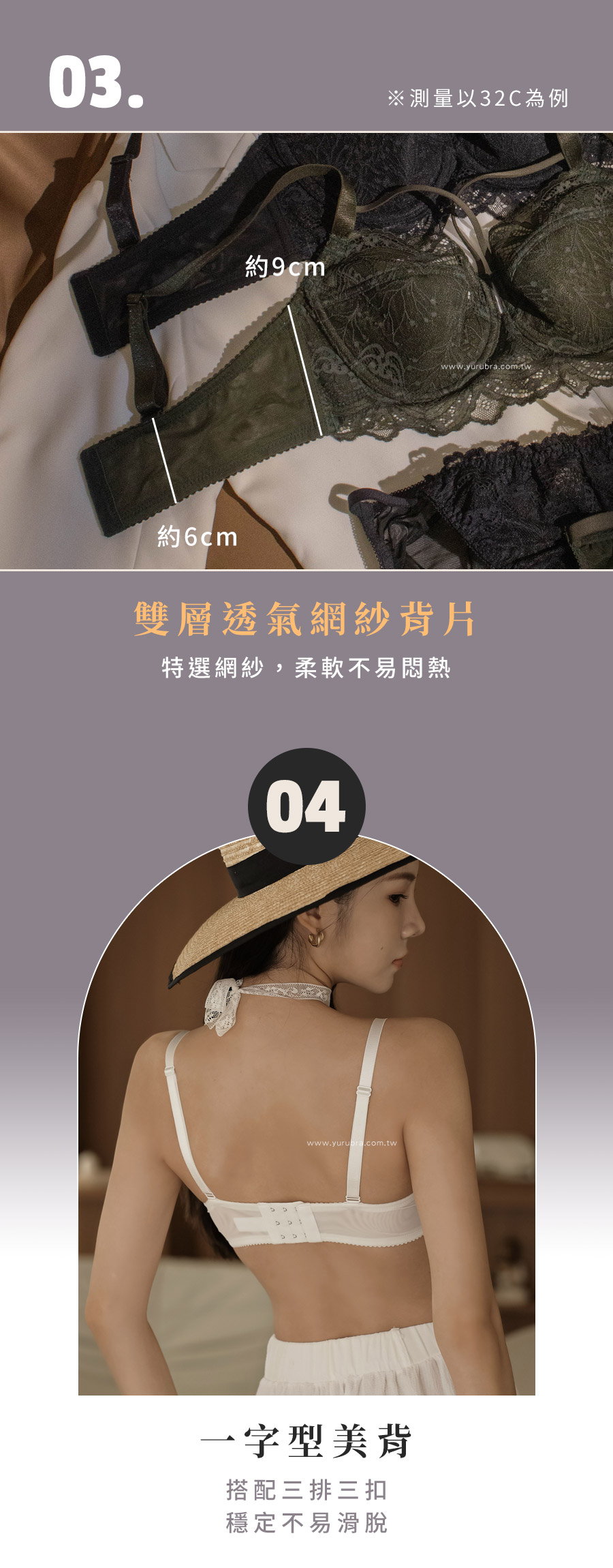 ★輕若羽毛、柔似雲朵的蕾絲,直叫人觸動心魂 ★經典法式罩杯設計,清透卻又看不透的極致迷人 ★杯模3mmQ棉×肩耳摺網,溫柔巧力豐托 ★脊心與側邊採用無彈摺網布,更加強穩定撫平 ★無彈摺網布一路連接至背片,360度環繞,達到完美平衡,不易走位、外擴! ★X型美胸織帶×細緻蕾絲×交叉簍空脊心設計,連自己都能迷上自己 ★胸下弧形蕾絲設計,修飾浮肉而顯內斂甜美 ★台灣製造,品質保證