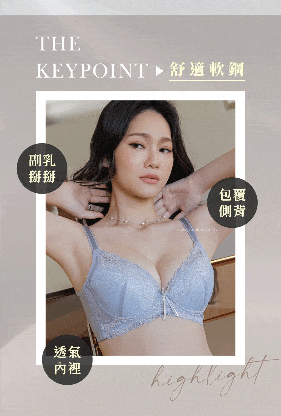 蕾絲表布:尼龍68%,嫘縈18%,彈性纖維14% 罩杯裡布:聚酯纖維100% 後片網布:尼龍75%,彈性纖維25%