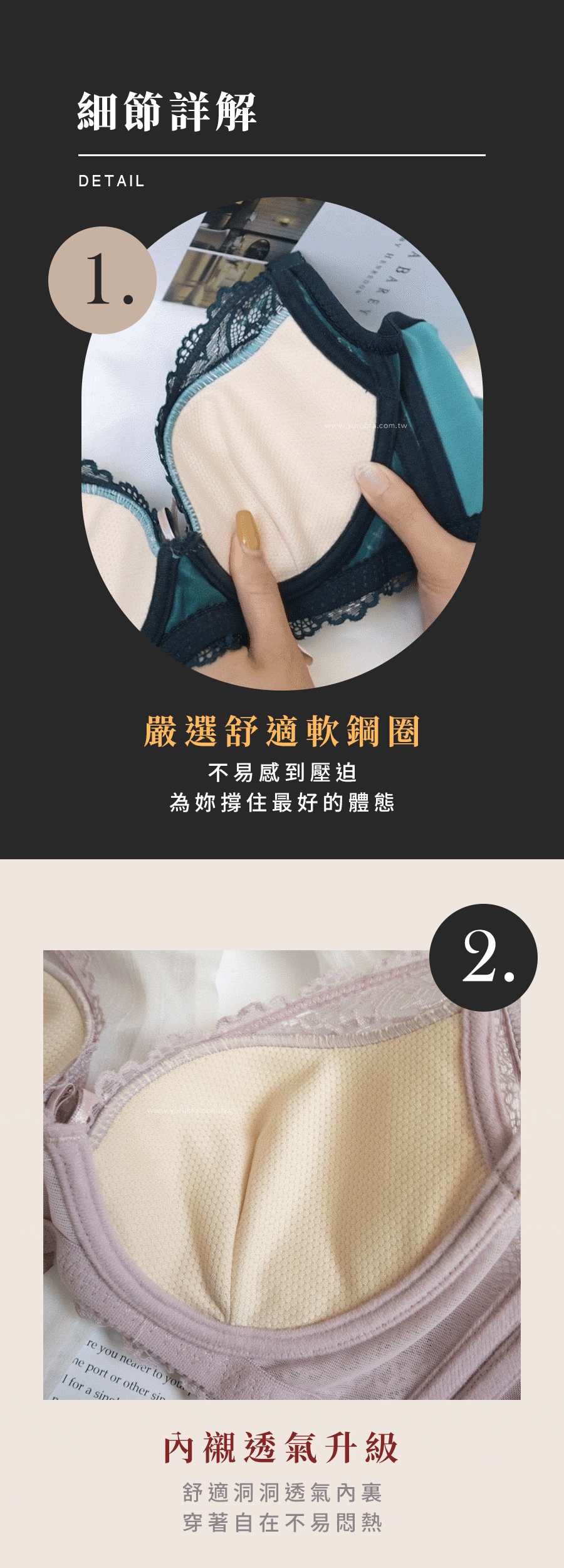 ★整天無壓迫的舒適,包覆又服貼的口碑款 ★嚴選舒適J型軟鋼圈,也能打造好胸型 ★美麗的蕾絲,如享受著一場豐盛的森林饗宴 ★透氣升級,內裡洞洞布穿著不易悶熱 ★即使妳忙碌一整天也不感到壓迫,為妳撐住最好的體態 ★副乳側推片有效包裹腋下贅肉,讓腋下肉肉安分守己 ★雙膠條側壓設計,增加胸部的穩定性 ★側邊加高修飾浮肉絕不漏網,穿著更安心 ★U型美背設計,穿出完美身影 ★一定不能錯過的首選日常內衣 ★台灣製造,品質保證
