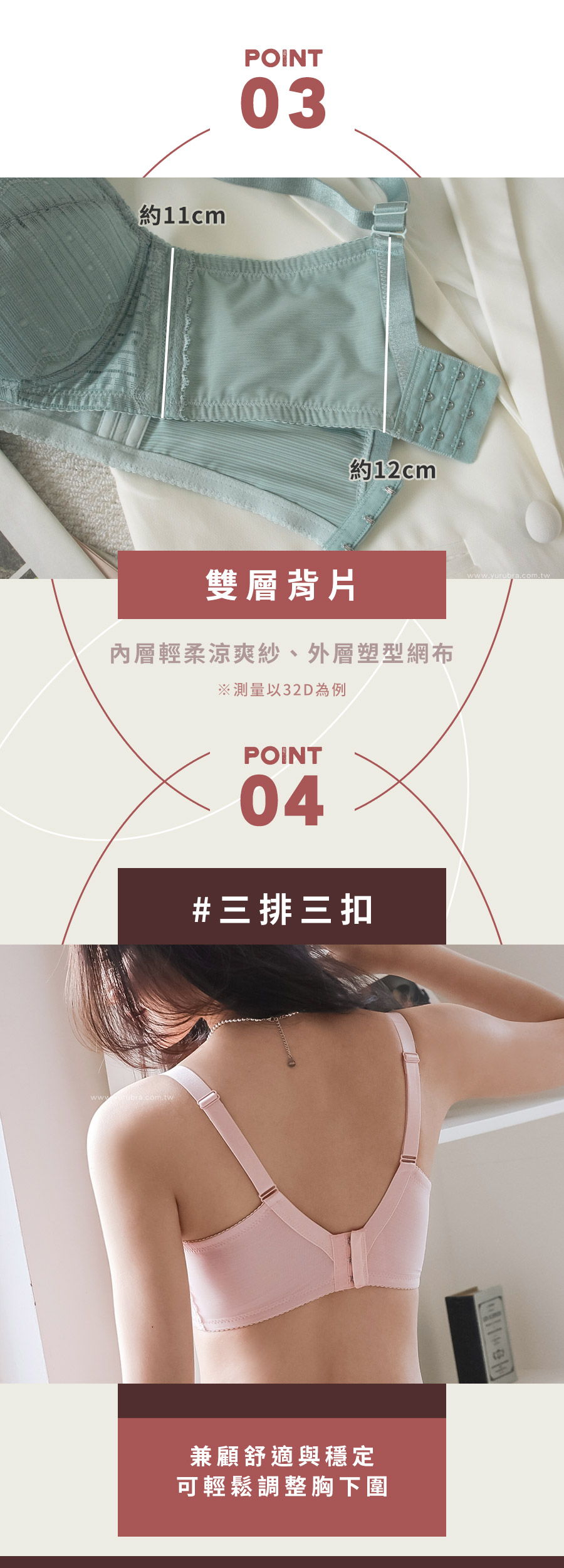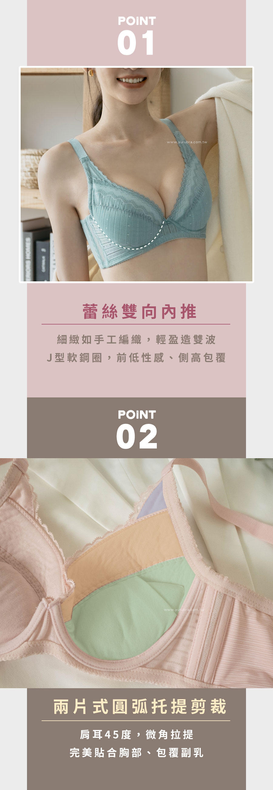 ★雙向內推蕾絲,細緻親膚,營造輕盈可愛美波 ★杯內兩片圓弧托提,打造飽滿圓潤曲線 ★杯上45度三角帶,穩定拉提力道,使胸型貼合不易簍空 ★採用前低側高的J型軟鋼圈,側包覆防擴,肉肉更集中 ★可卸式Q彈水餃襯墊,可根據自身需求調整 ★肩帶加寬約1.8CM,釋壓更穩定 ★腋下雙膠條加強穩固,側收撫平包覆肉肉 ★外層超細塑型網布×內層涼爽紗柔細布料,舒適撫平背部 ★U型美背設計,讓背部曲線更美好 ★台灣製造,品質保證