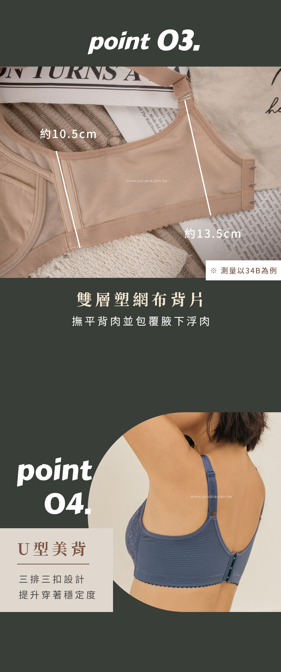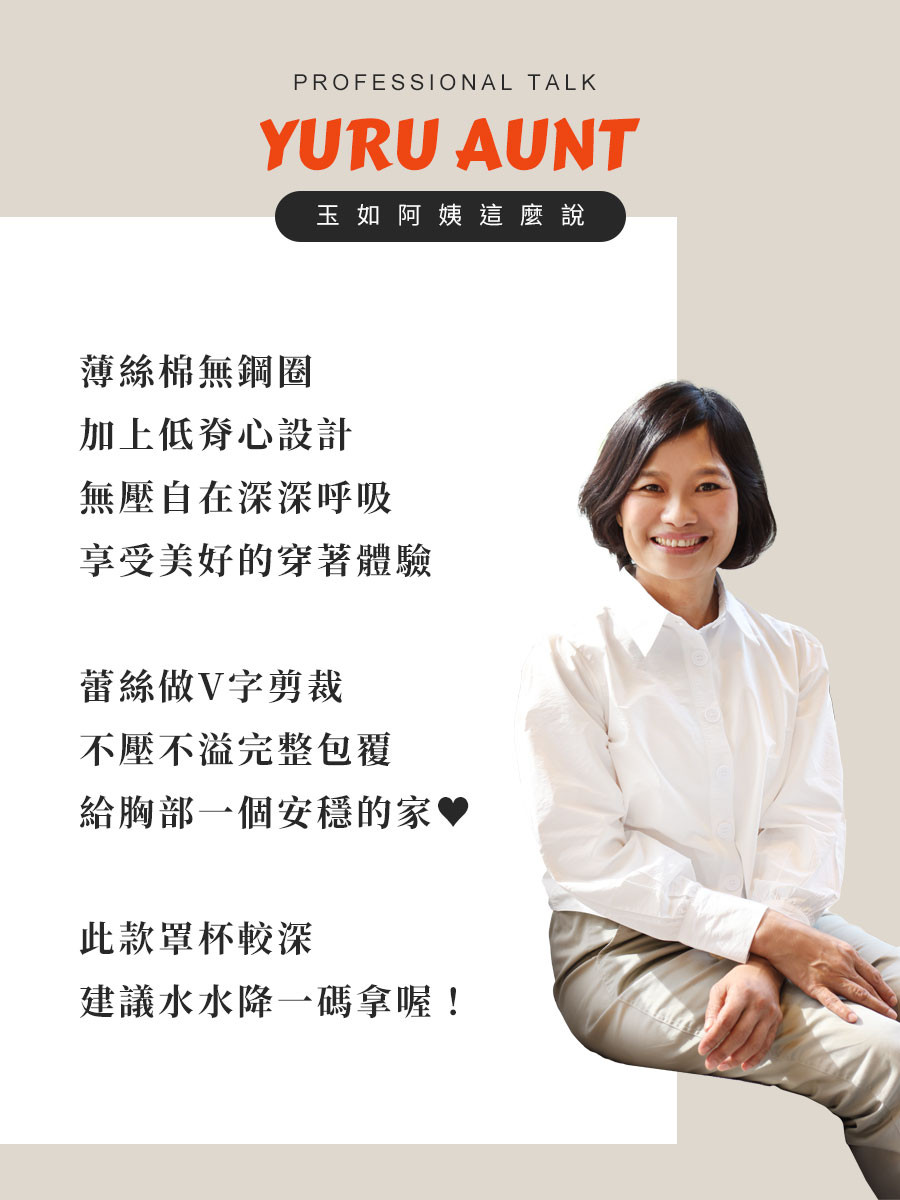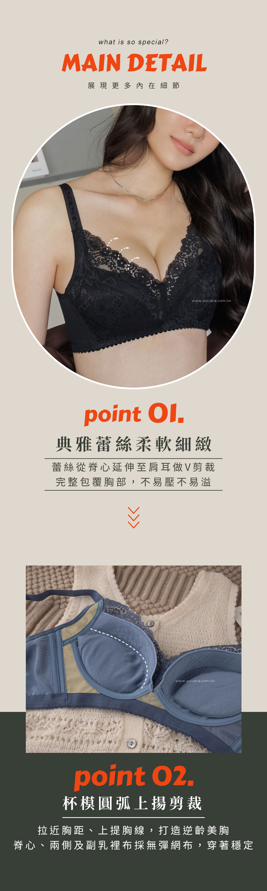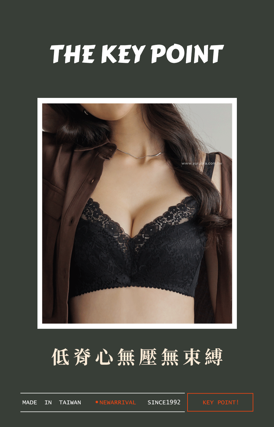★合手拱胸無鋼圈內衣,舒適、上提、包覆全到位! ★典雅蕾絲柔軟細緻,勾勒專屬妳的獨特韻味 ★低脊心無壓無束縛,輕鬆自在穿著體驗 ★蕾絲從脊心延伸至肩耳做V剪裁,給胸部一個安穩的家 ★杯模圓弧上揚剪裁,拉近胸距、上提胸線,打造逆齡美胸 ★脊心、兩側及副乳裡布採無彈力透氣網布,穿著穩定 ★薄絲棉杯裡,親膚舒適又透氣 ★下土台採用2公分寬鬆緊帶,360度穩固下圍 ★U型美背搭配三排三扣,穿著美麗又穩定 ★台灣製造,品質保證