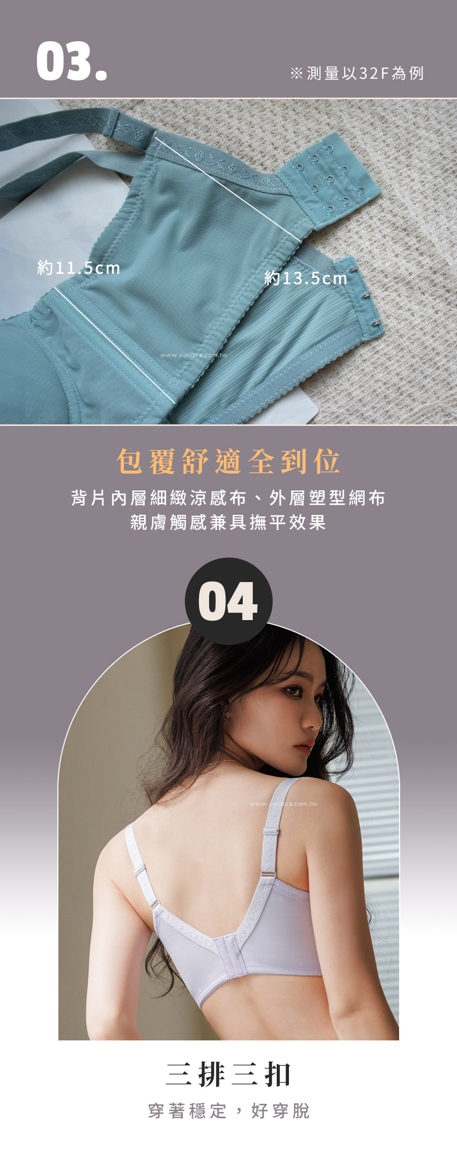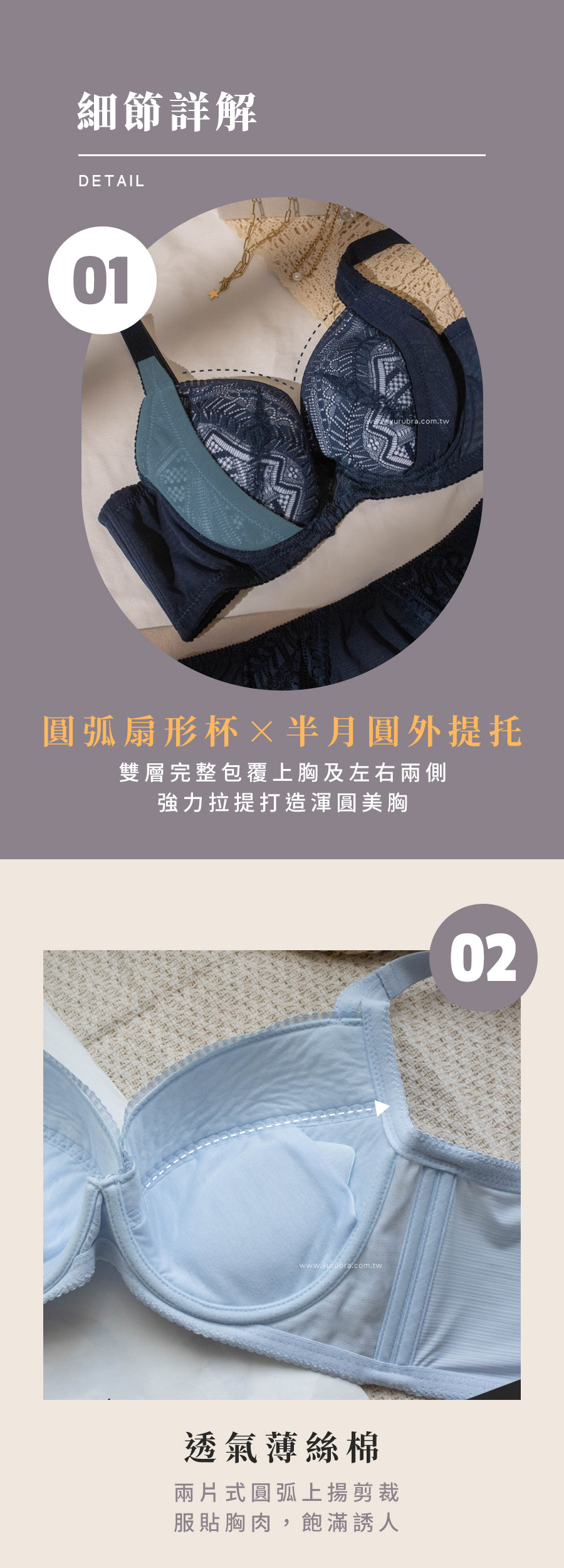 ★蕾絲輕柔如扇子舞動光影,渾圓動感 ★透氣薄絲棉,圓弧上揚剪裁,更加貼胸飽滿 ★圓弧扇形杯+半月形外提托,兩側強力集中深邃美溝 ★V字深溝剪裁,更顯迷人曲線 ★可卸式Q彈水餃襯墊,可根據自身需求調整 ★肩帶加寬約1.8CM,釋壓更穩定 ★腋下雙膠條加強穩固,側收撫平包覆肉肉 ★外層超細塑型網布×內層親膚柔細涼感布料,舒適的撫平背部浮肉 ★U型美背設計,讓背部曲線更美好 ★台灣製造,品質保證