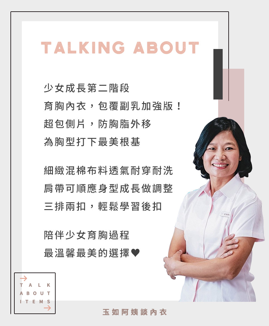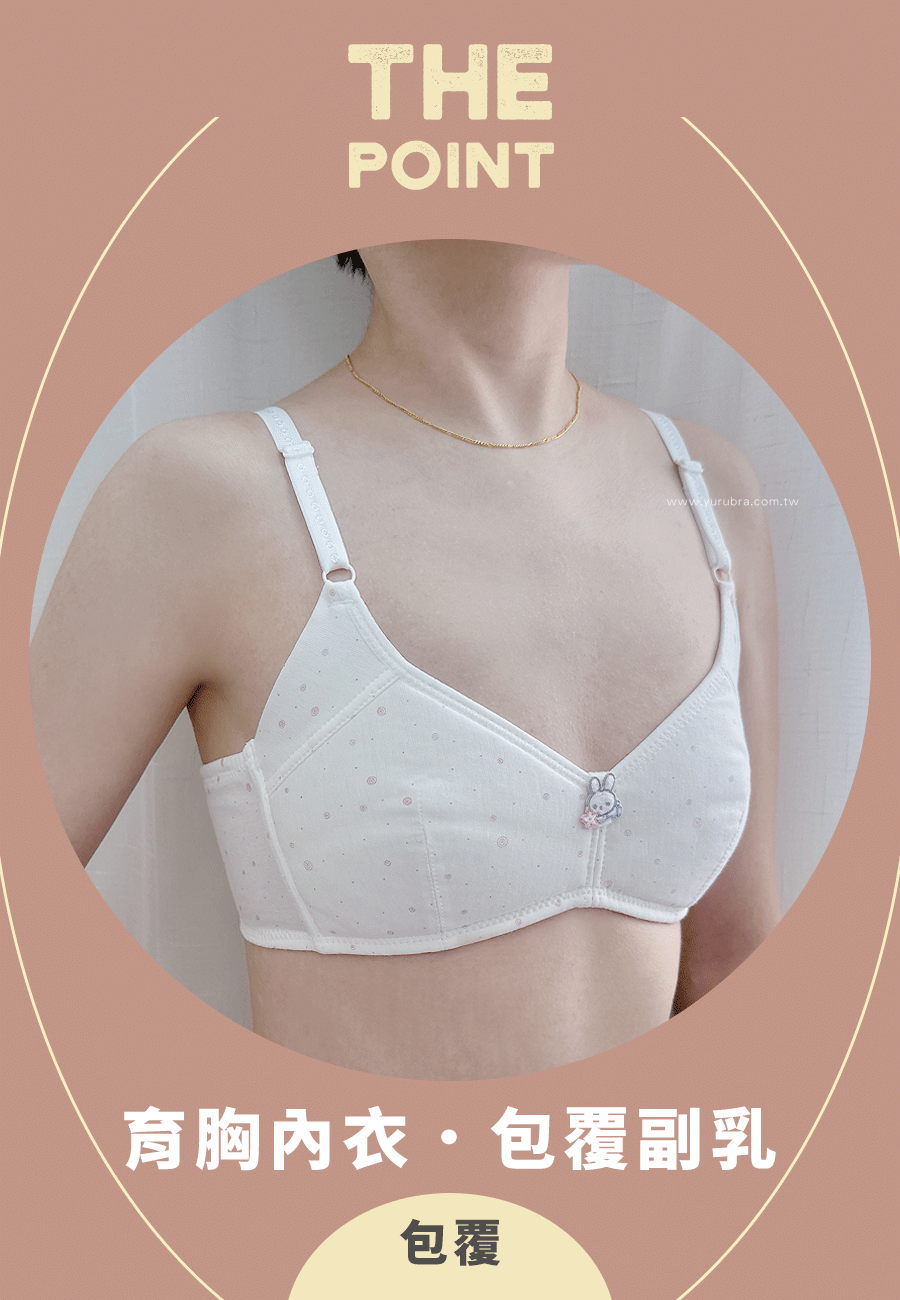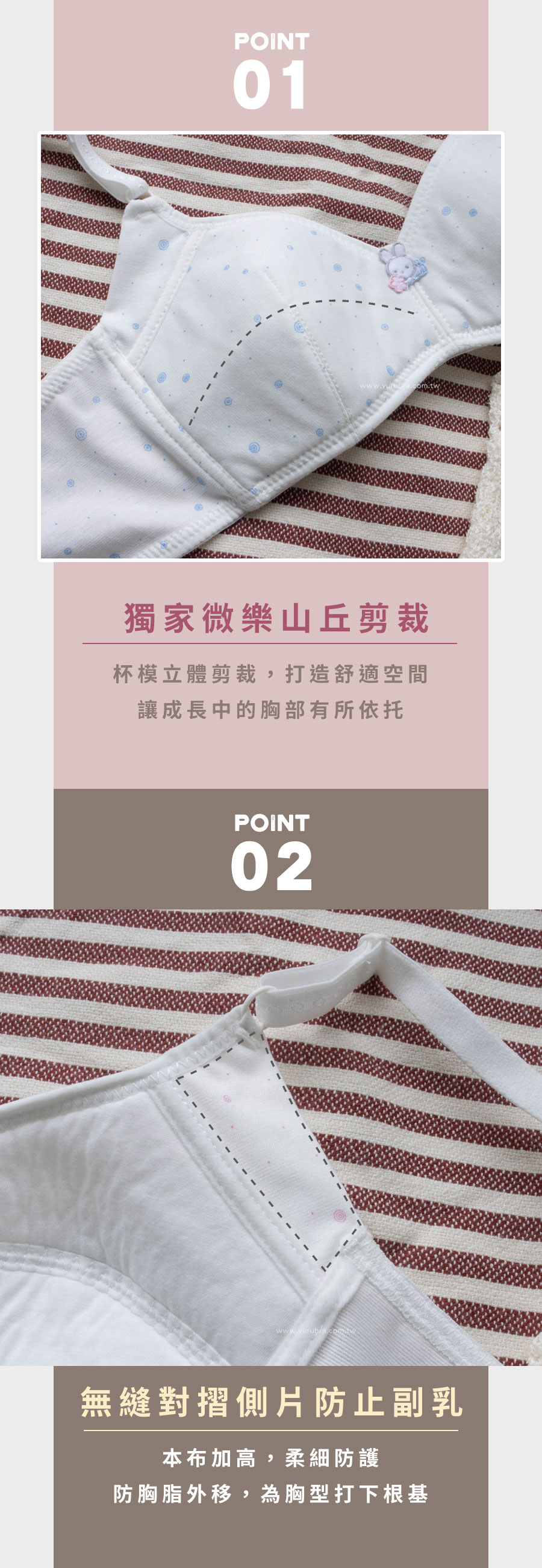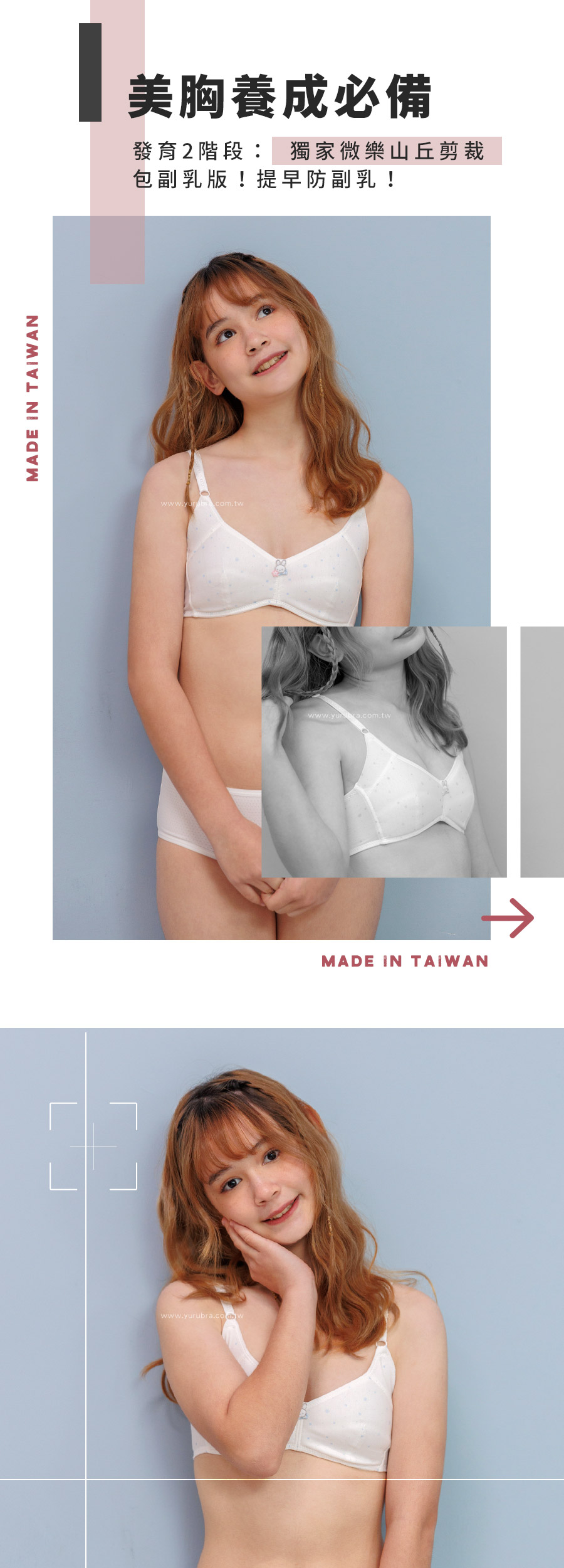 ★獨家山丘剪裁,包覆舒適有育胸空間 ★本布加高,邊緣無縫摺布設計,溫柔守護胸型,打下美麗根基 ★無鋼圈育胸內衣,避免壓迫讓胸部發育自然成形 ★左右伸縮棉讓胸部舒適成長 ★腋下舒適軟膠條,使胸肉長在正確的位置 ★可調式肩帶,可依身高變化,隨時調節 ★小U型背片,輕盈不厚重 ★3排2扣穿脫無障礙,簡單練習後扣 ★這件很適合發育準備期(未發育~發育初期)的小少女 ★台灣製造,品質保證