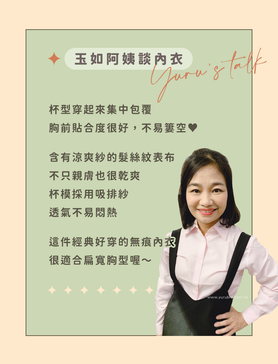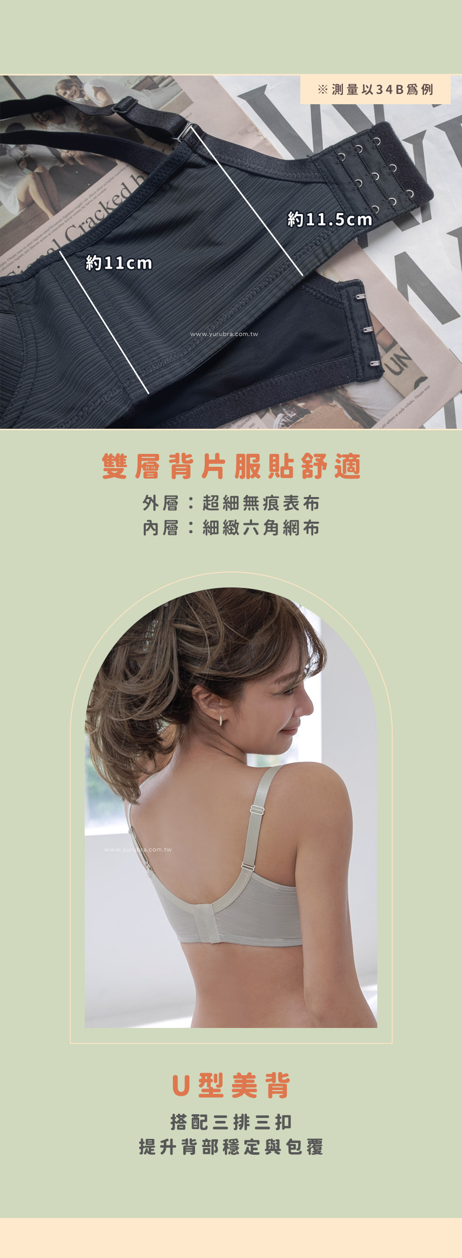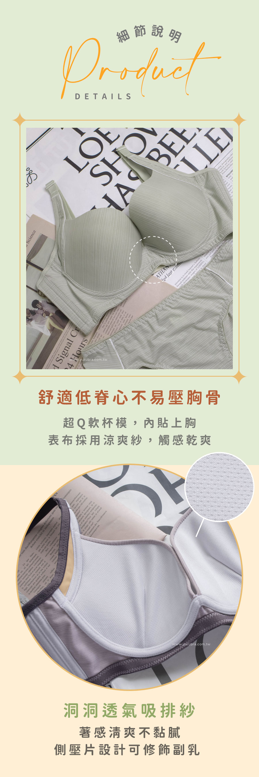 ★表布採用涼爽紗,膚觸乾爽好輕盈 ★超細髮絲紋布料,穿衣無痕不露痕跡 ★冷淡色系,質感又顯白! ★低脊心,穿著舒適不易壓迫胸骨 ★杯模內貼,集中包覆,不容易簍空喔 ★內裡吸排紗,讓你的夏天清爽不黏膩 ★無彈力網布側壓片,包覆腋下惱人小肉肉 ★腋下採用雙併軟膠條,穿著更加穩定 ★背片內裡為雙層六角網布,透氣兼具包覆 ★U型美背與三排扣,讓身形顯瘦又完美 ★台灣製造,品質保證
