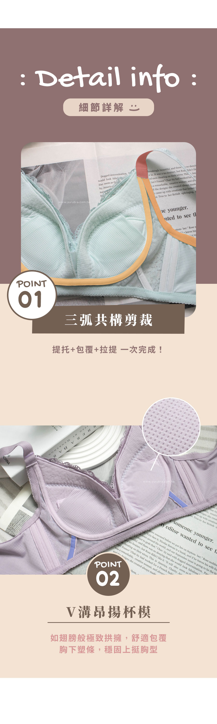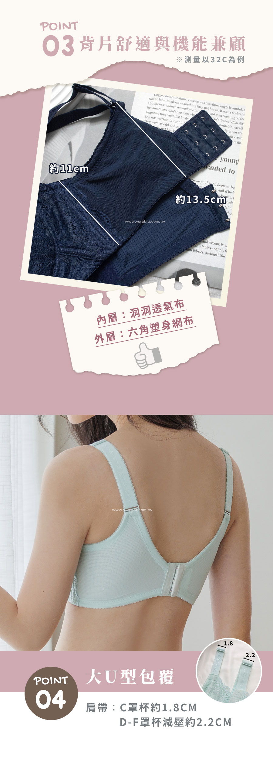★絲棉洞洞薄杯,極度透氣舒適 ★無鋼圈布條×腋下緊帶×肩帶,三弧共構,強力拉提胸線 ★昂揚杯型,如天使翅膀,極致拱擁包覆~ ★胸下45°塑條,穩固上挺胸型 ★內裡洞洞透氣布,穿著舒適不易悶熱 ★無鋼圈天鵝絨布條,親膚柔軟,胸骨凸、雞胸、胃凸的女孩都適合! ★脊心網布,更拉近胸距 ★胸前V型剪裁,柔軟的布料也適合當替代的哺乳內衣 ★大U型背片,舒適包覆背部 ★台灣製造,品質保證
