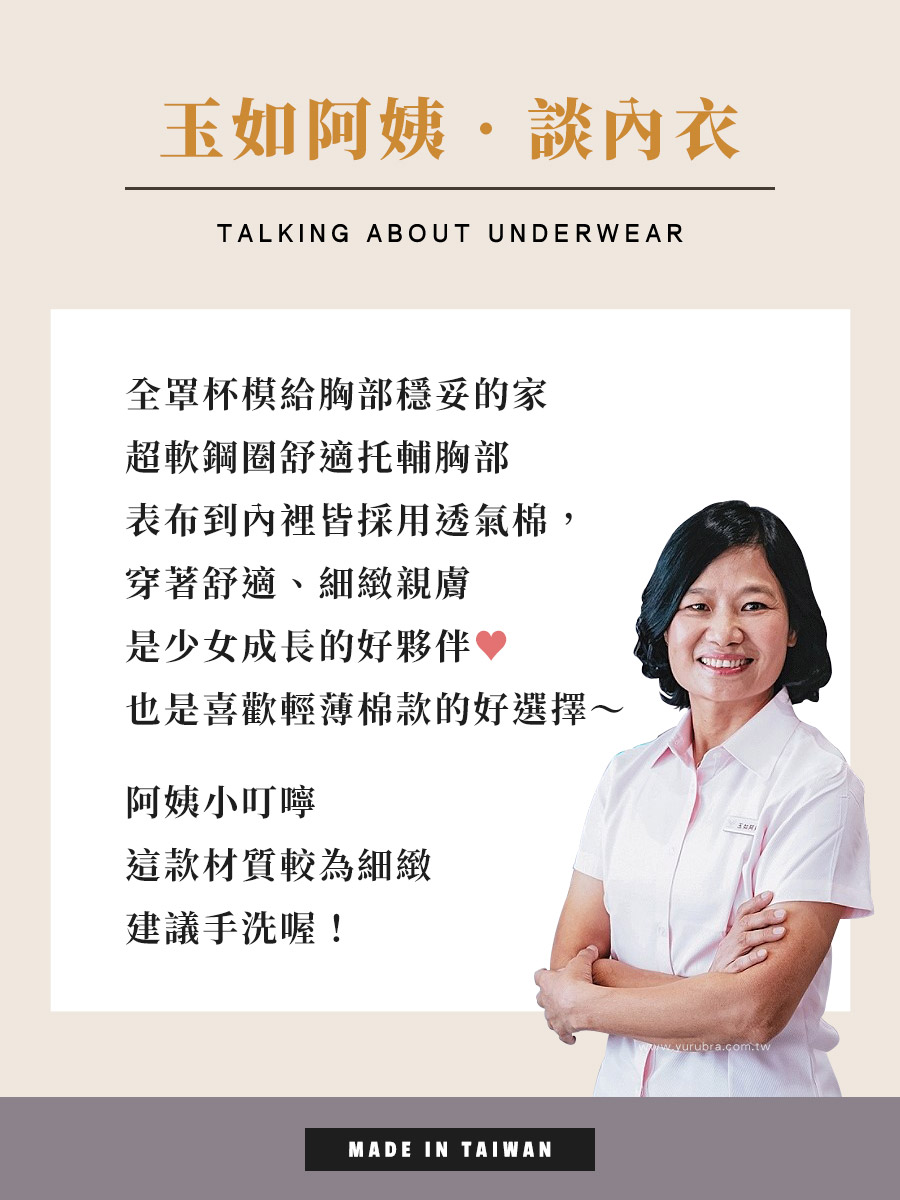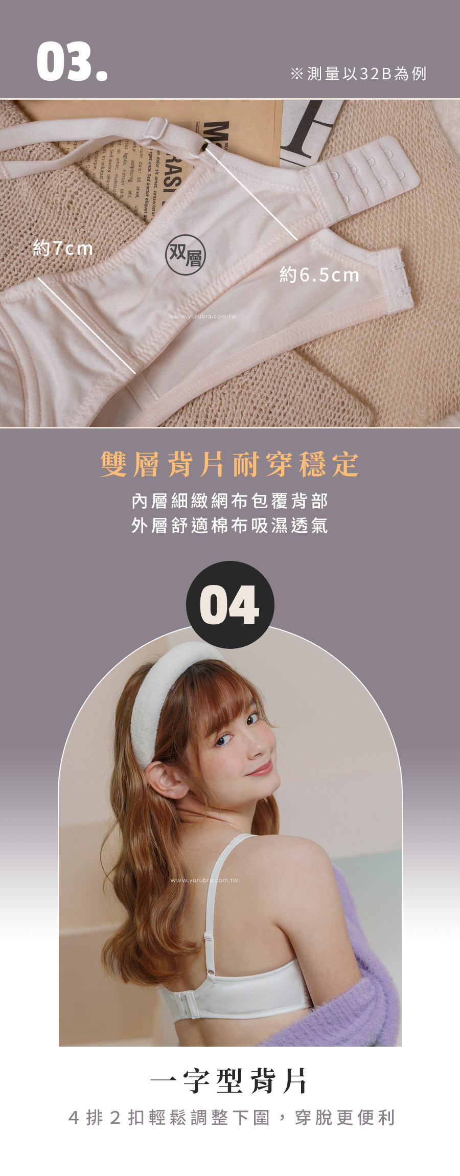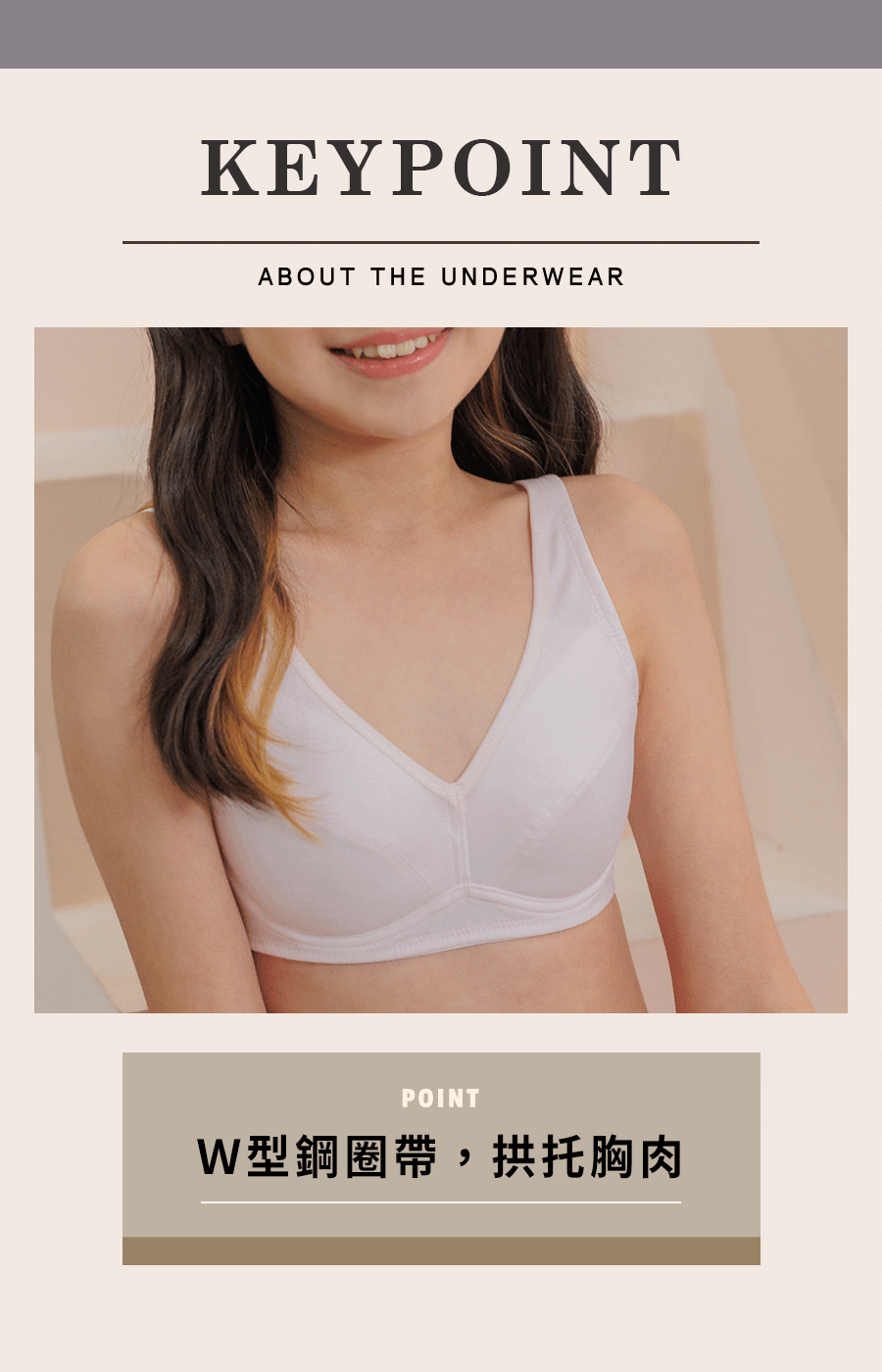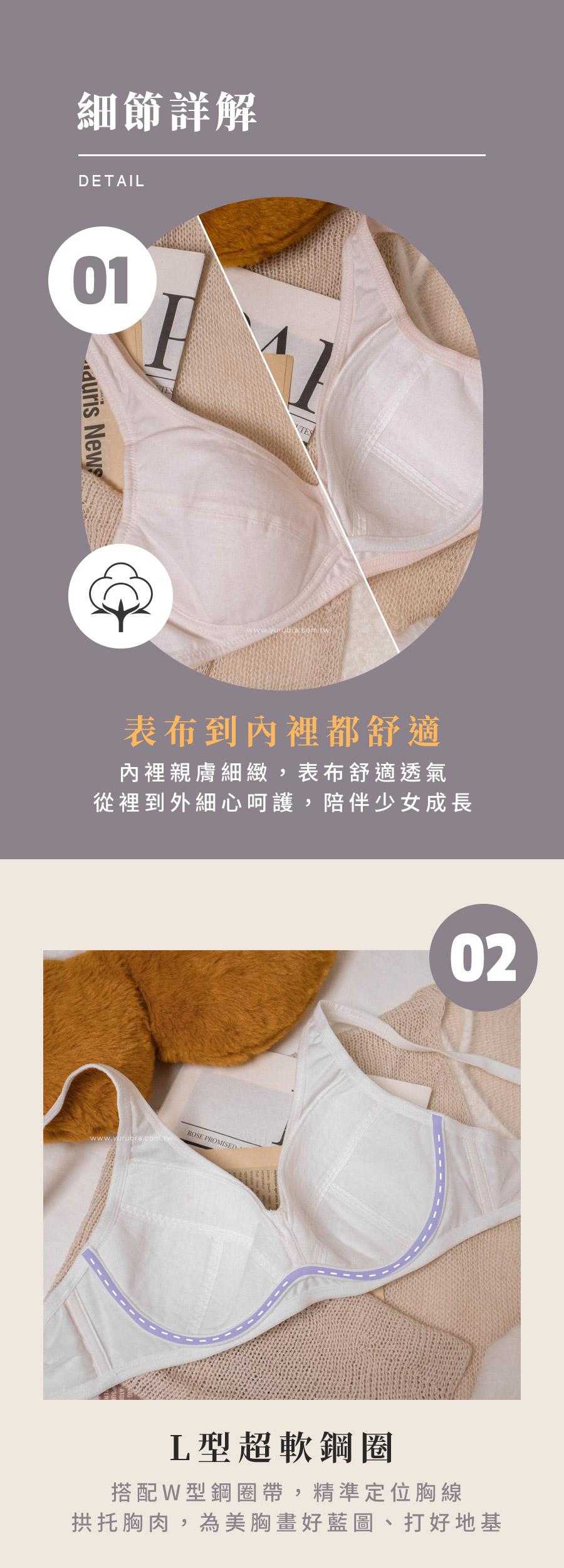 ★享受蛻變之美,由內而外的陪伴! ★小女孩建議發育初期(些微隆起)~成長期(漸有明顯胸型)的胸型穿著 ★輕盈的淡粉與米白,好搭不易透 ★W型鋼圈帶,精準舒適的拱托胸型 ★超軟鋼圈溫和支撐,育胸過程更穩定不壓迫 ★杯模內外優質棉料,親膚透氣開心穿 ★可調節肩帶,長度能隨身高變化調節 ★全罩版型,提供胸部更穩妥舒適的空間 ★4排2扣穿脫無障礙,根據身形變化調整更彈性! ★一字型雙層背片,輕柔支撐,不易移位 ★台灣製造,品質保證