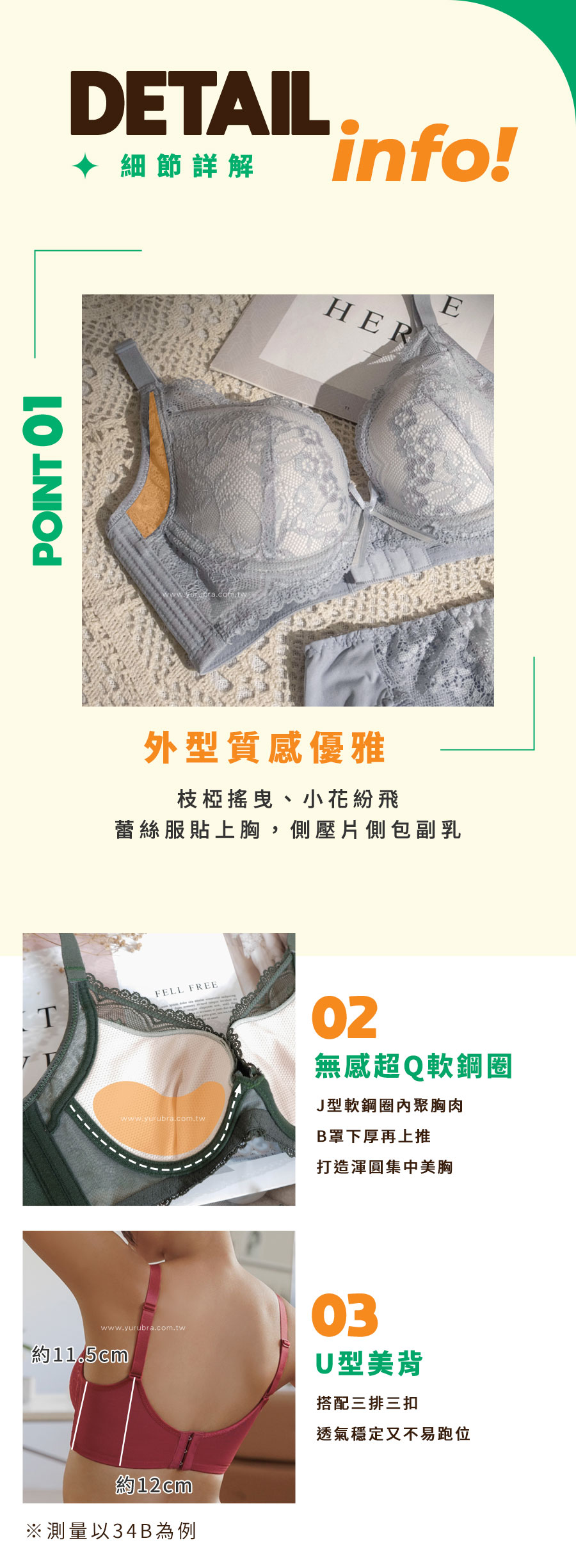★波動紛飛的小花蕾絲,簇擁胸前深邃V溝 ★超Q軟J型鋼圈,細緻服貼 ★副乳側壓片,包覆腋下惱人小肉肉 ★上緣鬆緊帶鎖邊設計,擺脫簍空魔咒 ★杯裡洞洞透氣布,穿得清爽舒適 ★B罩下厚約2CM,神隊友托高胸肉更顯飽滿 ★側邊雙膠條穩定,並鎖住胸前肉肉不往後移 ★U型美背,單層背片柔軟飾身型 ★台灣製造,品質保證