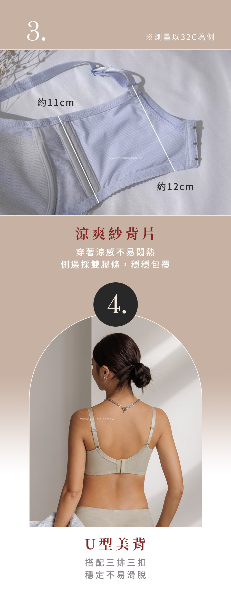 ★扁寬胸型的水水,這件服貼修飾效果很棒喔~ ★蕾絲貼合包覆,更顯來渾圓飽滿 ★深V的J型鋼圈設計,側包並把下胸穩定托住 ★蕾絲杯緣做鬆緊帶鎖邊,不易簍空外還能修飾大小胸 ★杯裡洞洞透氣布,穿得清爽舒適 ★超寬副乳側壓片,包覆力更上層樓 ★B罩杯下厚上薄,加強托高集中效果,展現飽滿曲線 ★腋下雙膠條穩定好穿,加強側壓包覆 ★外層透氣六角網布,內層涼感纖維布,全天保持舒適透氣 ★U型美背,讓妳的背影更顯動人 ★台灣製造,品質保證