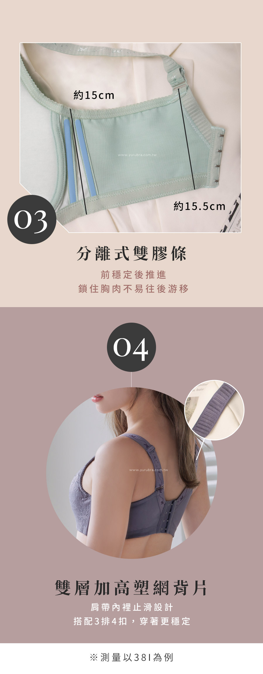 ★包覆力、提托力、舒適感,大胸水水需要的,通通都在這一件! ★採用高規格蕾絲,外觀無鋼圈帶痕跡,是內外兼備的大胸美型全罩內衣 ★蕾絲層疊如夜晚星芒,低調內斂又藏不住自身的光芒 ★內裡採膨膨透氣絲棉,S型上揚與三片式剪裁,提托包一件搞定 ★側土台雙層設計,棉布舒適貼近肌膚,無彈網布加壓撫平側肉 ★下土台採1.8公分寬絨布緊帶,脊心處做交叉剪裁,讓胸肉更靠近、下圍更釋壓 ★特殊規格2.2公分寬肩帶,分散肩膀承受的壓力,還有貼心的止滑設計喔 ★雙膠條撫平腋下肉肉,並鎖住胸肉不往後游移 ★背片採雙層加高塑身網布,包覆撫平全部到位 ★三排四扣設計,提升穿著穩定性 ★台灣製造,品質保證