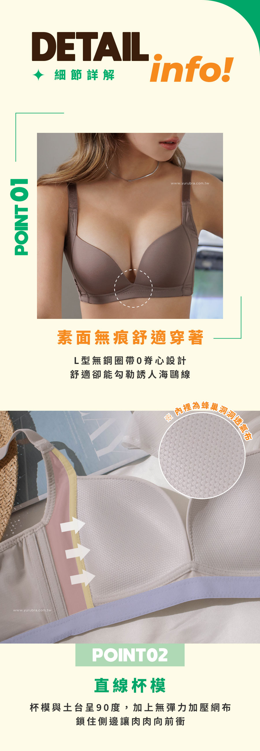 ★無鋼圈大革命!肉肉向前爆衝,平原一秒變山峰! ★不可思議的堆高效果,拯救鬆軟、下垂、外擴 ★挺立杯模,直線拉提讓平原秒變山峰 ★無彈力加壓網布從杯模下方到肩耳,有如穩固高牆守護胸肉 ★蜂巢洞洞布內裡,舒適透氣不易悶熱 ★無痕超細表布貼合上胸,緊身、薄紗,大膽搭 ★0脊心設計,舒適卻能勾勒誘人海鷗線 ★超包副乳設計,柔細緊帶包邊,不易磨擦肌膚 ★腋下採雙迸膠骨,守住腋下肉肉不位移 ★雙層加高V型美背,配褲後方交叉簍空設計 ★台灣製造,品質保證