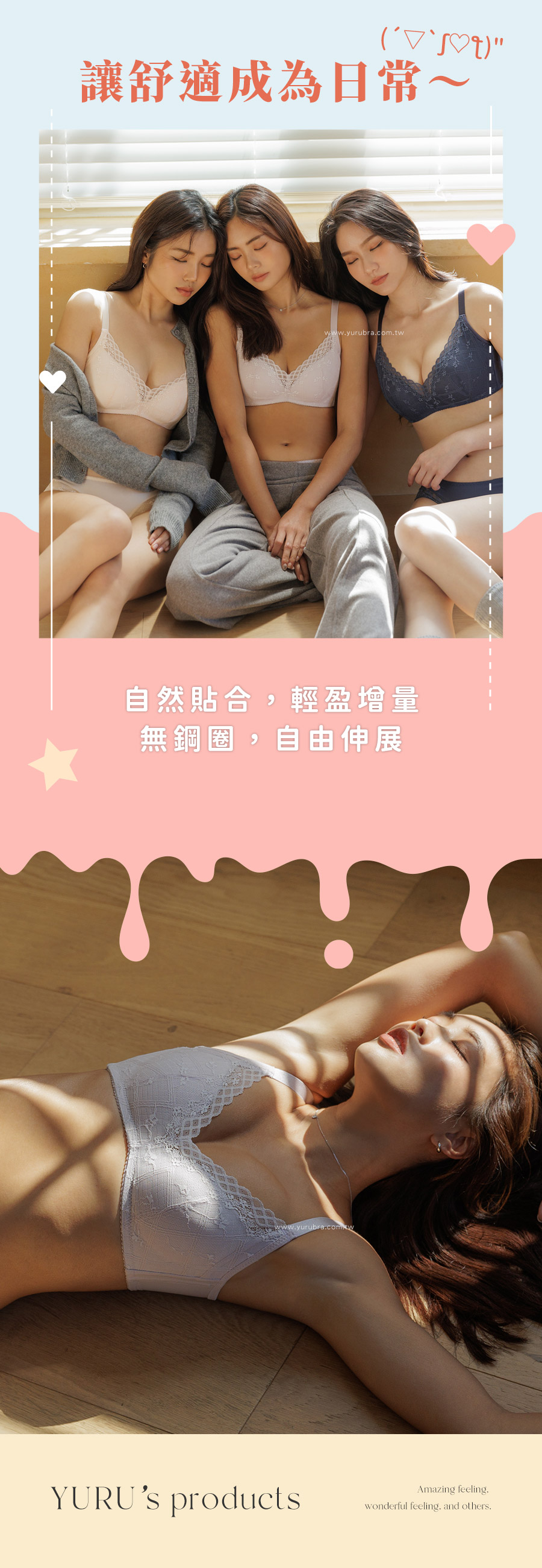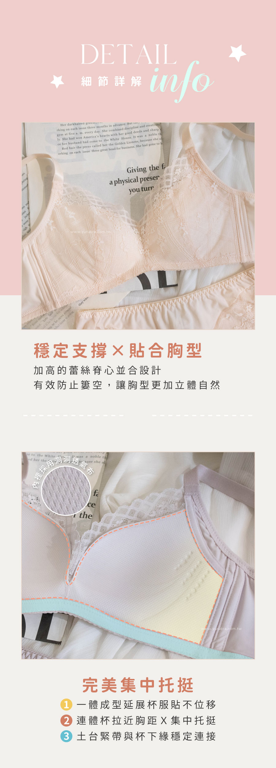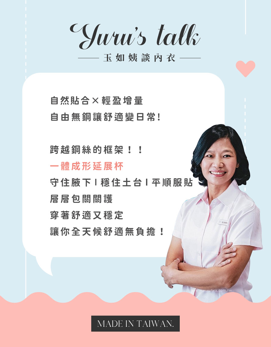 ★自然貼合,輕盈增量,無鋼自由,讓舒適變成日常 ★無鋼圈×雲Q綿,溫柔托胸,輕薄不厚重 ★杯模漸進式下厚上薄設計,減少簍空更飽滿