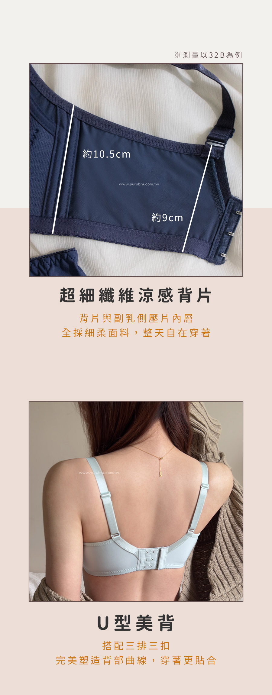 A罩(下圍32-36)、B罩(下圍32-34)、C罩(下圍32):Q綿杯下厚約2公分 B罩(下圍36)、C罩(下圍34):Q綿杯下厚約1.5公分 B罩(下圍38)、C罩(下圍36-38):Q綿杯下厚約1公分