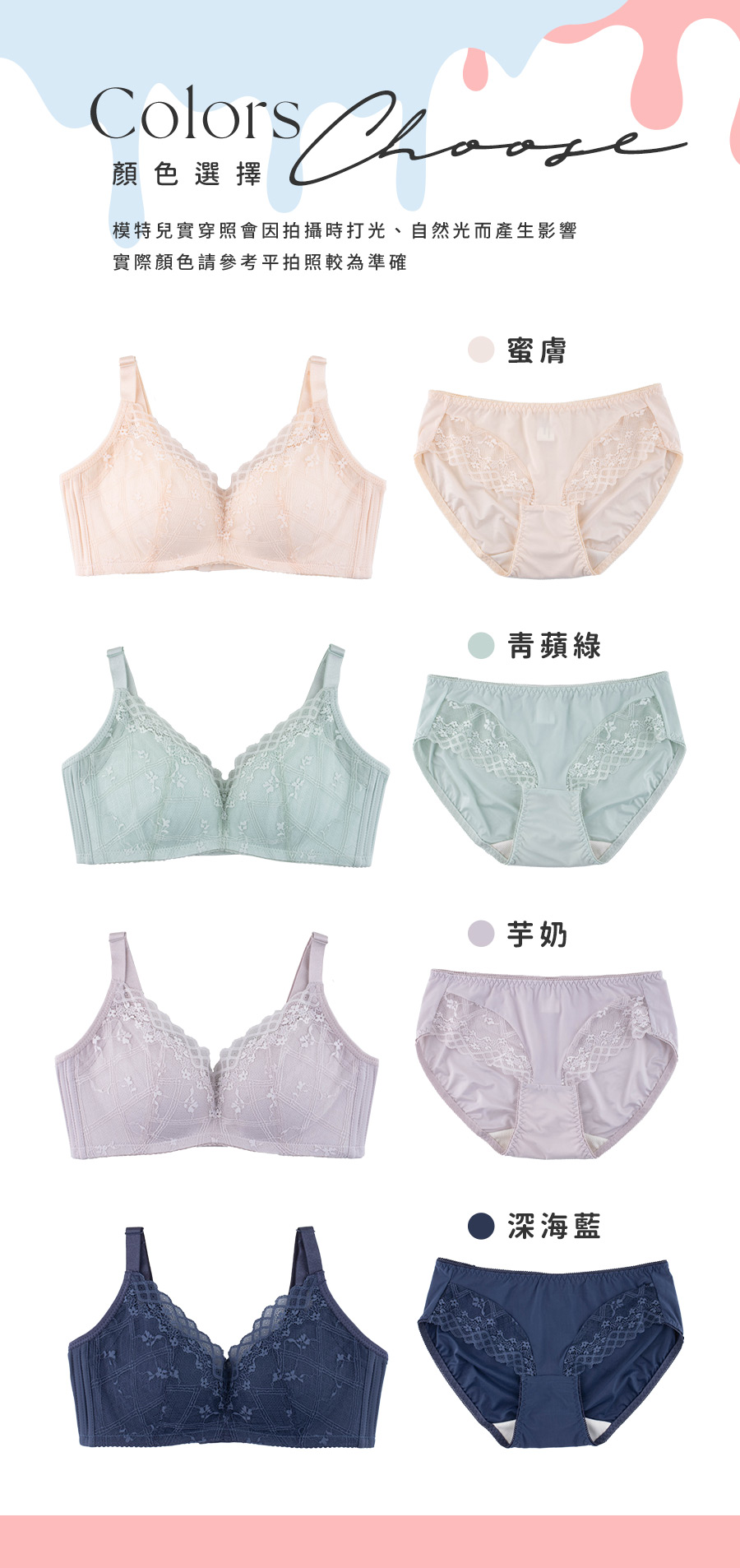 | BRA802 | 泡沫戀曲內衣 | 深海藍,青蘋綠,芋奶,蜜膚 |