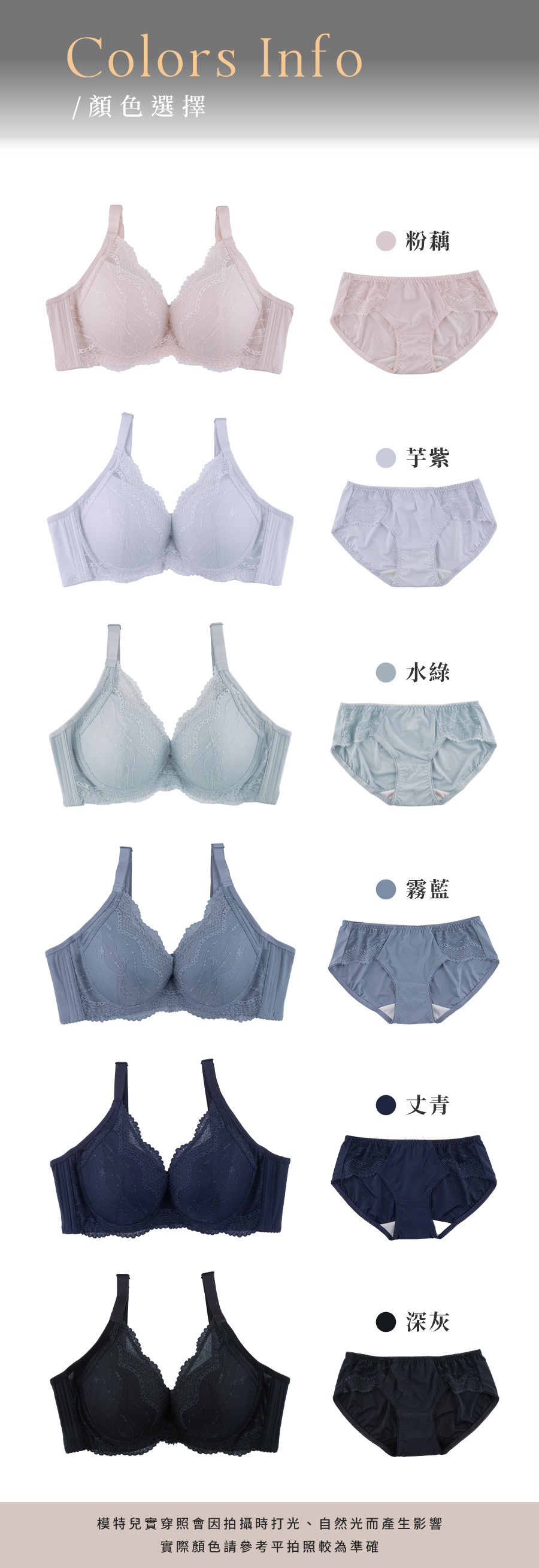 | BRA803 | 精靈交響內衣 | 粉藕,芋紫,霧藍,丈青,水綠,深灰 |
