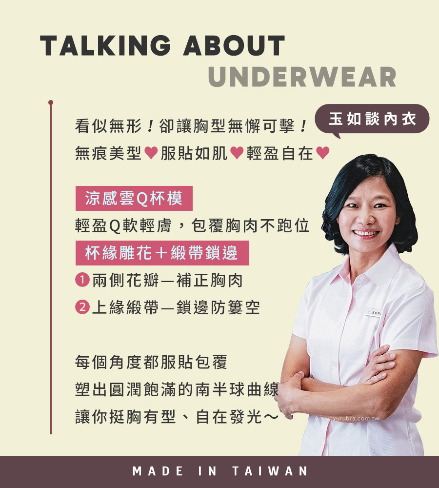 ★涼感親膚細緻表布,外搭俐落不顯痕,夏天穿也清爽 ★3/4罩J型軟鋼圈,穩定撐托,服貼又輕盈 ★雲Q綿立體杯,穿出自然又有精神的胸型 ★杯模上下浮凸設計,減少簍空更飽滿 ★下厚上薄杯模如雲朵般Q軟,貼合不空、不壓胸型 ★副乳側壓片,向上延伸+集中導正,找回流失曲線, ★雙層柔細涼感背片,撫平肉肉兼具舒適感 ★腋下雙併膠條,穩定側邊不走位 ★U型美背+三排三扣設計,穩定並修飾後背肉肉 ★台灣製造,品質保證