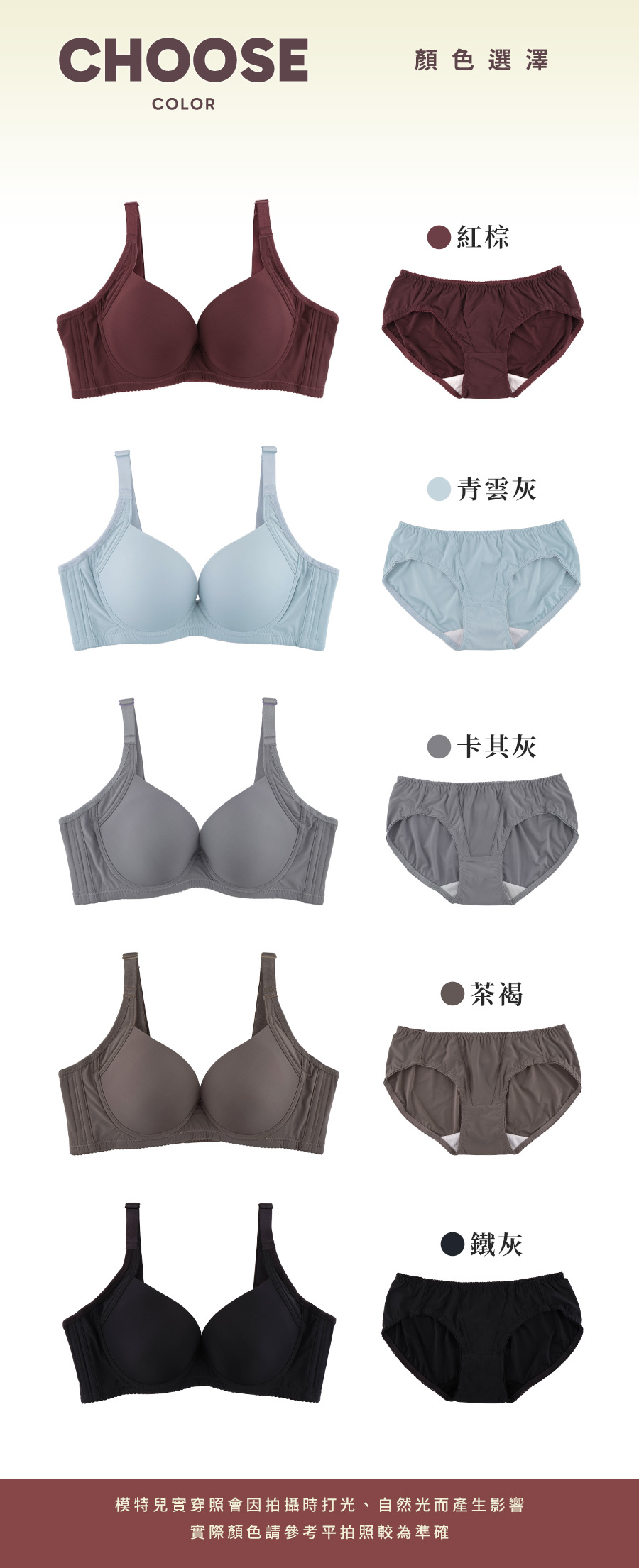 | BRA807 | 無聲共鳴內衣 | 茶褐,鐵灰,青雲灰,卡其灰,紅棕 |